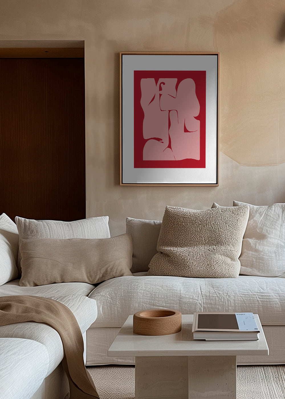 Beautiful poster from the geometric wall art and prints series, an original by Nordic Creators, with shades of red, and in vertical position. The abstract, geometric shapes help create a casual, creative setting. A modern touch for your home. This piece includes a white strip framing the design to boost its style.