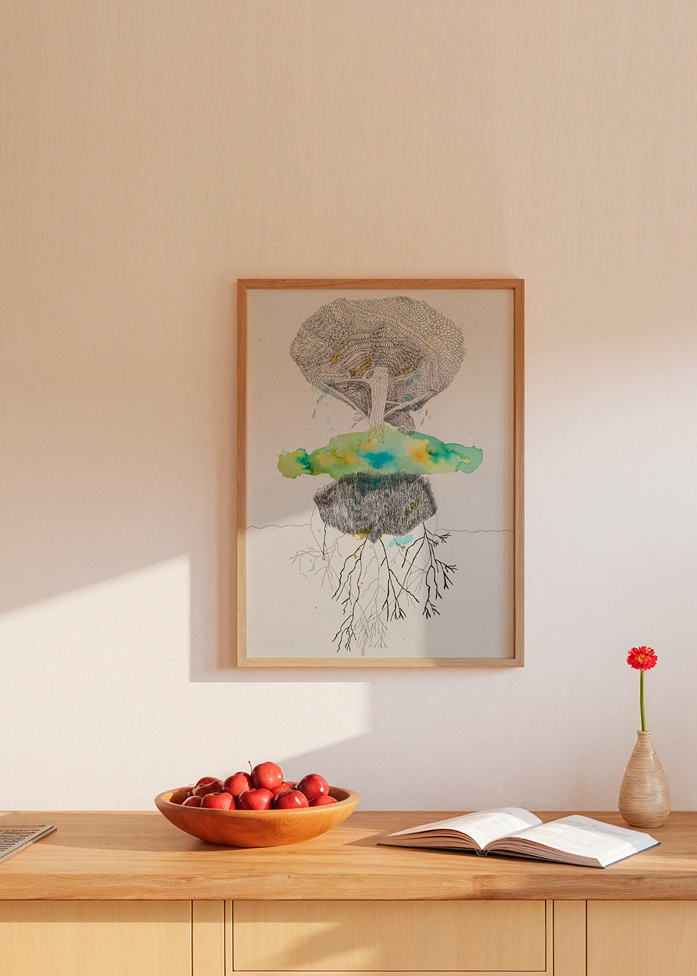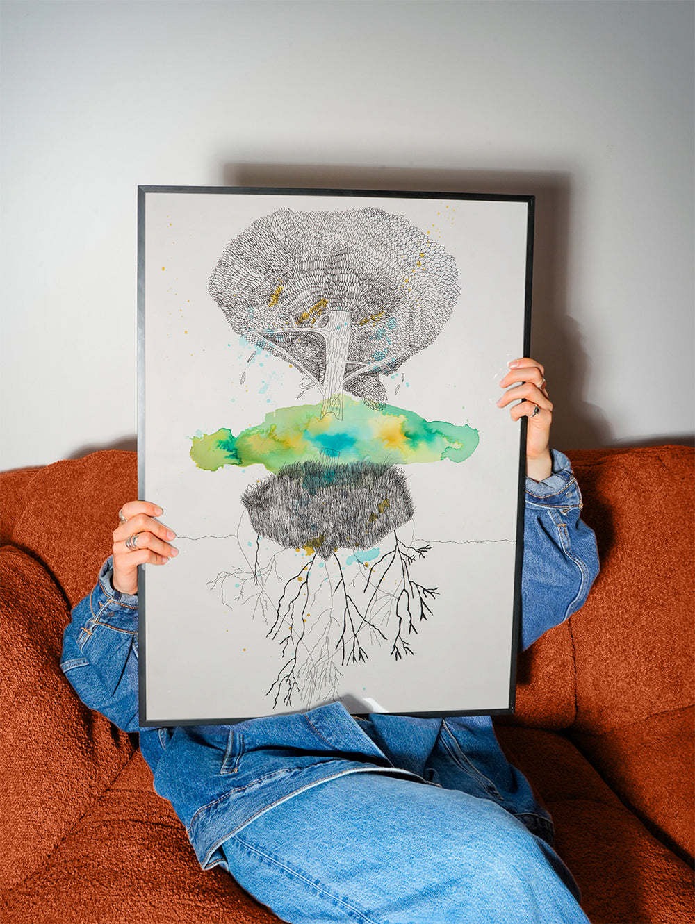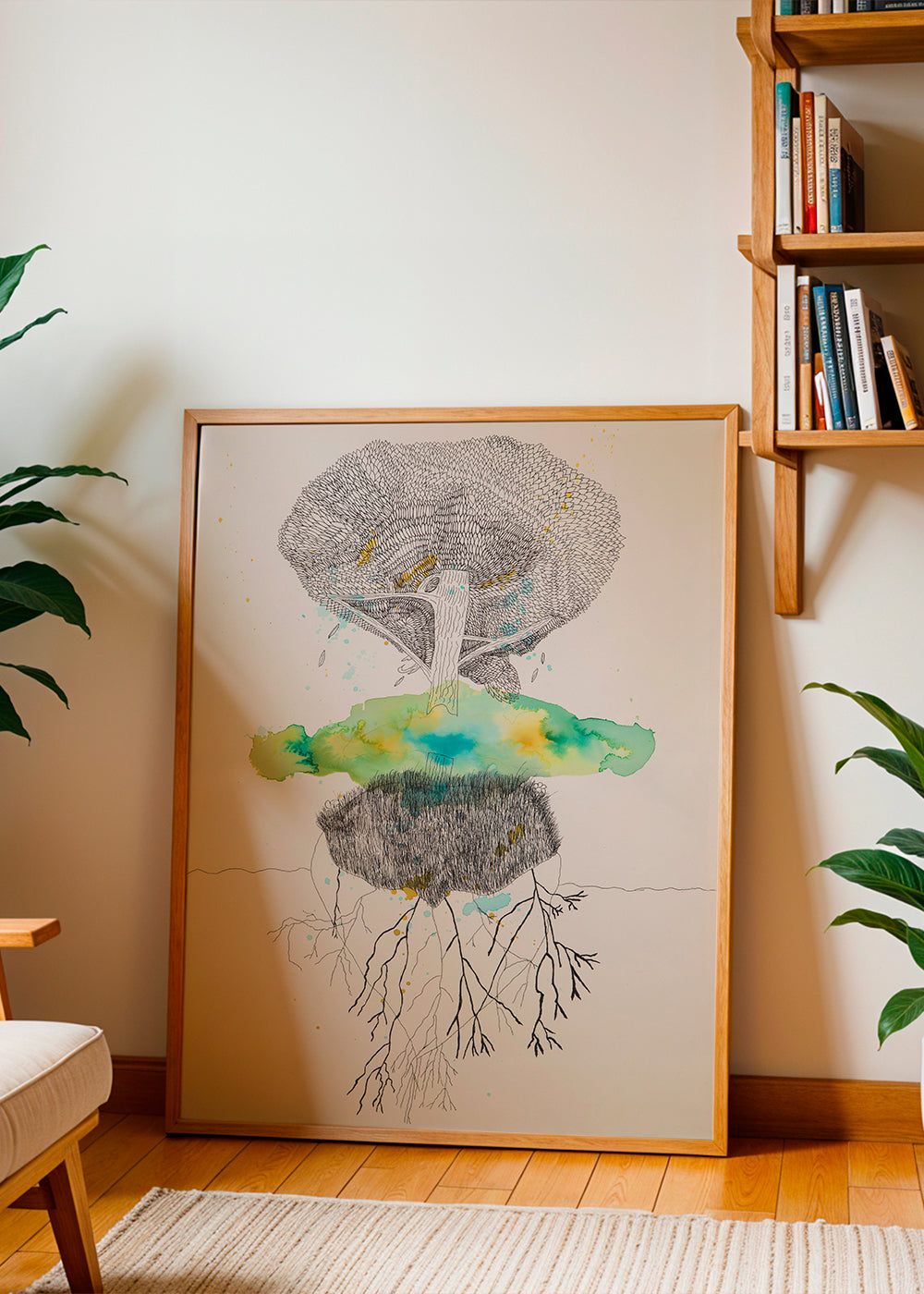 Beautiful print inspired by the collection of illustration wall art, created by Fundació Setba, with tones of green, and perfect to hang vertically. A perfect piece for spaces bursting with art and creativity. Our drawings are perfect for decorating empty or boring spaces. Refresh a whole room by just adding a few posters on the walls.