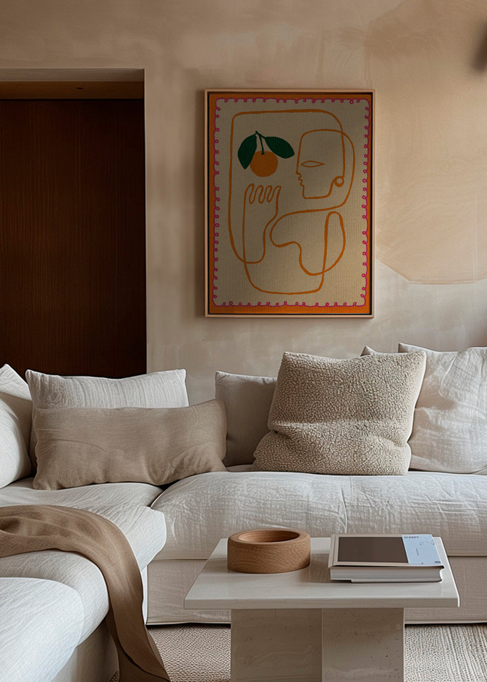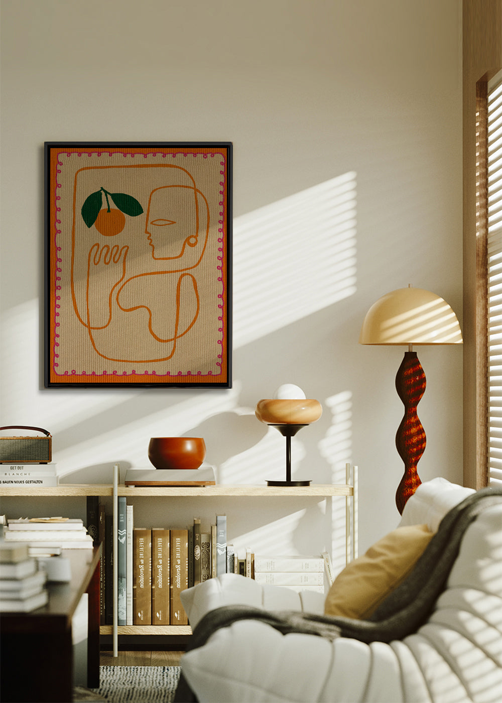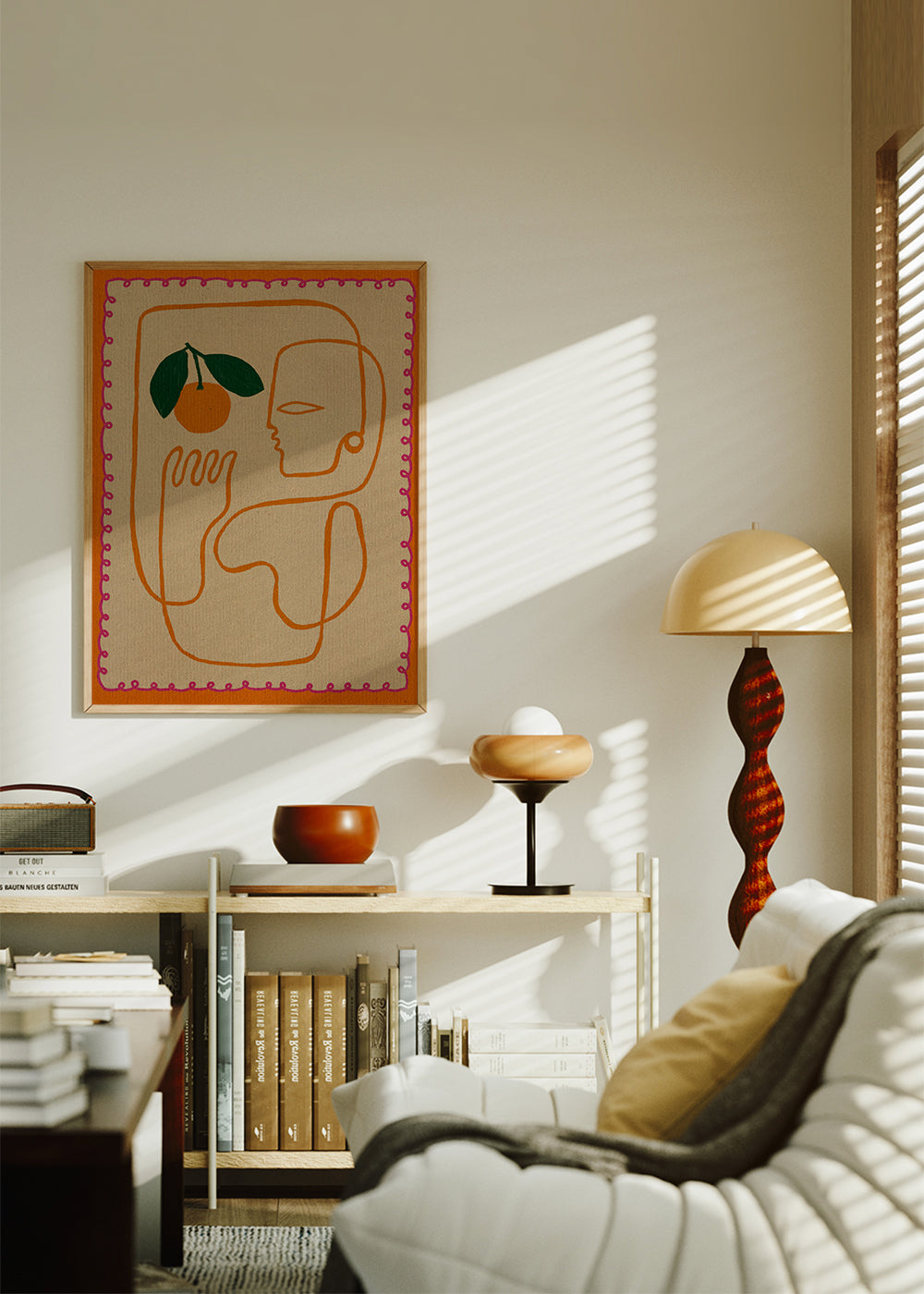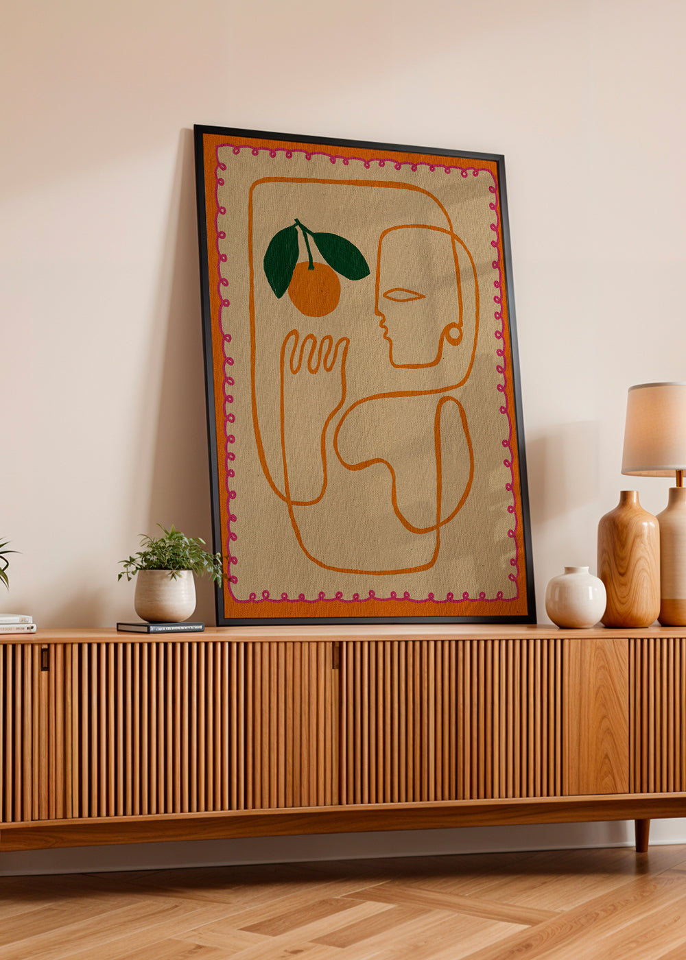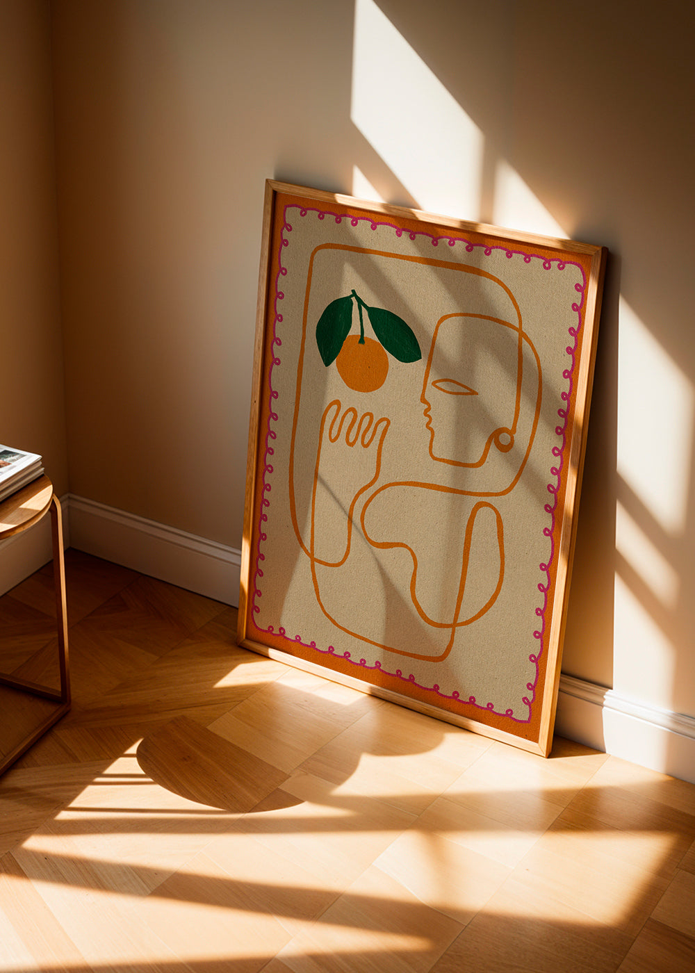 A print from the fruit posters collection, from the collection of the artist Shatha Dafai, with touches of orange, and to hang in vertical position. Abstract prints and paintings make spaces more unique. A new look on your walls can bring a breath of fresh air to all your decor.
