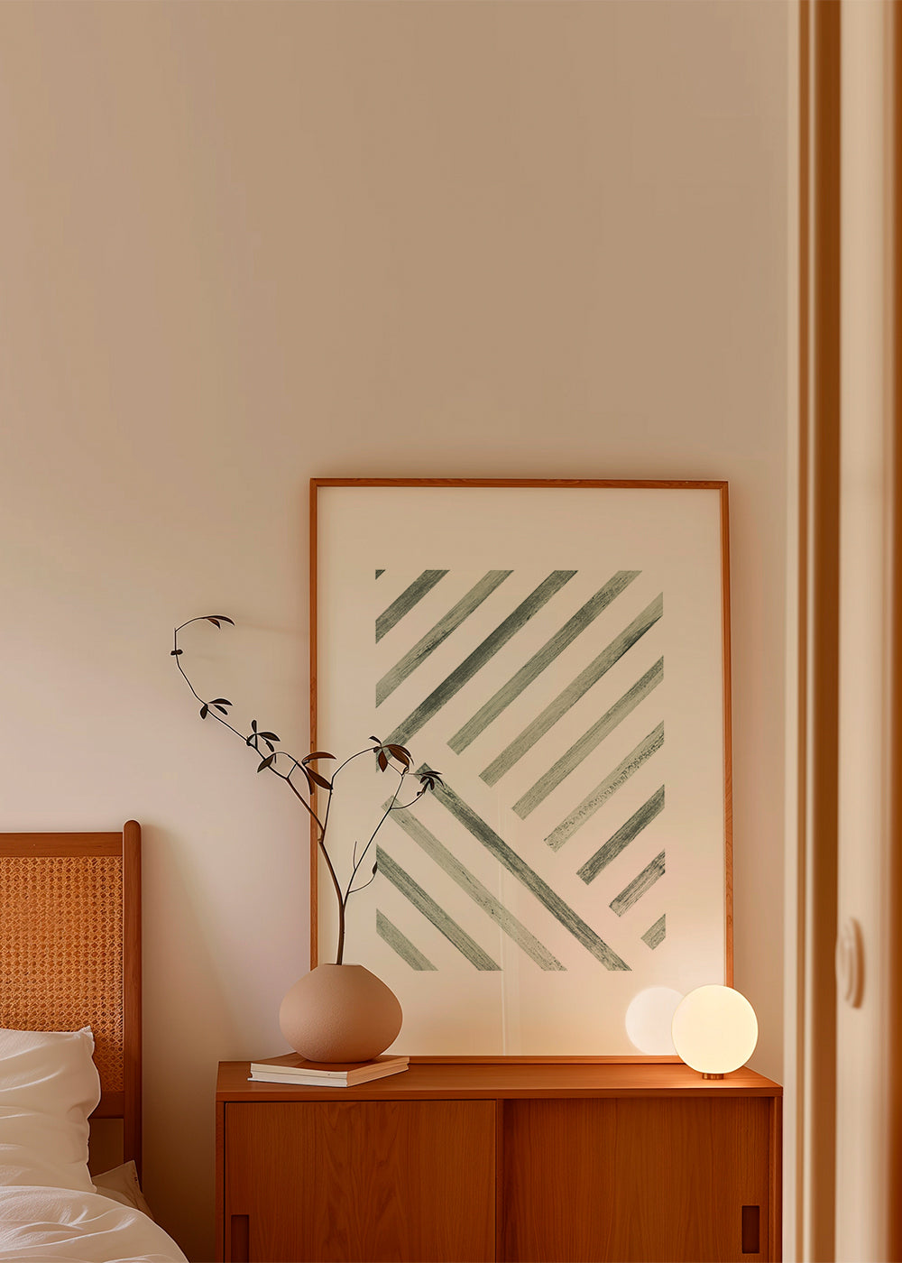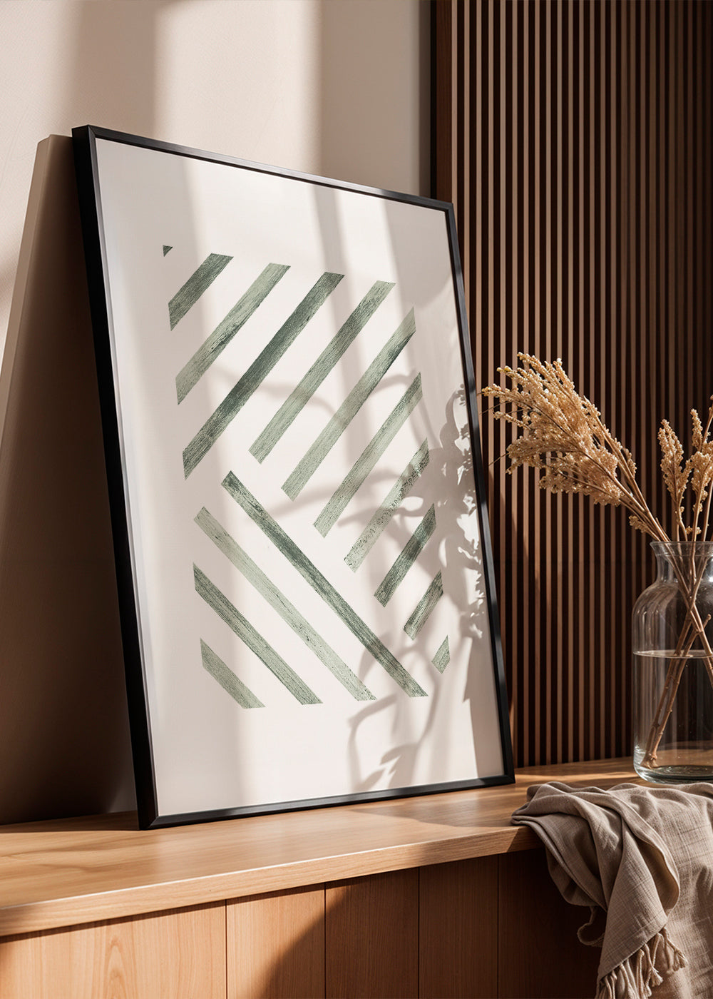 This poster from our line art prints series, by creative artist Bondecco, with green pigments, and facing vertically. The abstract, geometric shapes help create a casual, creative setting. The print your wall has been looking for. This piece includes a white strip framing the design to boost its style.