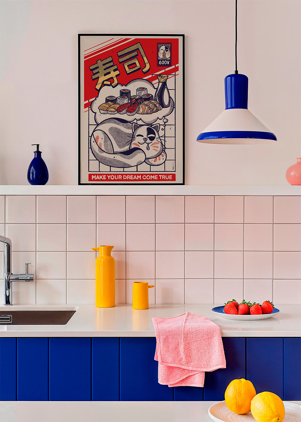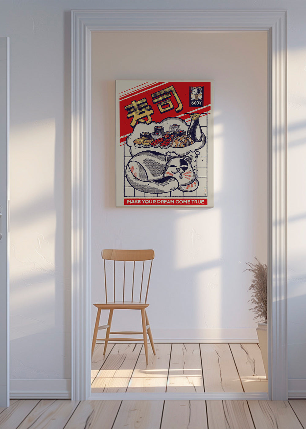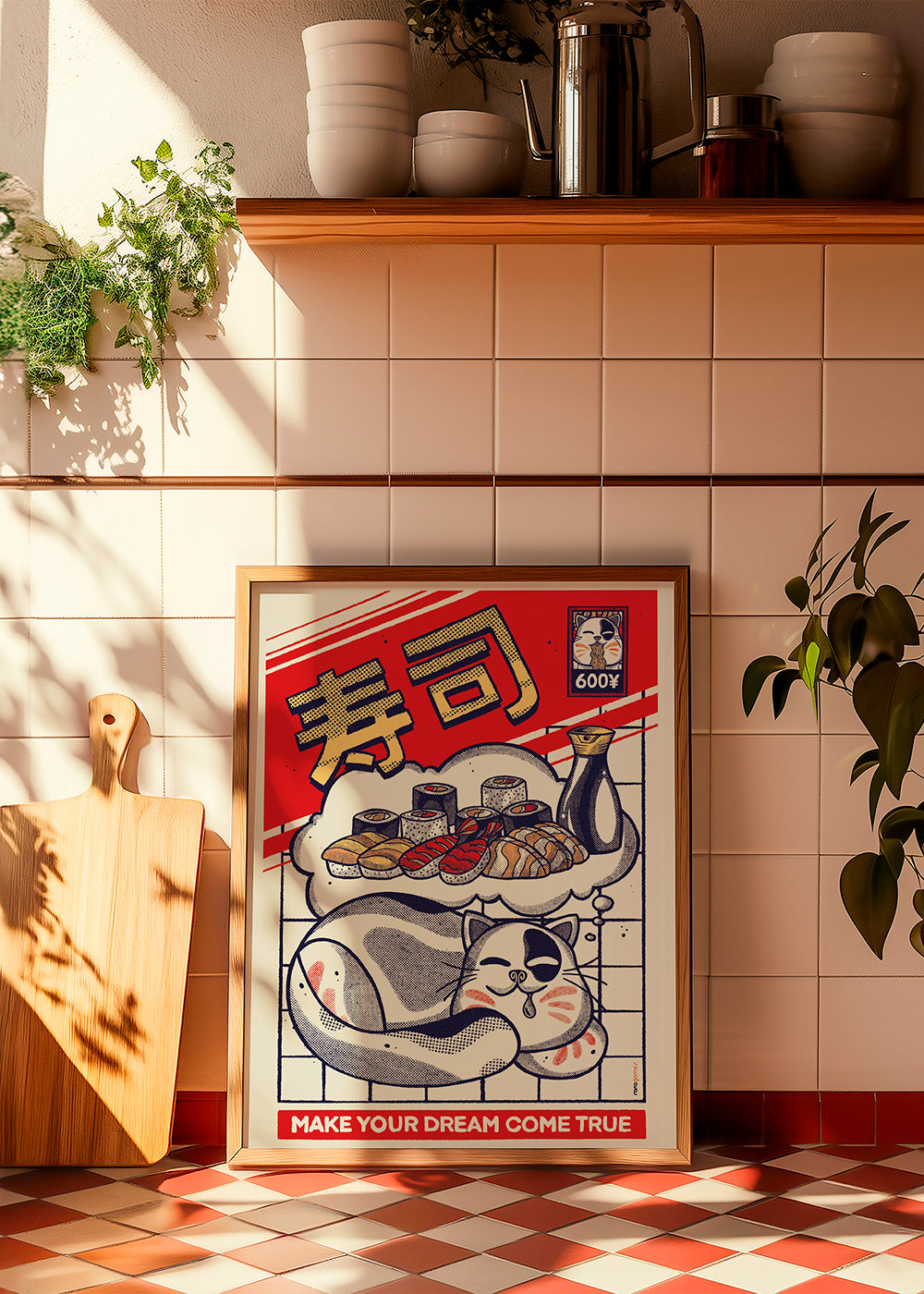 A poster from the japanese wall art series, by Rafa Gomes, with red tones, and perfect to hang vertically. A retro style that is perfect for a vintage look. Fill your walls with prints.