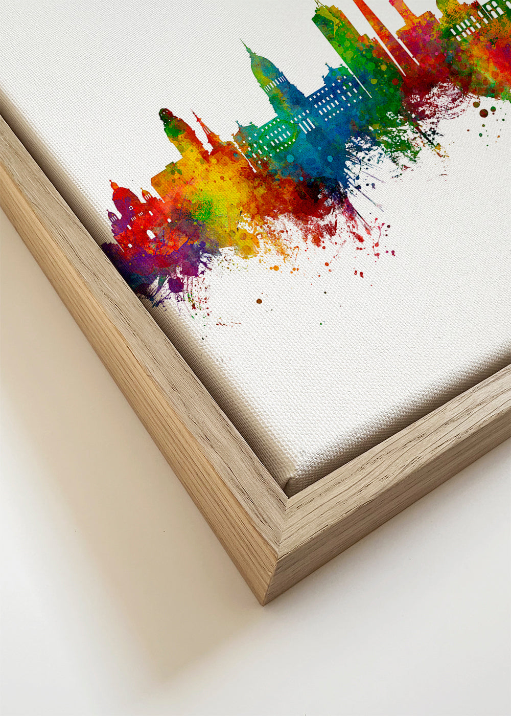 A piece from the skylines canvas series, from the Michael Tompsett collection, with multicolor tones, and facing horizontally. Combine skylines, photos and city maps to create a composition for those with wanderlust. Add a bit of art to your home decor.