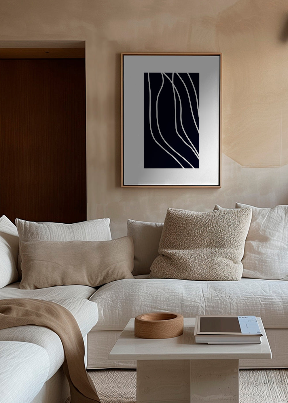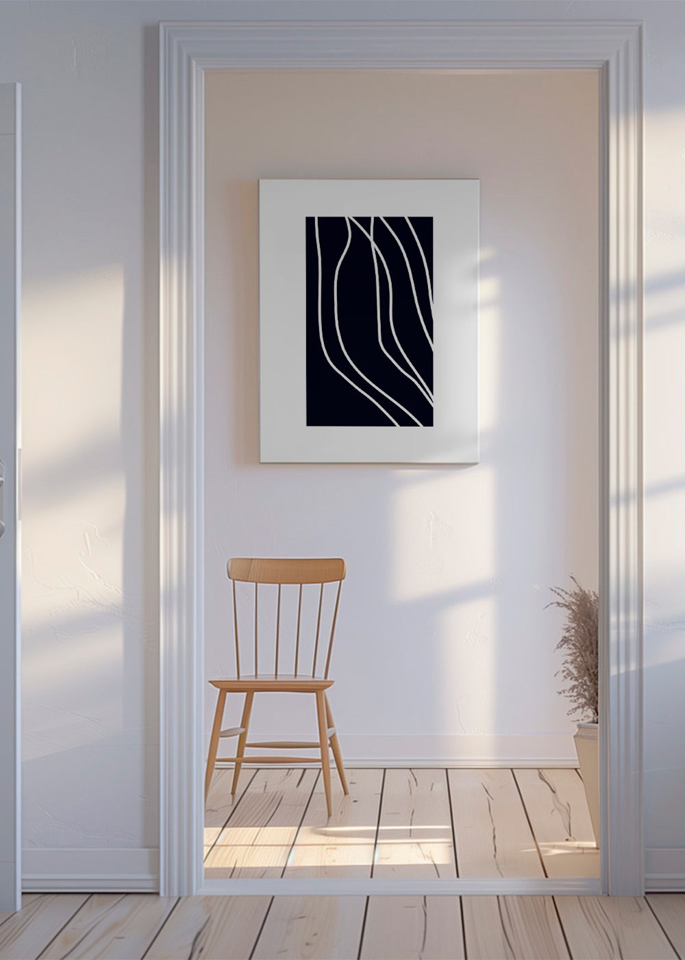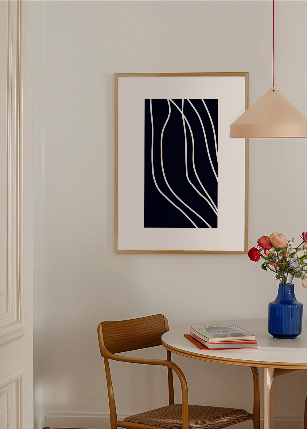 Beautiful piece from our repertoire of line art prints, by Anna Mainz, with tones of black, and to hang in vertical position. The abstract, geometric shapes help create a casual, creative setting. Give your decor an artistic touch. The white strip around the piece enhances its expressiveness.