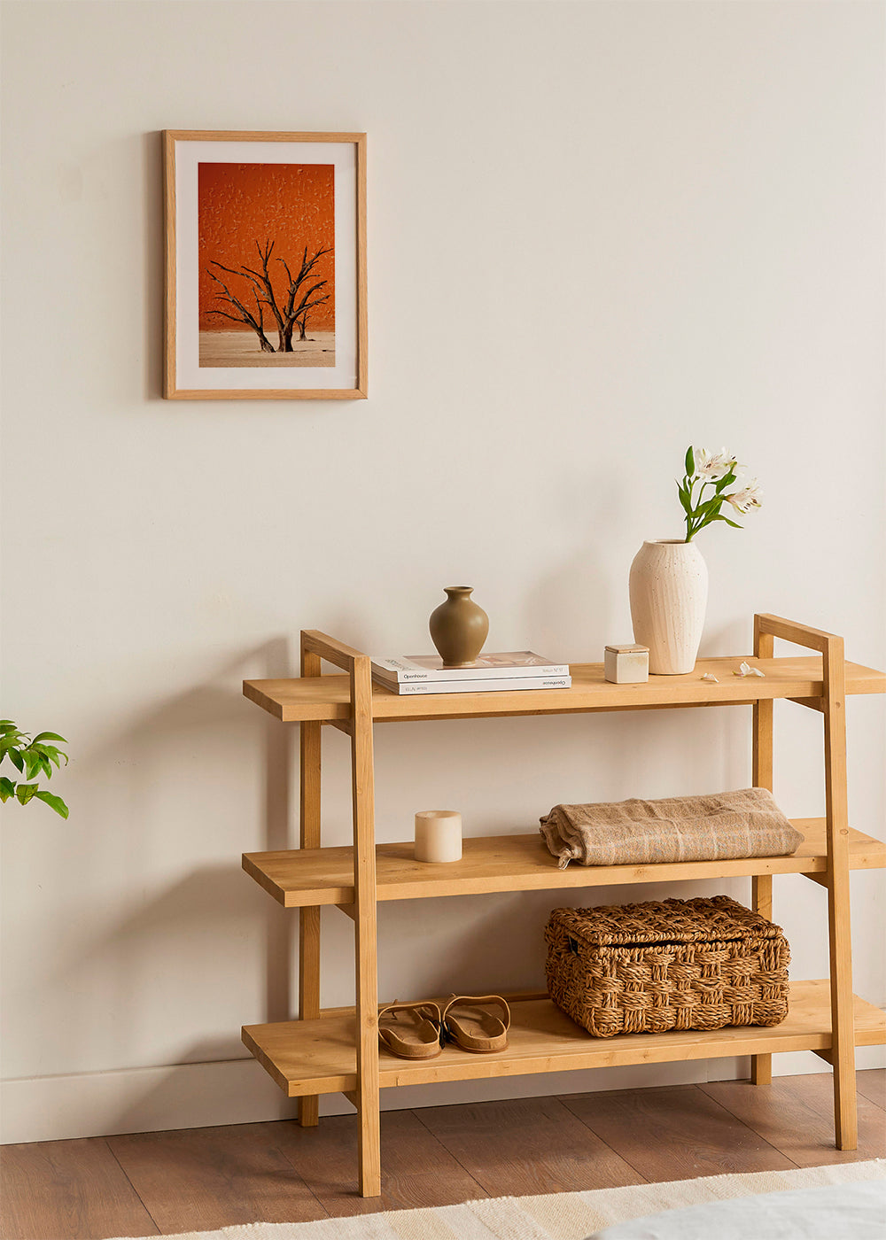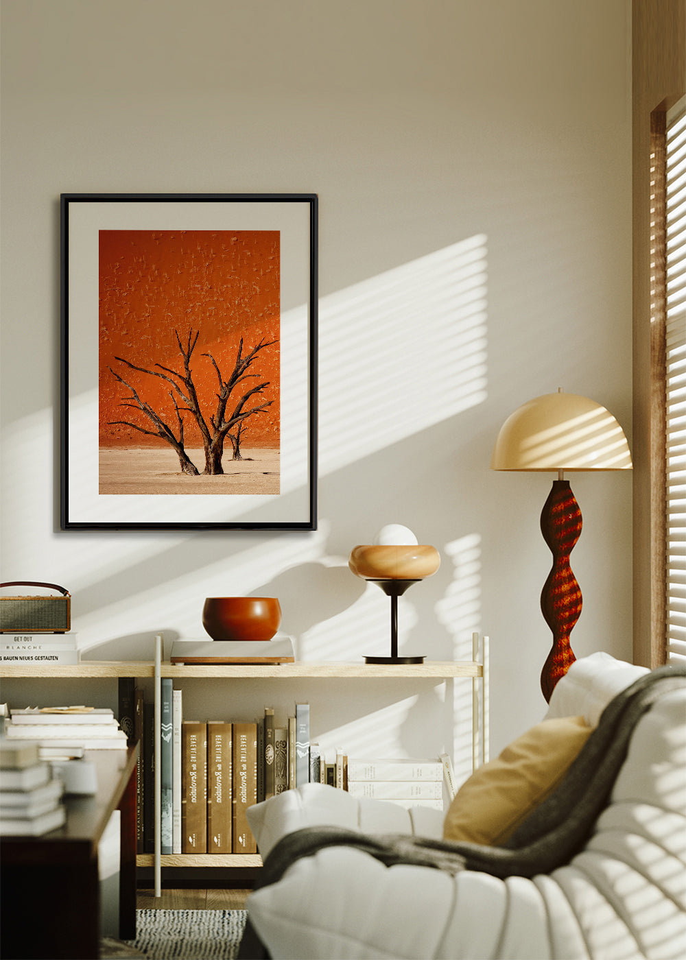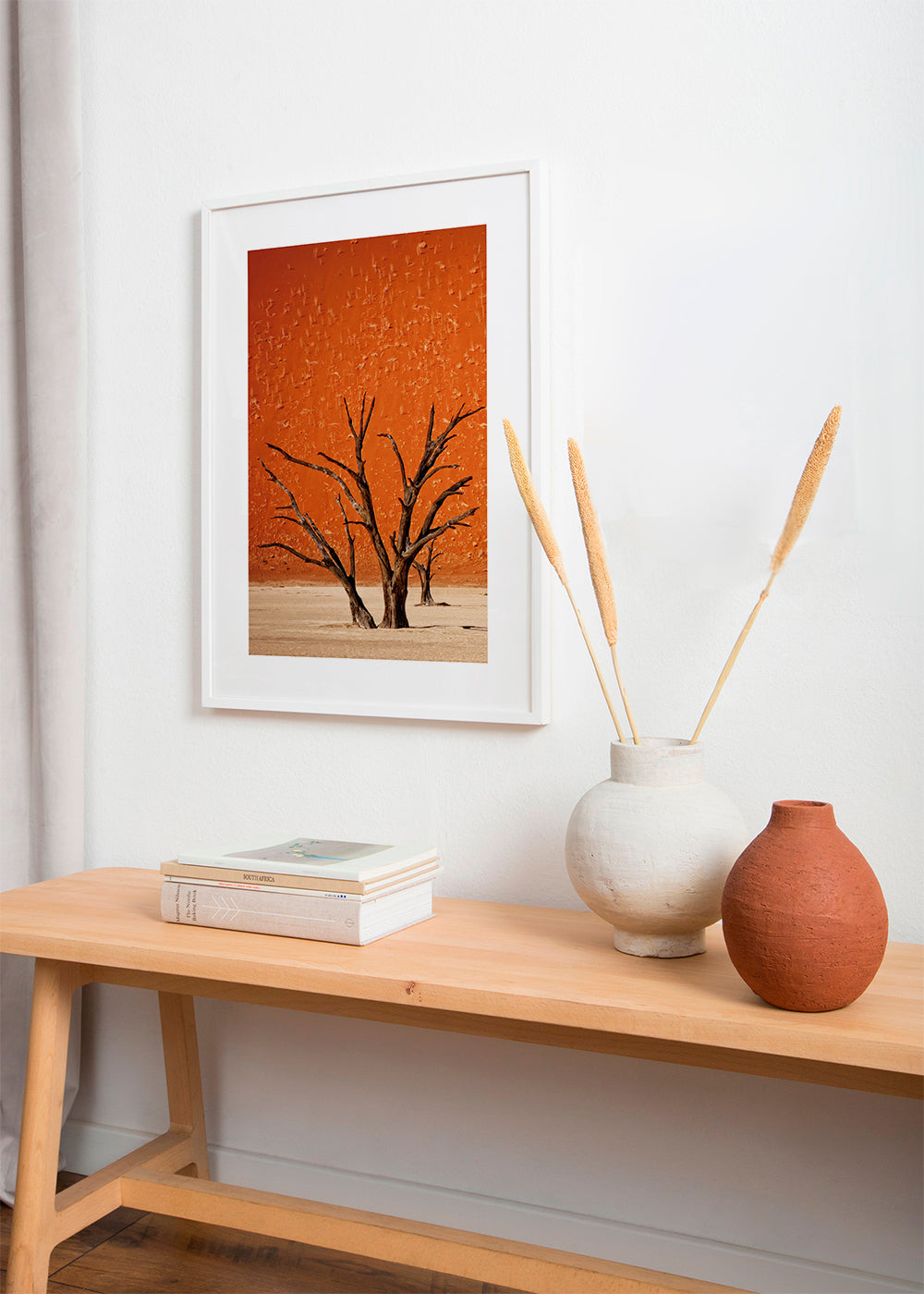 A print in the style of our cactus wall art, with shades of orange, and in vertical position. Landscape decoration brings a breath of fresh air to any room. There are no ugly or beautiful walls, just empty or full ones. This piece includes a white strip framing the design to boost its style.