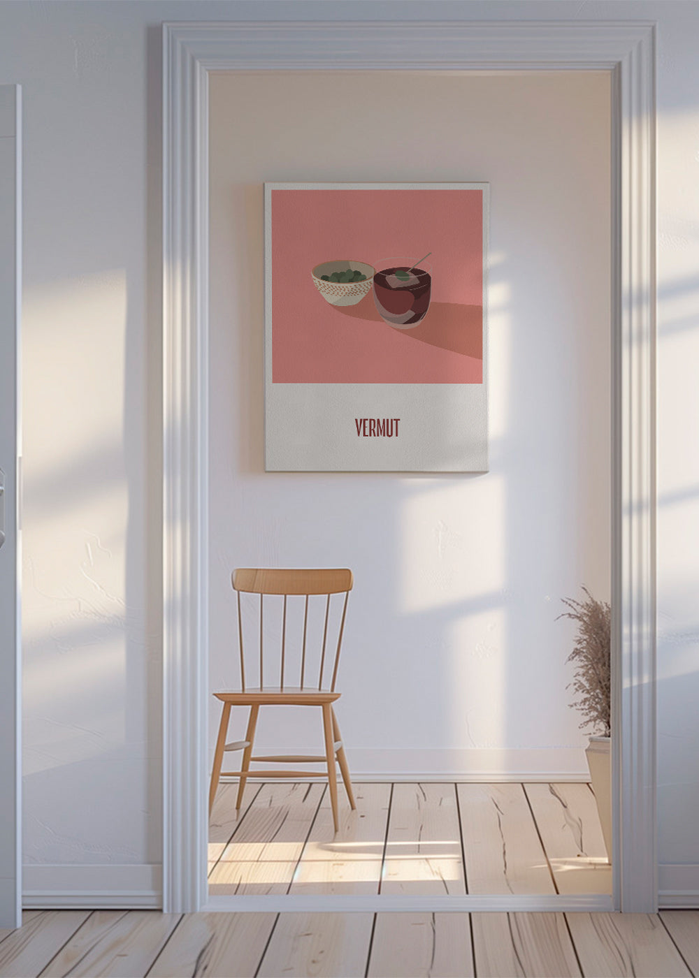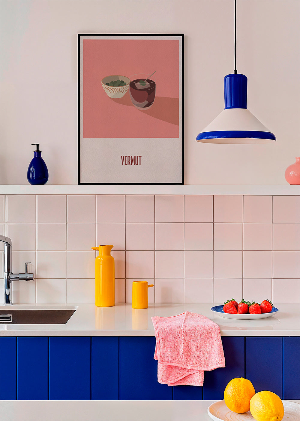 Beautiful poster from the cocktail posters collection, made by Nerea Ramírez, with touches of orange, and perfect to hang vertically. Prints for the kitchen are a perfect decorative element for such a cosy space. Walls full of creativity.