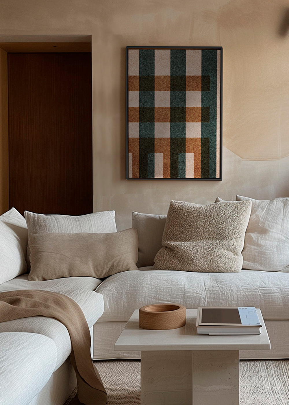 A poster in the style of our geometric wall art and prints, made by Daniel Coulmann, with tones of green, and with vertical layout. The abstract, geometric shapes help create a casual, creative setting. Refresh a whole room by just adding a few posters on the walls.