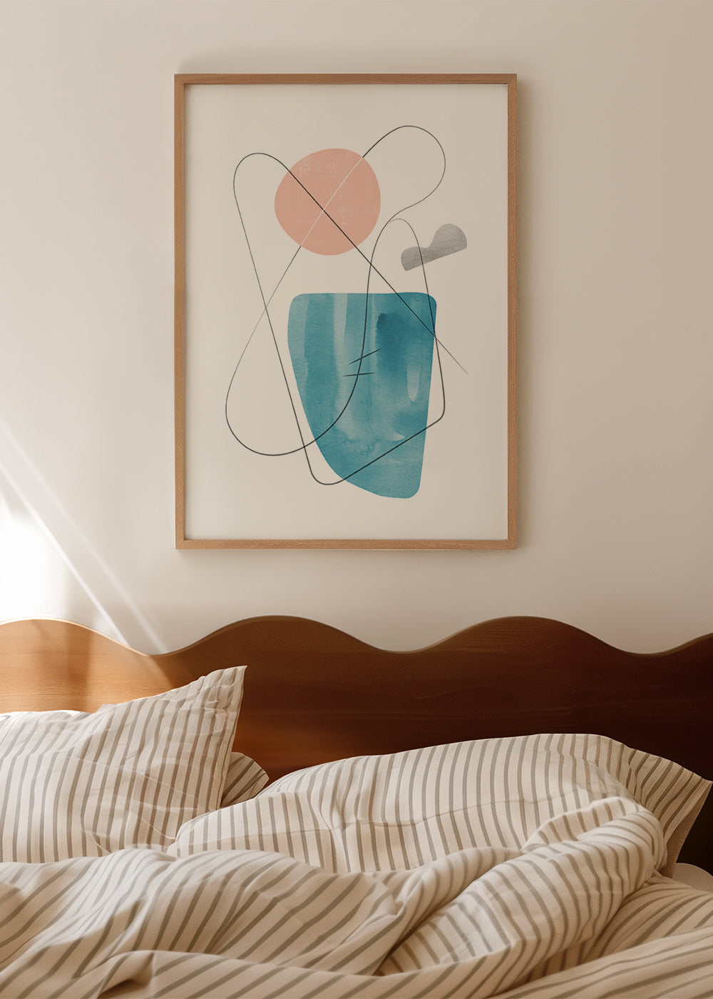 A print inspired by the collection of geometric wall art and prints, from the Nouveau Prints collection, with blue pigments, and vertical layout. The abstract, geometric shapes help create a casual, creative setting. Let your walls tell a story.