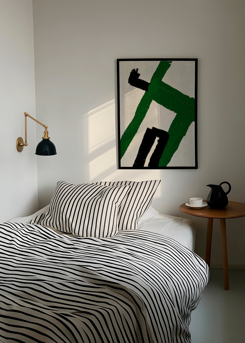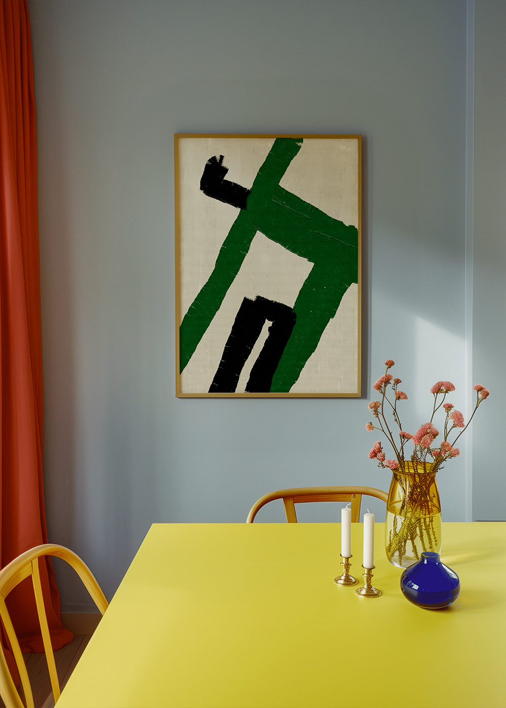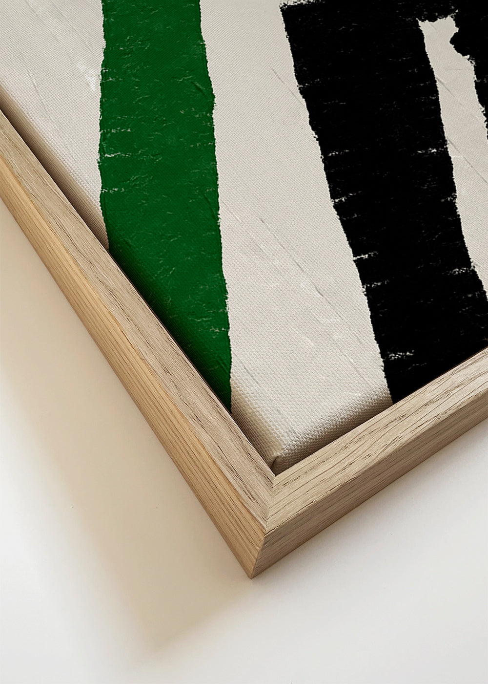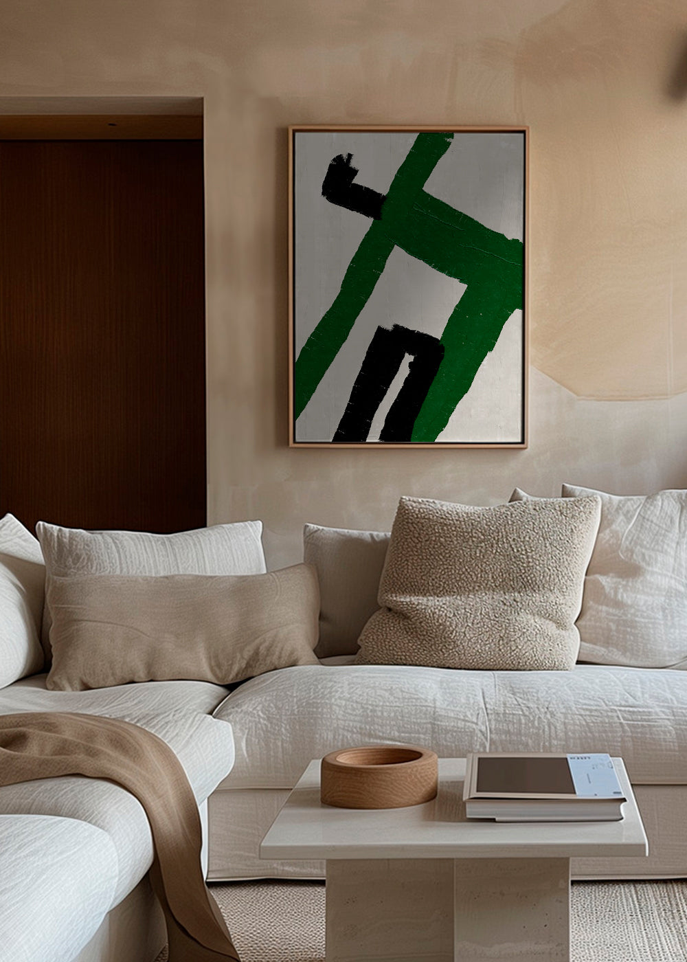 A piece from the geometric wall art and prints series, by creative artist 1x, with touches of green, and vertical layout. The abstract, geometric shapes help create a casual, creative setting. A modern touch for your home.