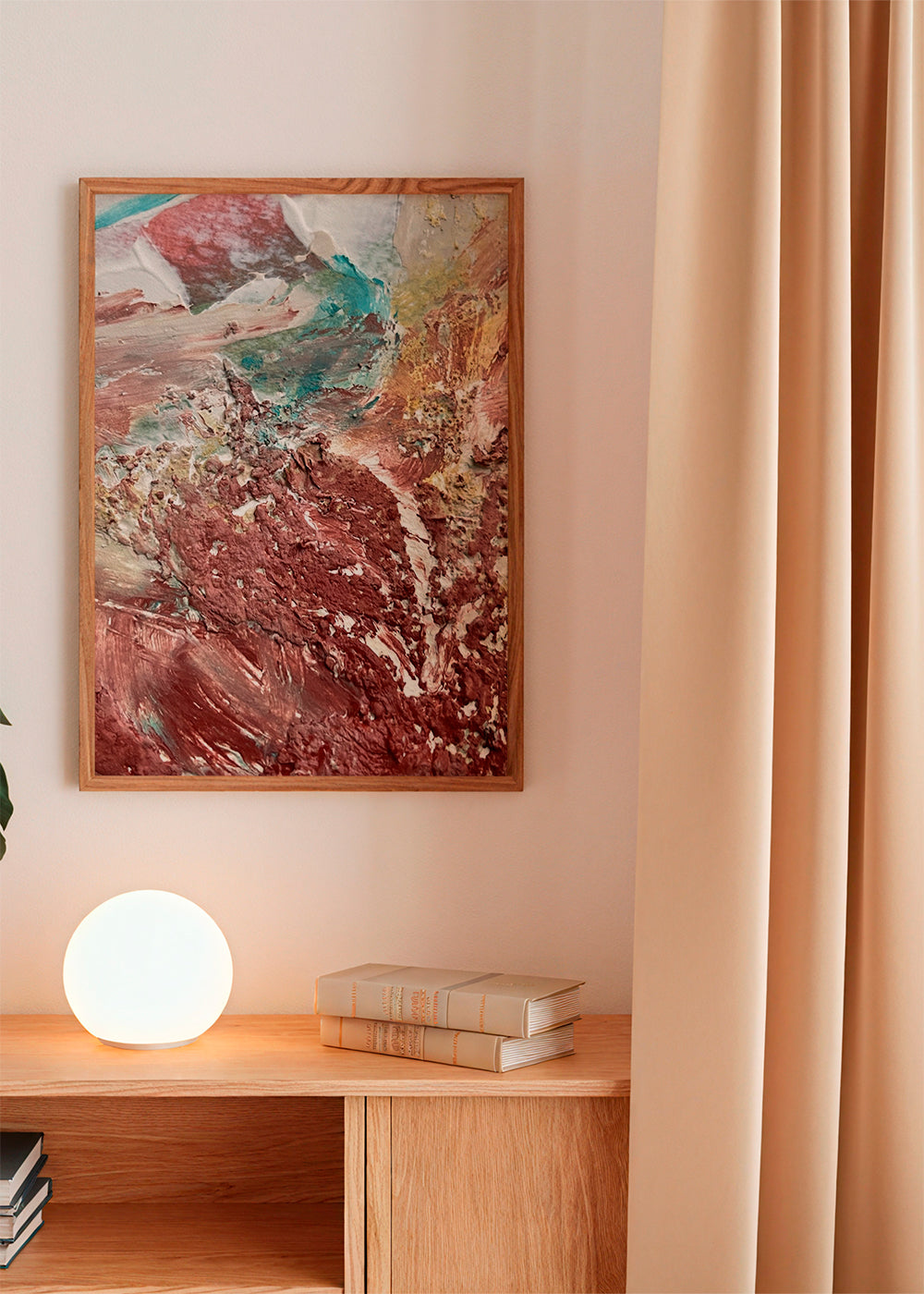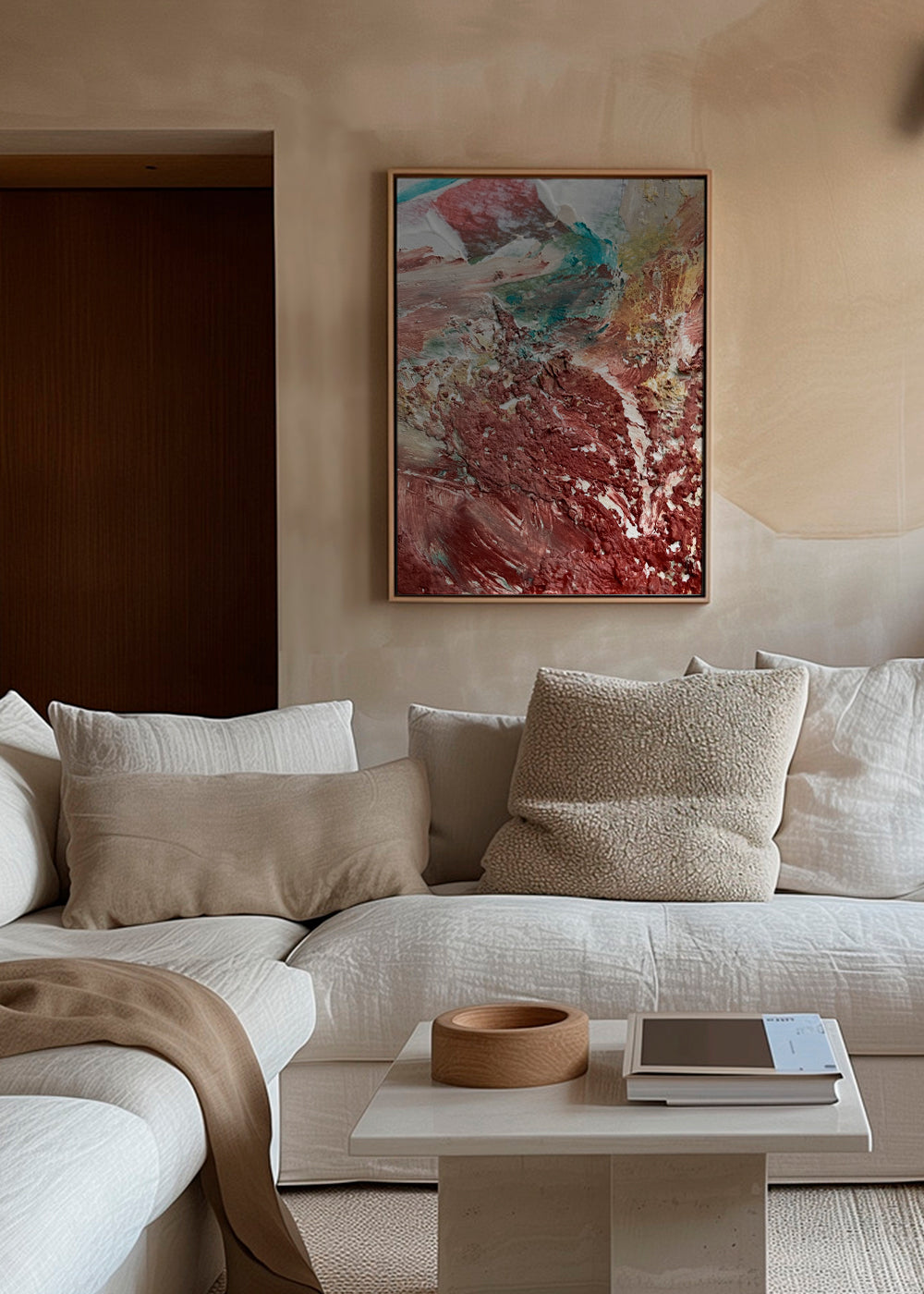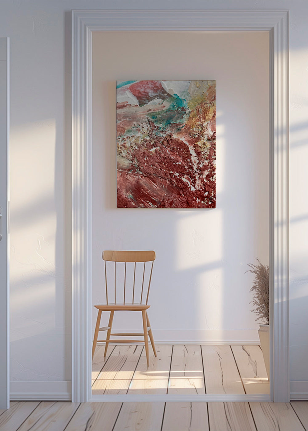 A print from the abstract wall art and prints series, by the artist Elena Camacho Art, with red pigments, and with vertical layout. If you want to add some style and originality to your decor, this abstract design will help give a cutting-edge touch to the walls of your home. A modern touch for your home.