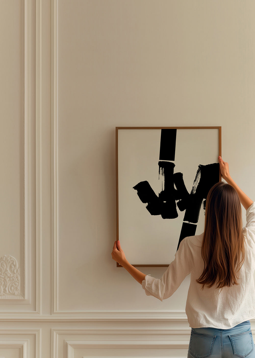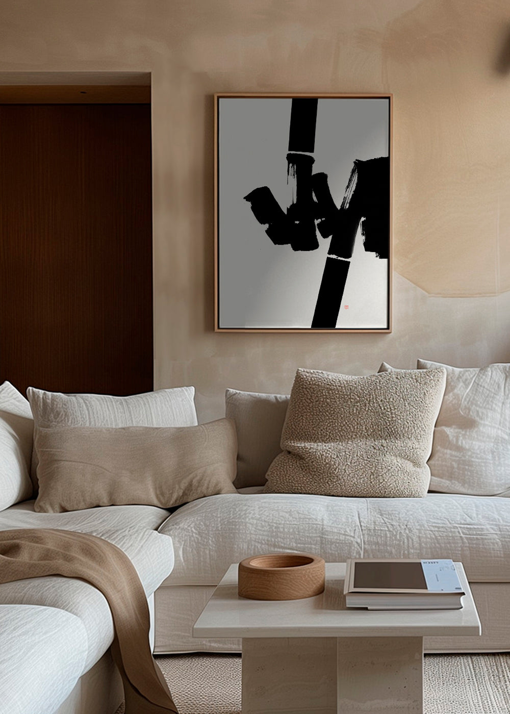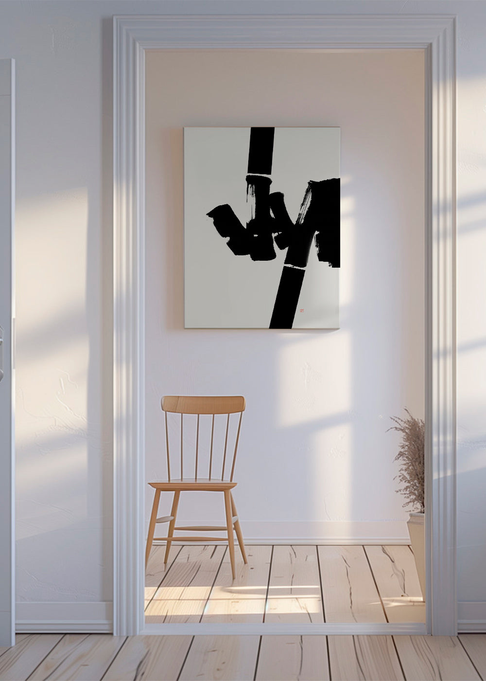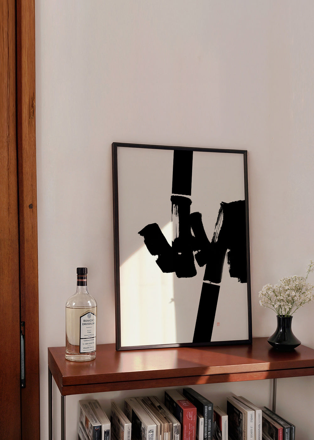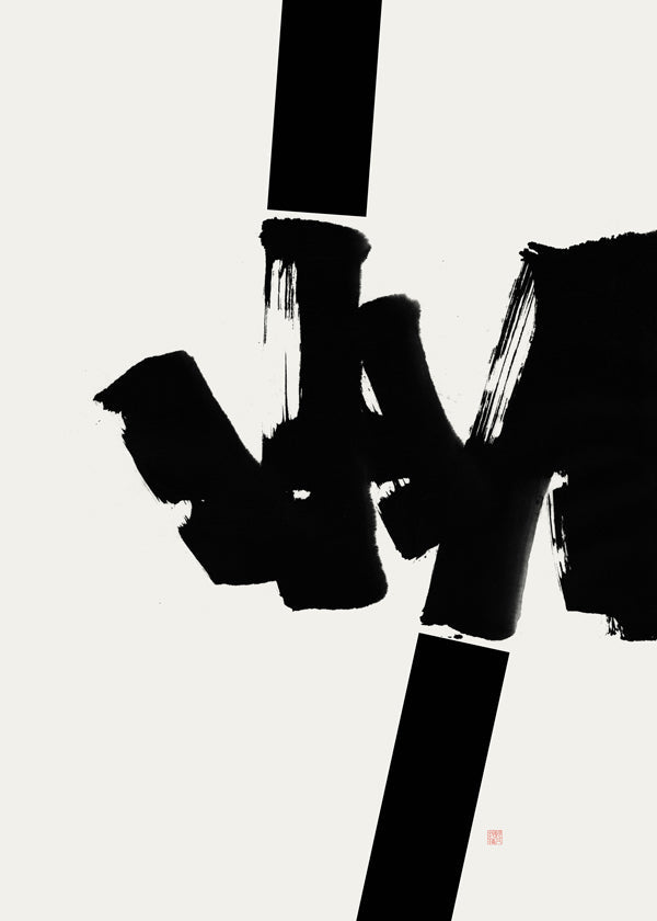 A print from our repertoire of japanese wall art, by Thoth Adan, with tones of black and white, and to hang in vertical position. The abstract, geometric shapes help create a casual, creative setting. Create a one-of-a-kind spot.
