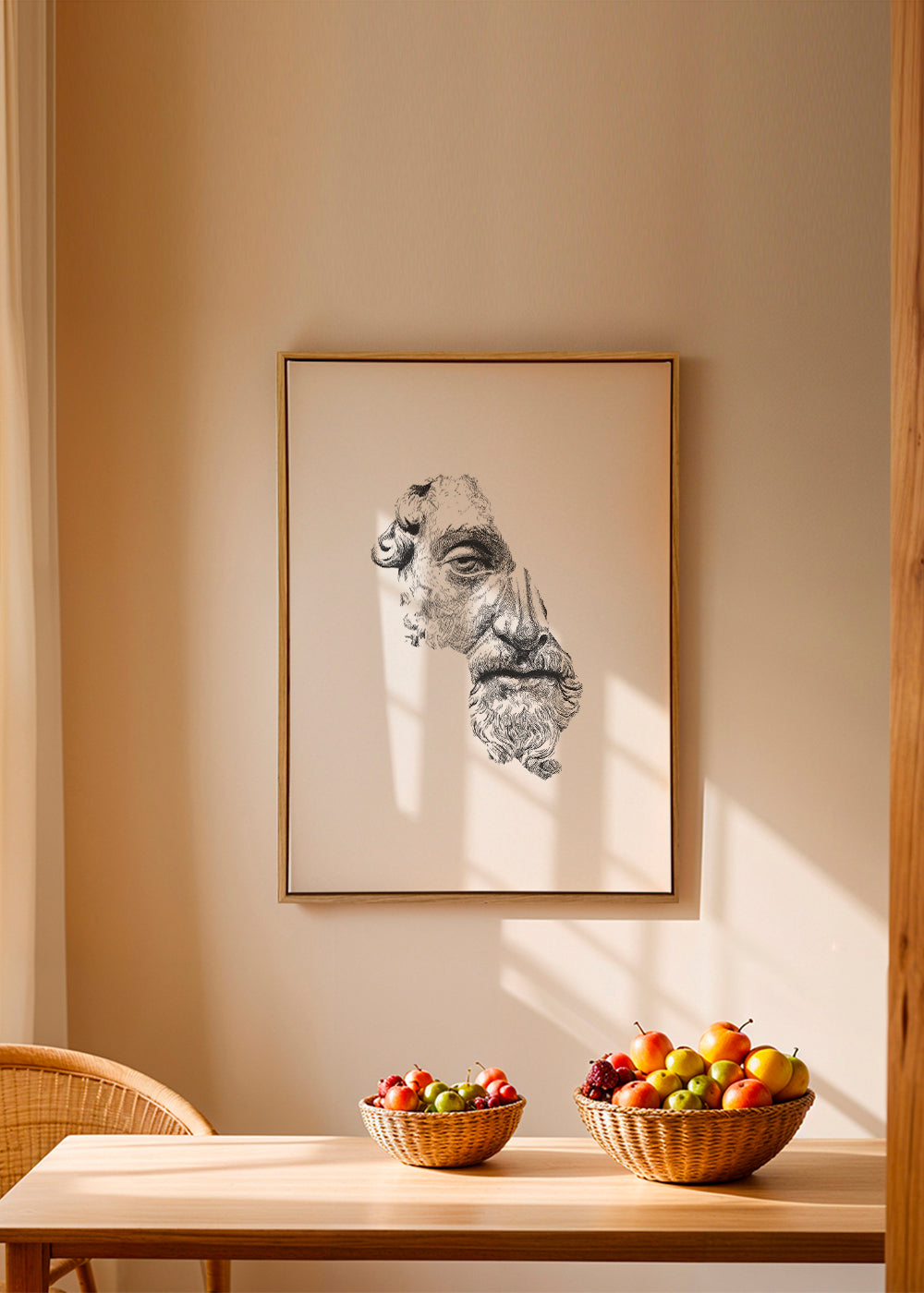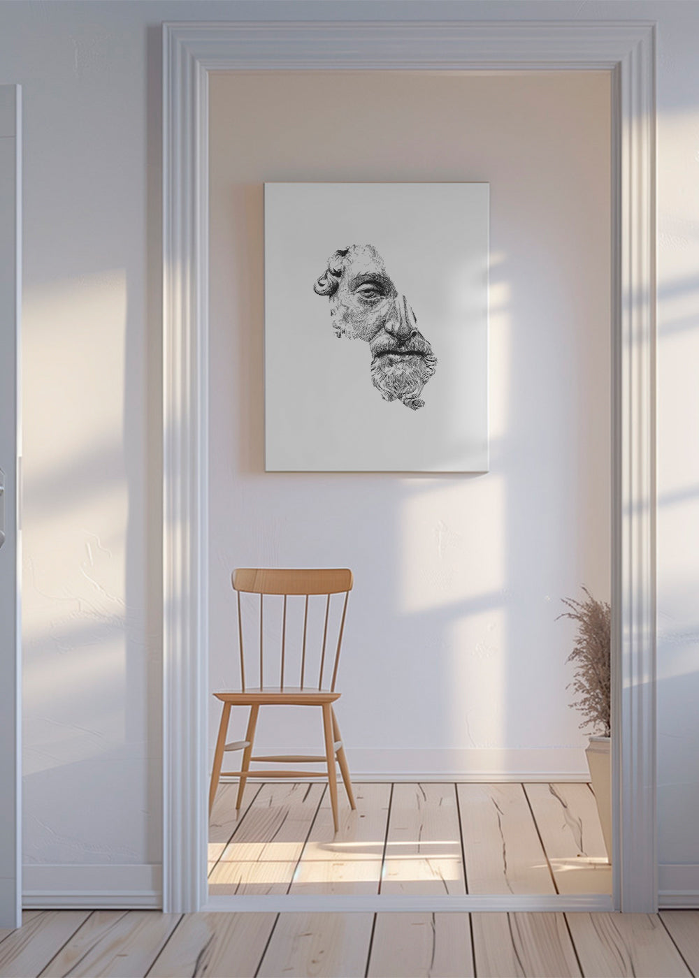 A piece from the portrait faces posters collection, made by Daniel Coulmann, with shades of black and white, and to hang in vertical position. The drawing is simple and clean, so you can pair it with other illustrations for an artistic composition. Let art flood your home.