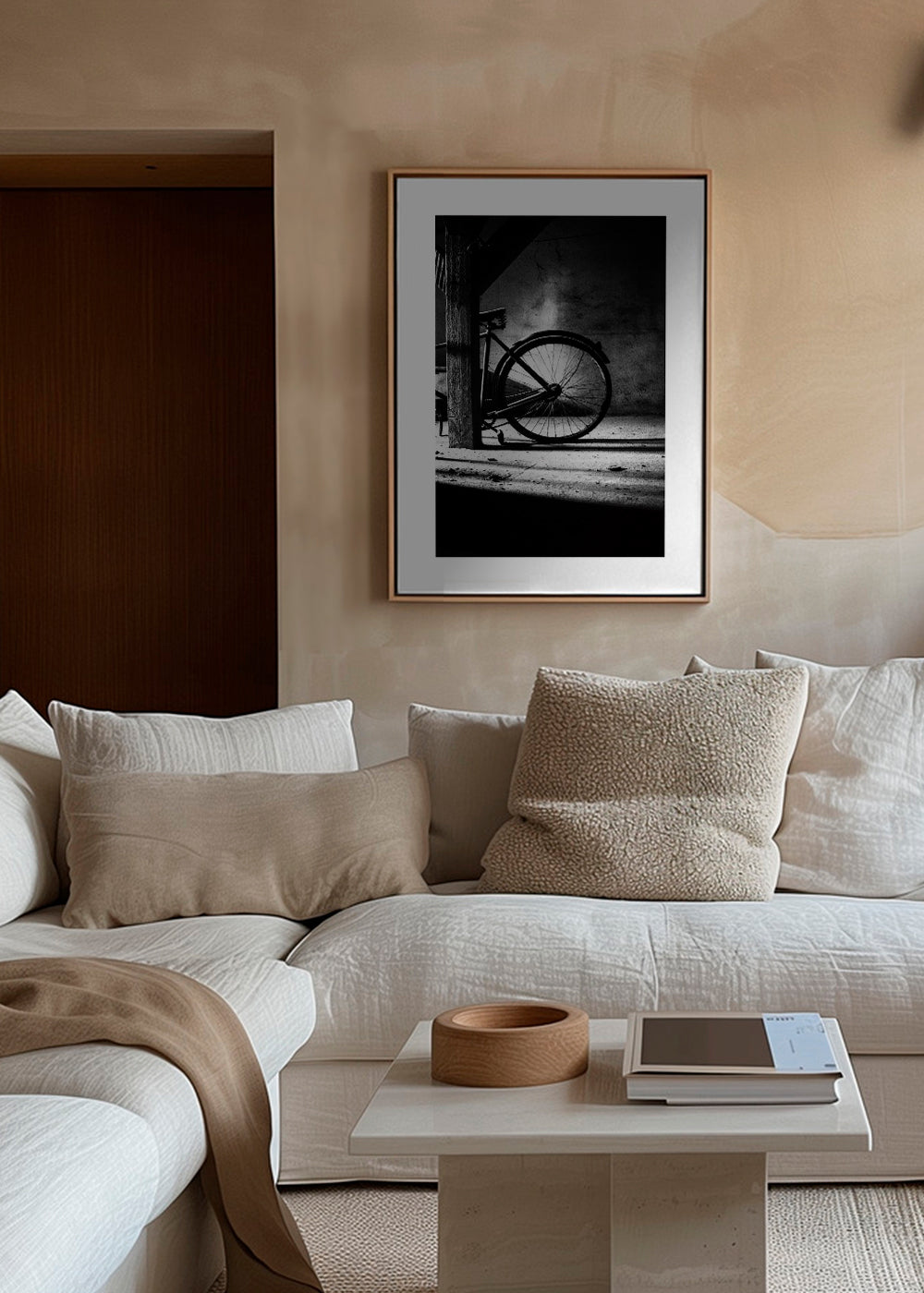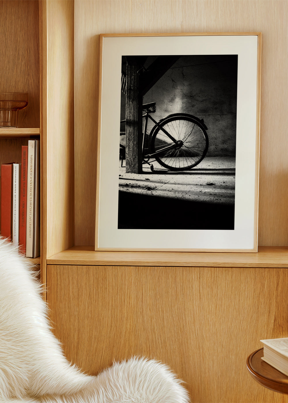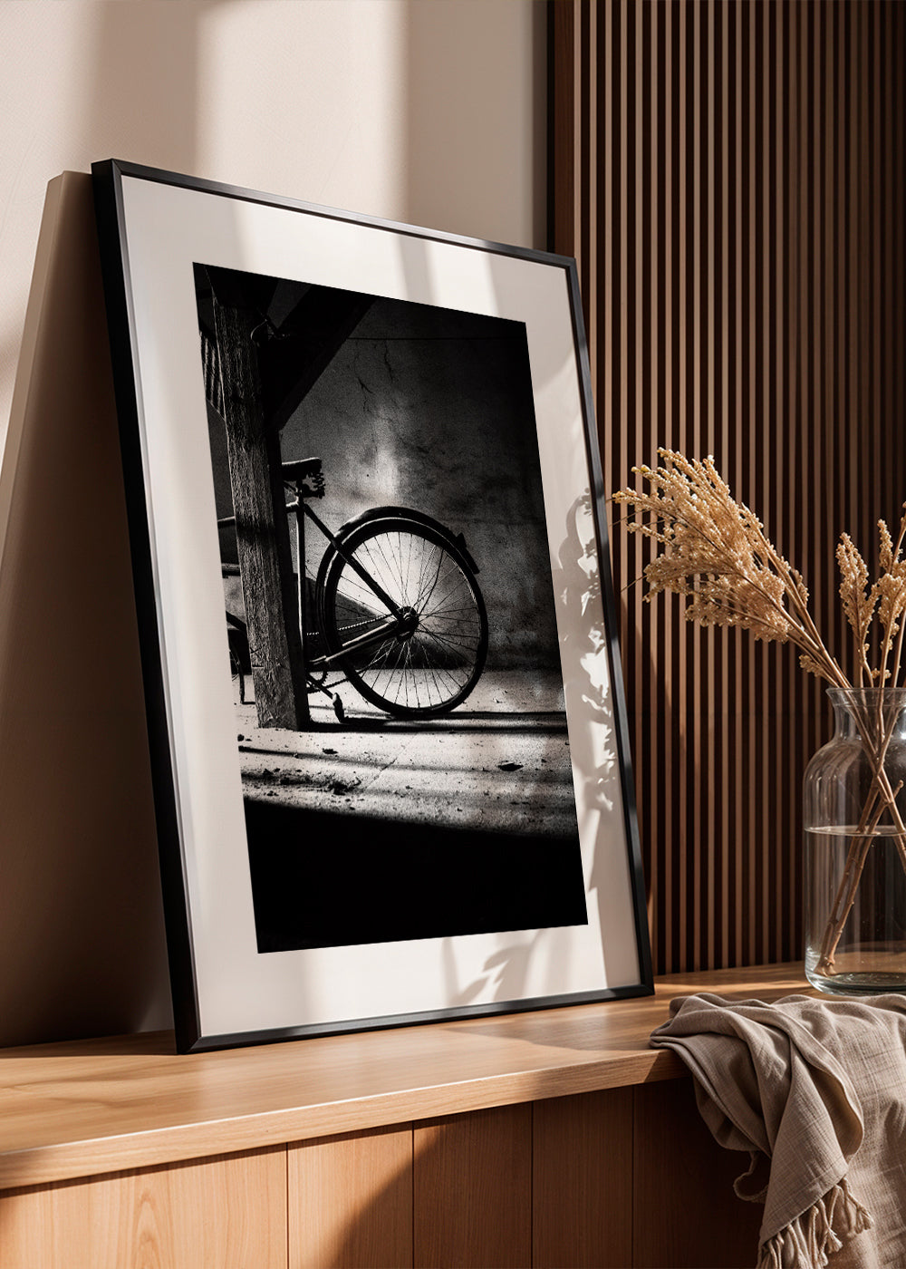 This print from the bicycle wall art series, with tones of black and white, and vertical layout. A perfect photo to give your walls an original touch with photos to frame. A piece that will be a plus for any room. This piece includes a white strip framing the design to boost its style.