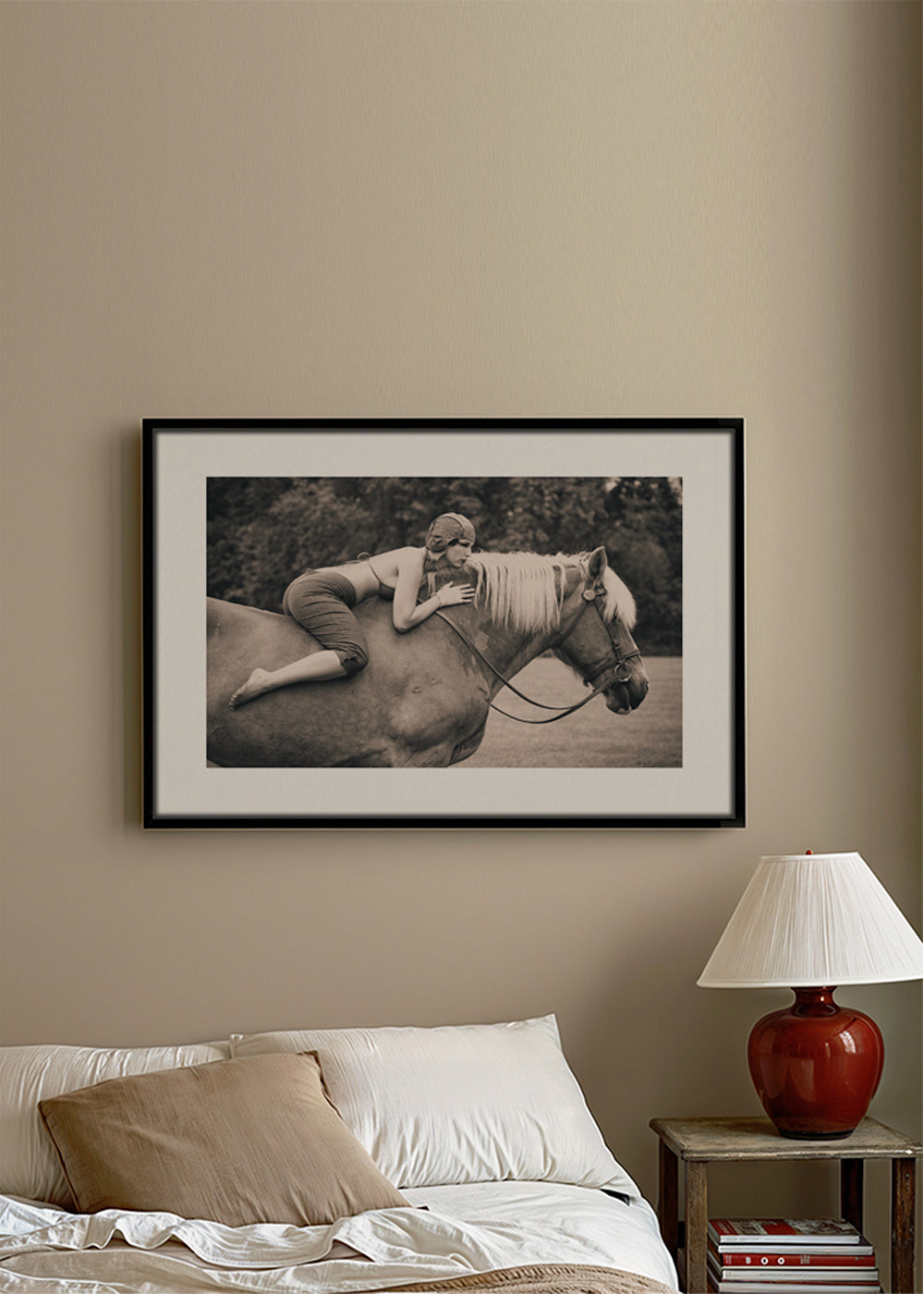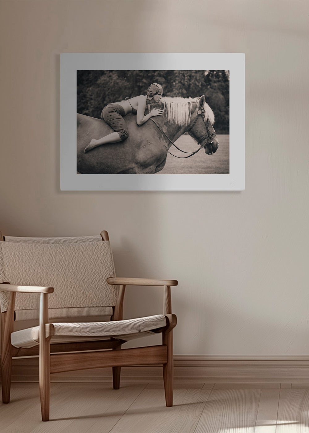 Beautiful piece from the horses wall art category, with black and white pigments, and in horizontal position. A retro poster you can pair with other vintage-style prints for an original touch in the home. Walls full of creativity. This design includes a white strip around it to add contrast to the piece.