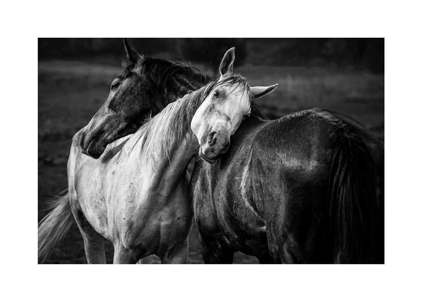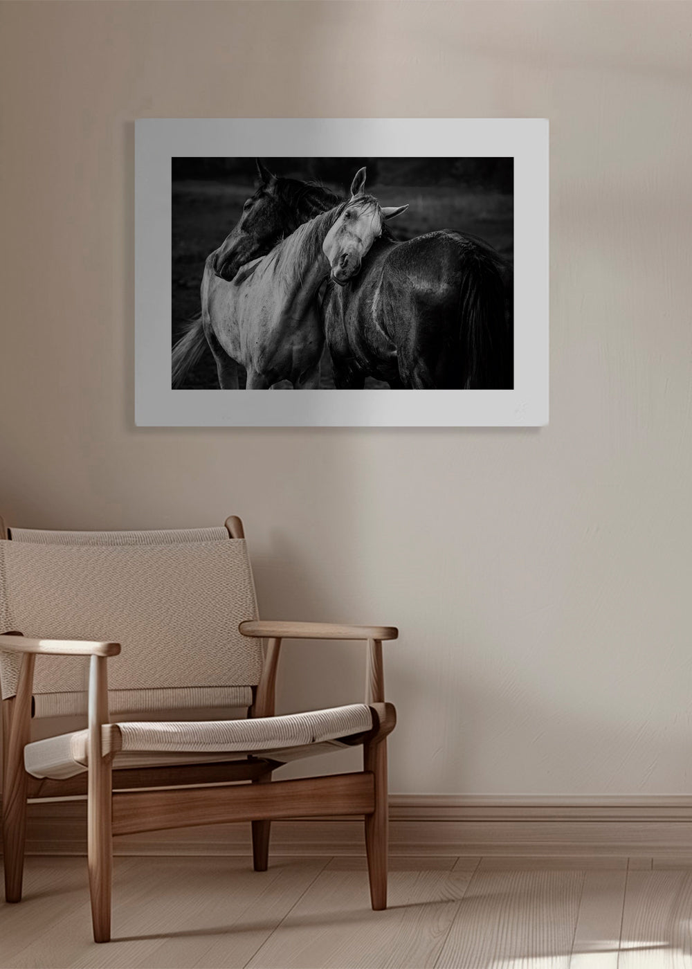 A print from the horses wall art series, with tones of black and white, and to hang in horizontal position. Animal prints let you show your wild side through your wall decoration. The difference is in the details. This piece includes a white strip framing the design to boost its style.