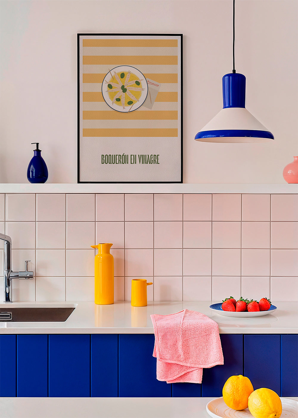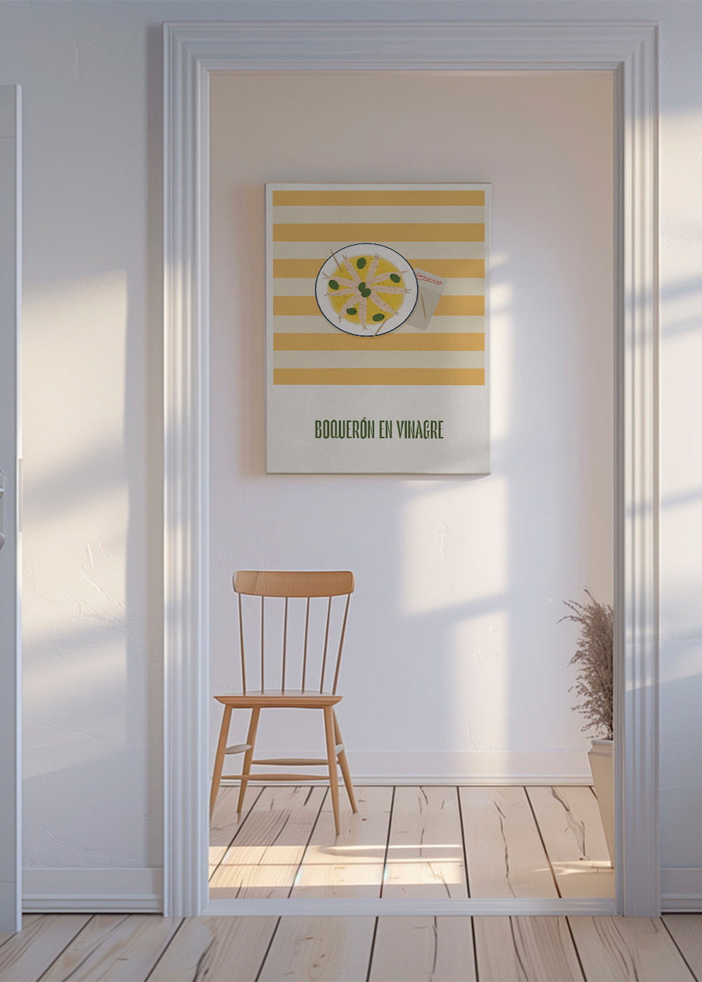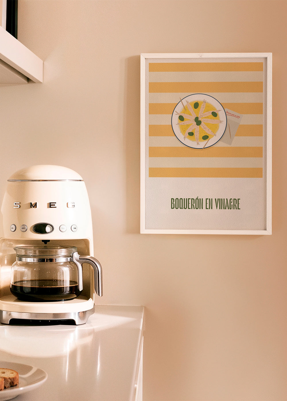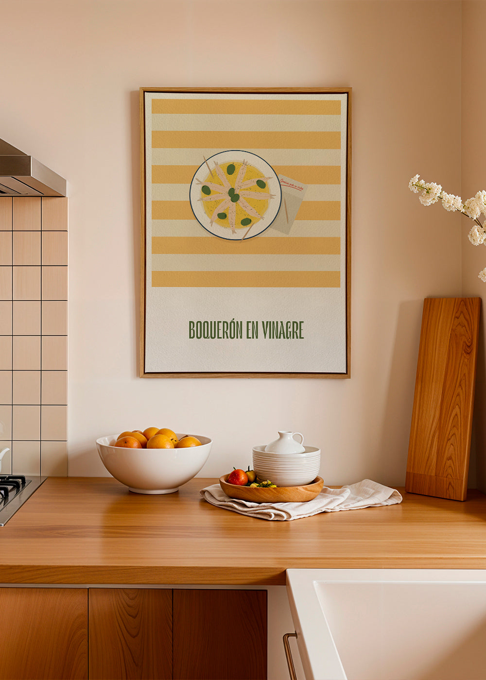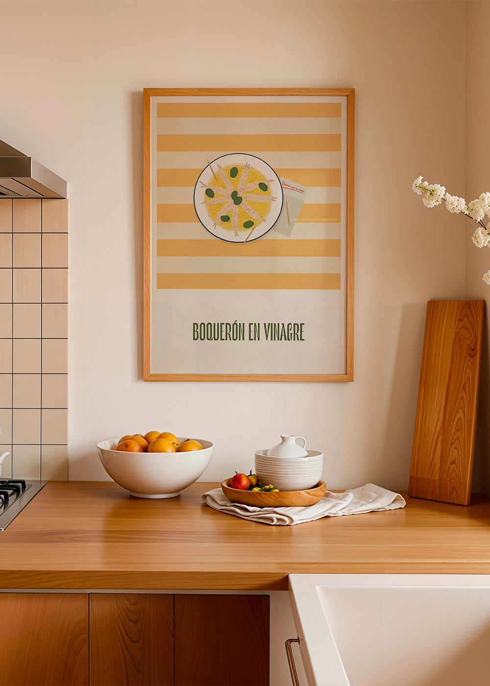 A poster from our food posters series, an original by Nerea Ramírez, in yellow shades, and facing vertically. Decorating your kitchen with prints and posters is trendy, and this piece is the perfect way to do it. A wall of posters can change the look of a room.
