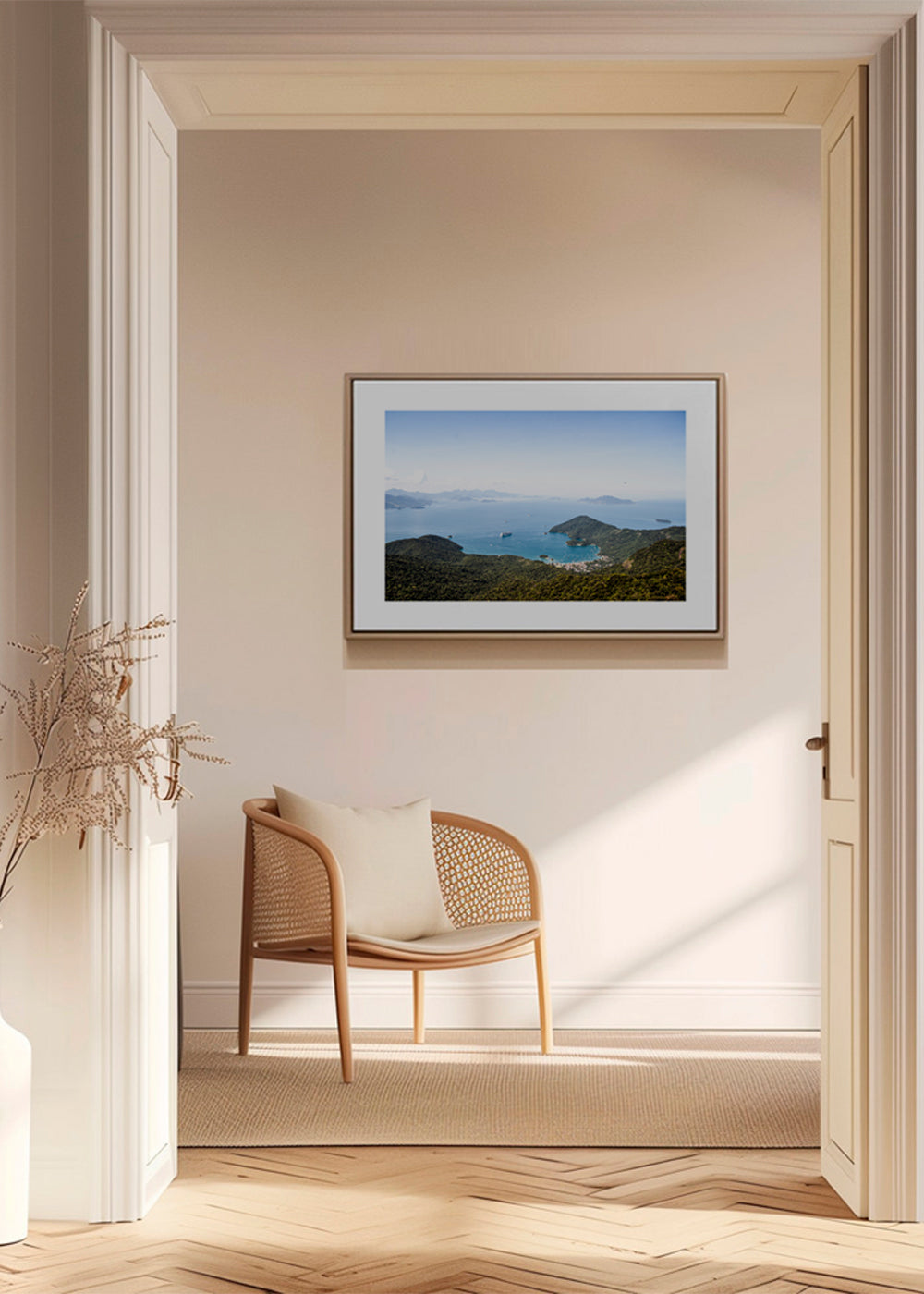 If you select the passepartout option, we will add the white matt board to the frame, and we will reduce the design of the work. For example, if you select a print size 20x28 in, with an oak colored frame and passepartout, we will reduce the design of the print to the previous size (16x20 in). In this way, it will adapt perfectly to the inside window of the passepartout.