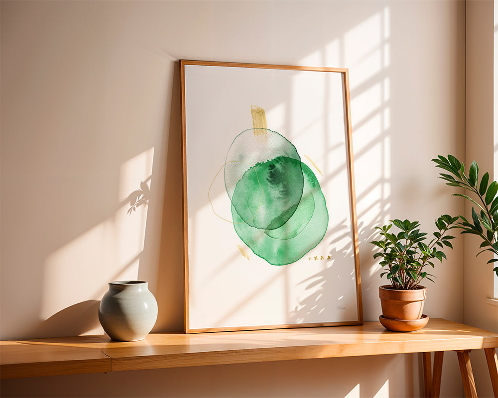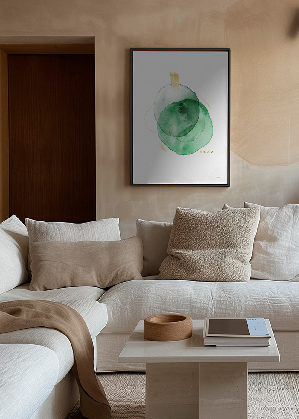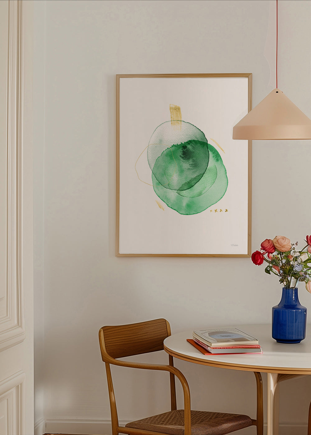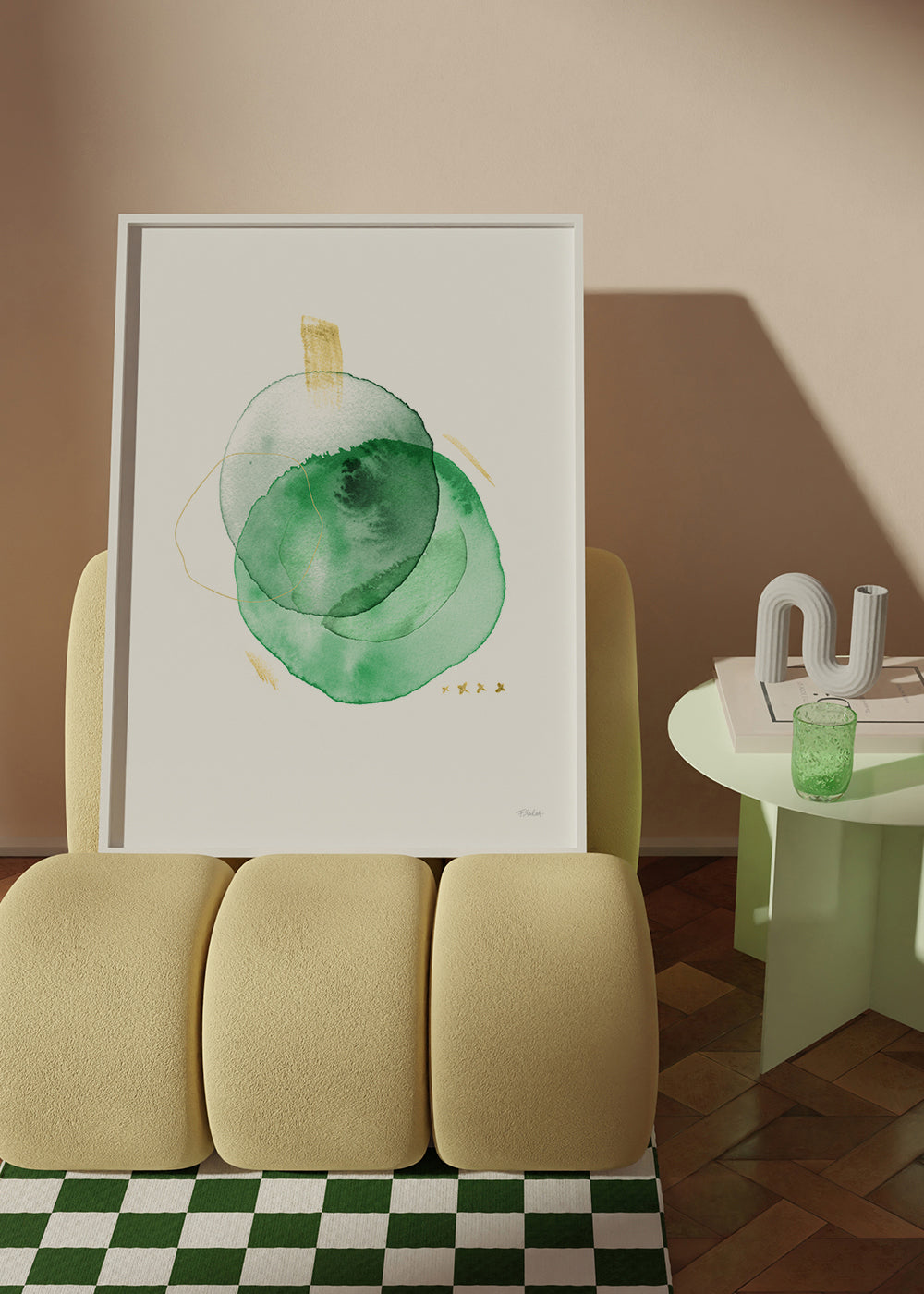A poster from our geometric wall art and prints collection, made by Fabiana Silveira, with green, and with vertical layout. This piece with abstract shapes is perfect for pairing with other abstract art and geometric prints. A piece that will be a plus for any room.