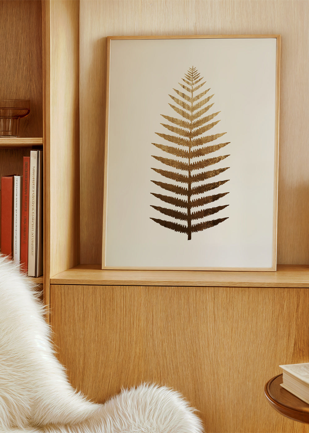 This poster from our botanical prints and wall art collection, created by KUBISTIKA, with tones of gold, and to hang in vertical position. Fill your walls with nature by pairing this piece with other prints with botanical designs. Create spots full of art.