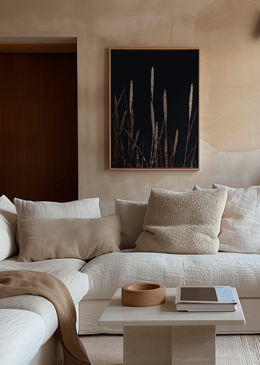 A piece from our palm tree prints collection, created by KUBISTIKA, with shades of gold, and vertical layout. Decoration with botanical prints is perfect for nature-lovers. The final touch for your home decor.
