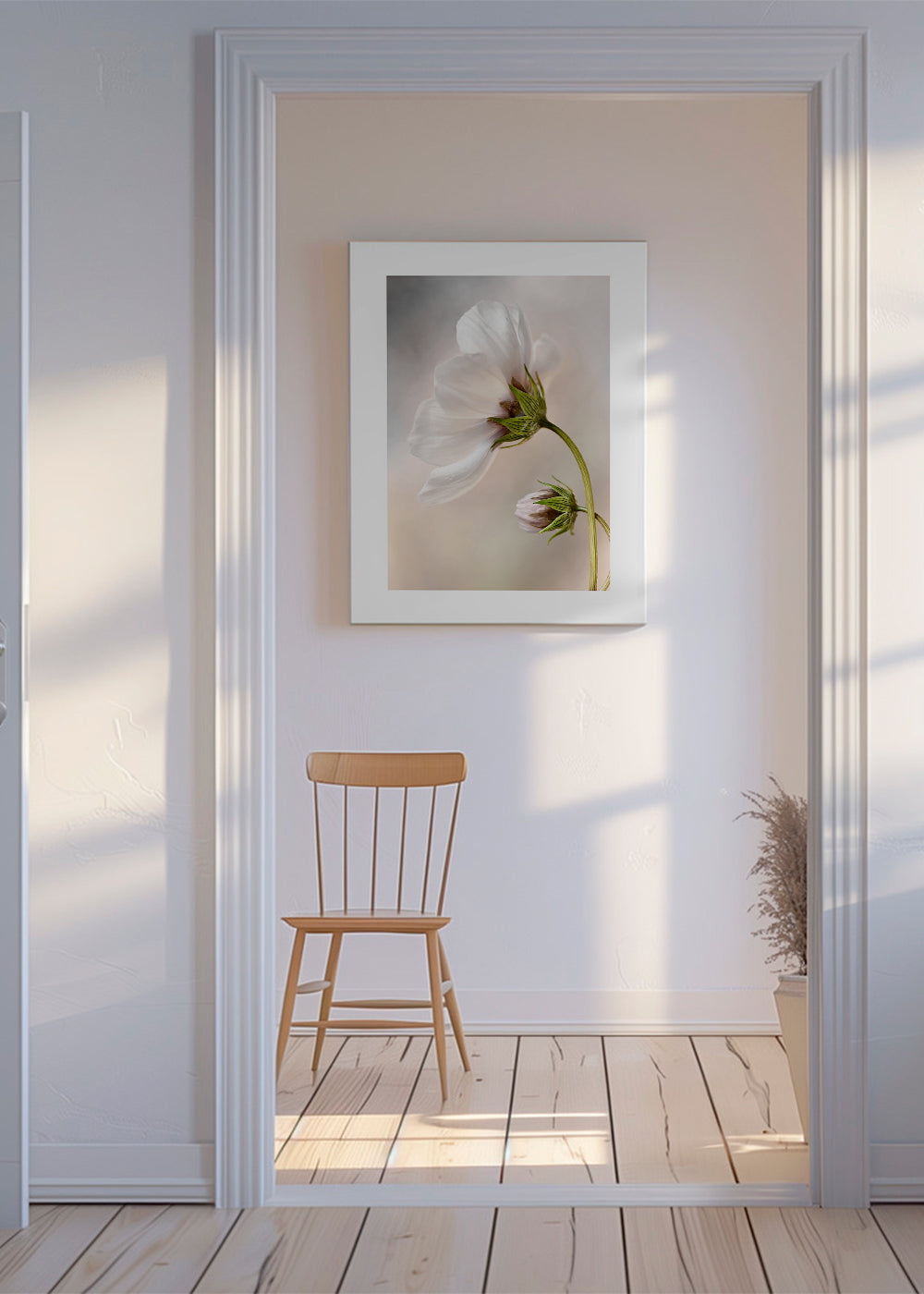 This piece from our selection of botanical prints and wall art, in tones of green, and vertical layout. Create a vertical garden by pairing this piece with other prints with flowers and plants. An empty wall is a canvas waiting to be painted. The white strip around the piece enhances its expressiveness.
