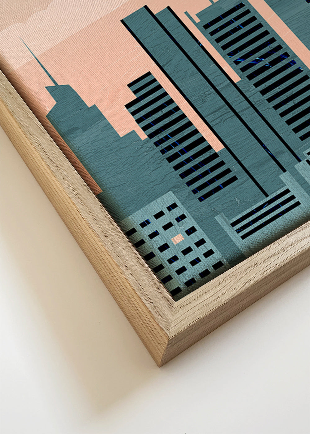 We recommend the pastel blue frame to echo the sky tones, while pastel pink offers a softer touch and white wood keeps the look crisp; a piece that brings urbane calm to any wall.