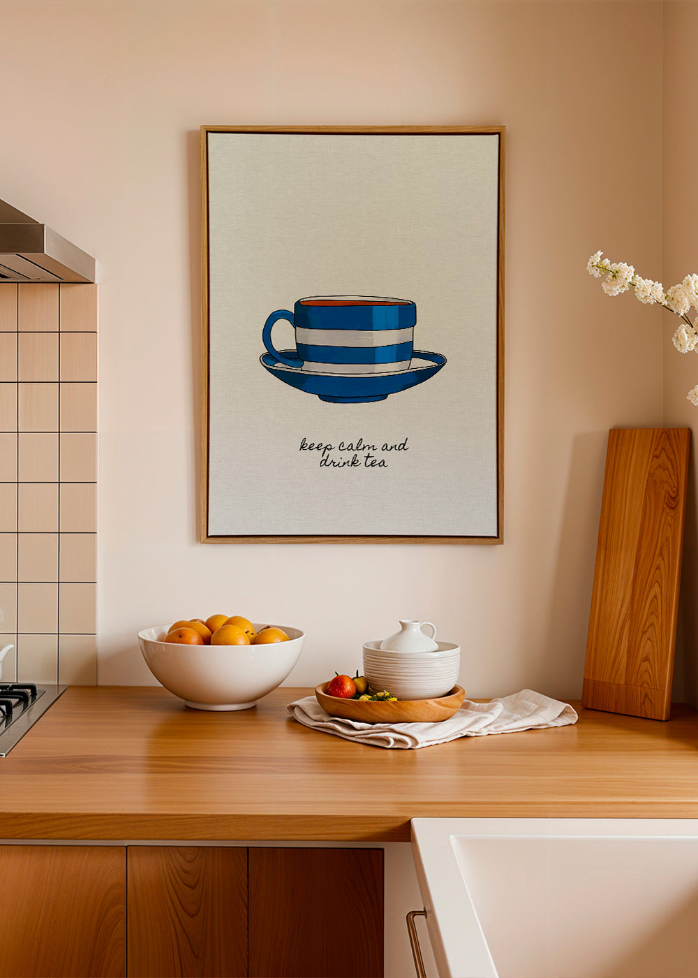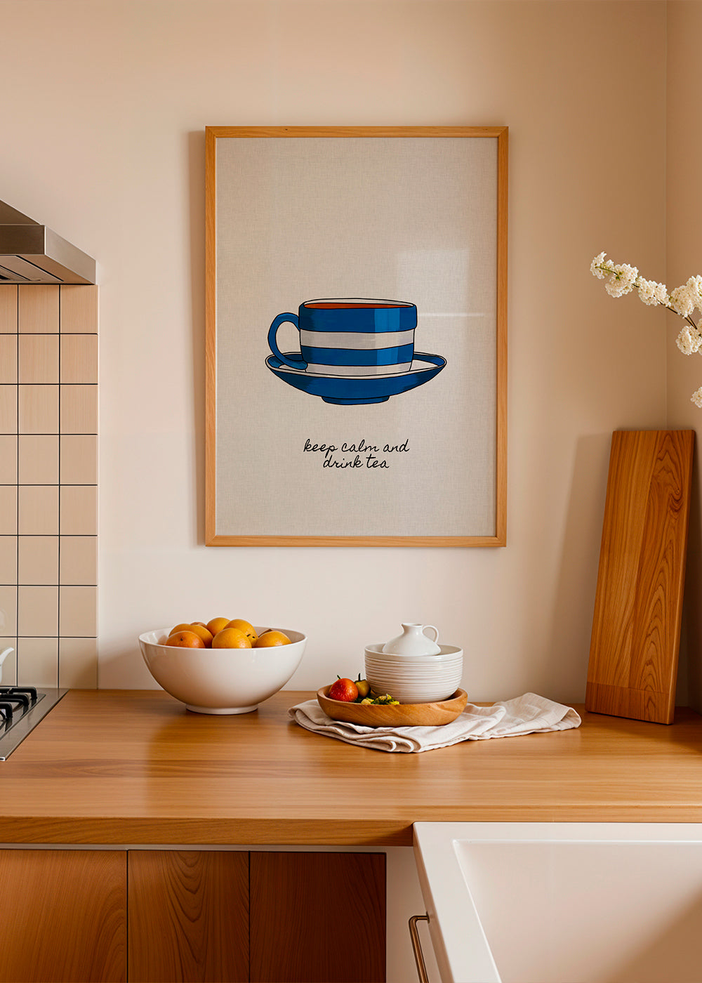 Beautiful poster in the style of our coffee wall art, by Orara Studio, in blue shades, and in vertical position. Prints for the kitchen are a perfect decorative element for such a cosy space. Fresh and original.