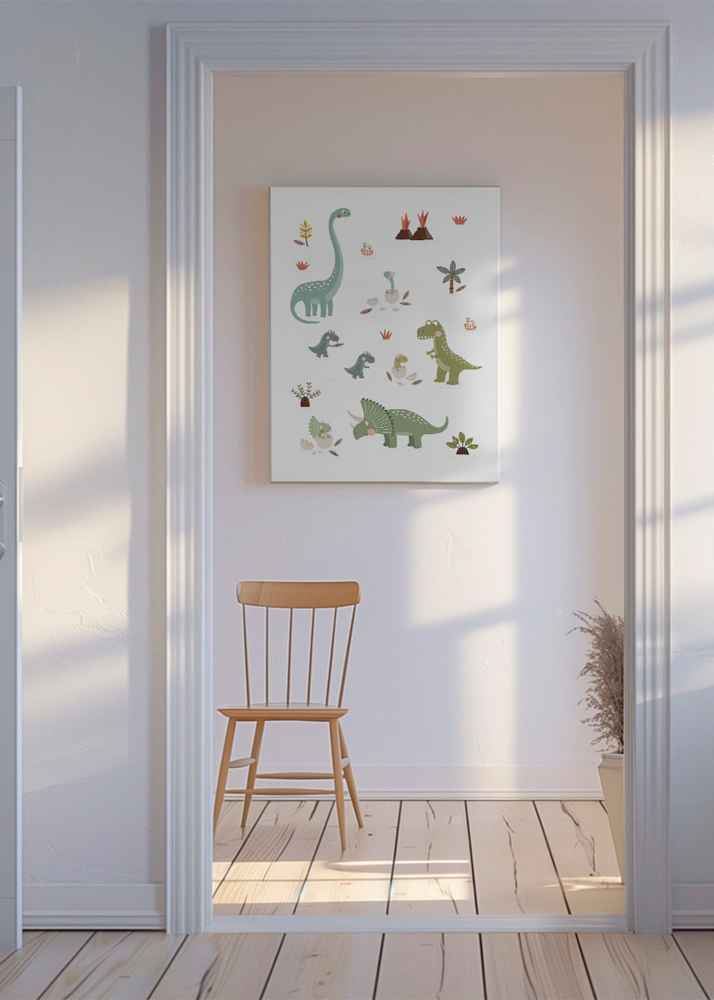 This poster from our dinosaurs prints collection, by Marta Munte, with touches of green, and to hang in vertical position. Animal prints let you show your wild side through your wall decoration. Create special spaces.