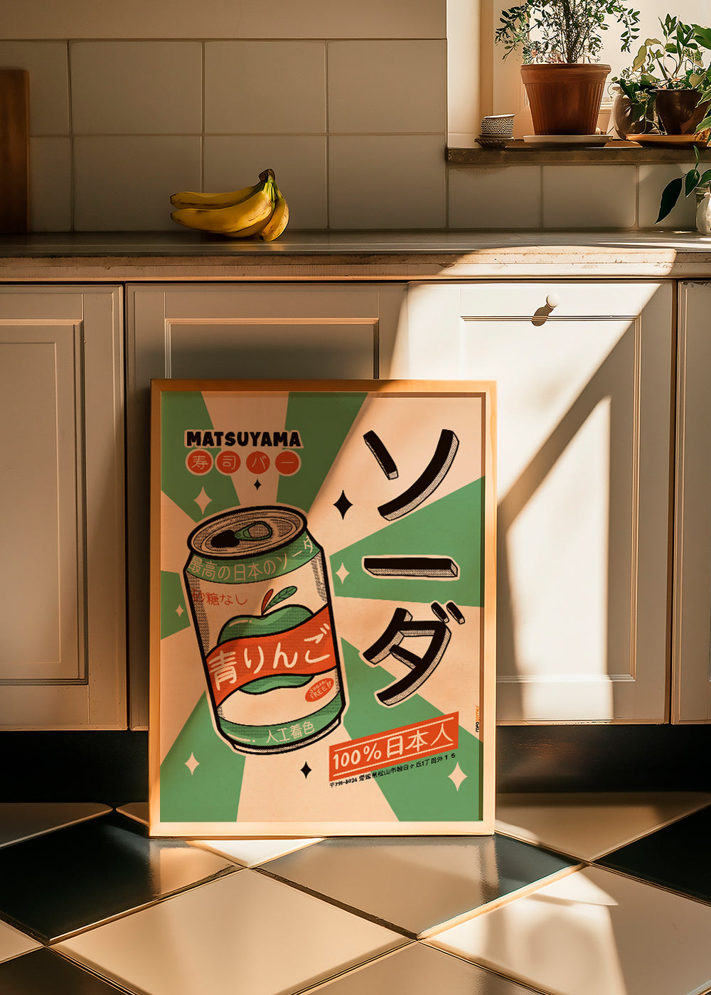 A print from our japanese wall art collection, from the collection of the artist Rafa Gomes, with shades of green, and perfect to hang vertically. A retro poster you can pair with other vintage-style prints for an original touch in the home. Forget about boring walls.