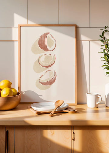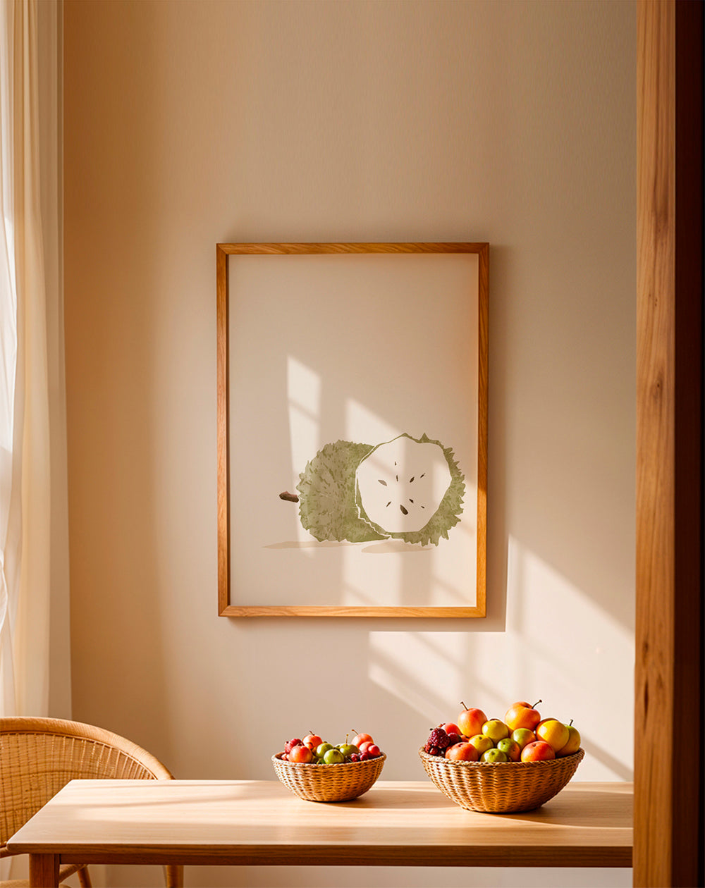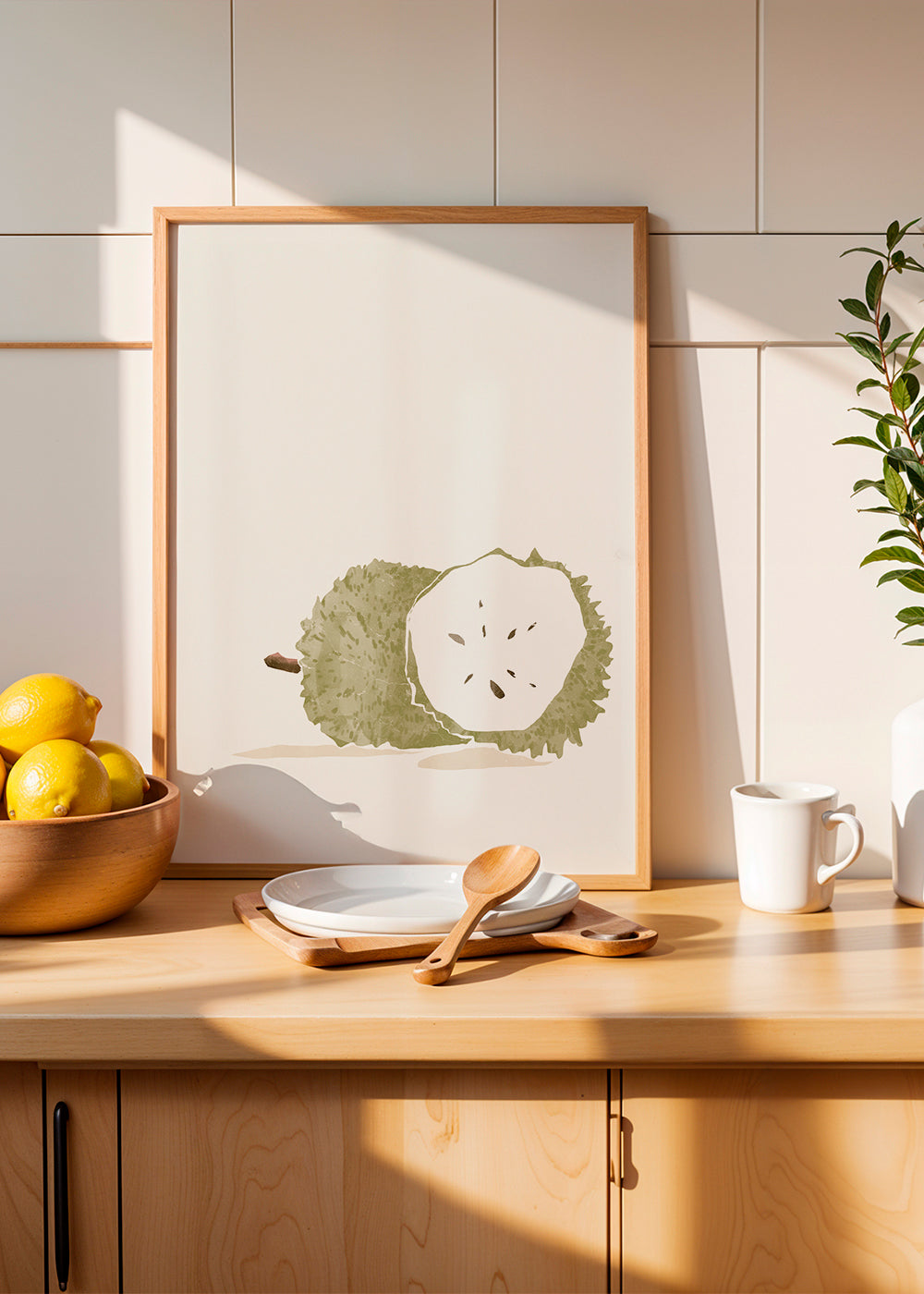 This poster from the fruit posters collection, by Yuyu Pont, in tones of green, and with vertical layout. With this print in your kitchen, cooking will no longer be a problem. You won't be able to wait to get cooking again, just so you can see it. Pair it with other kitchen prints. Get swept away by art.