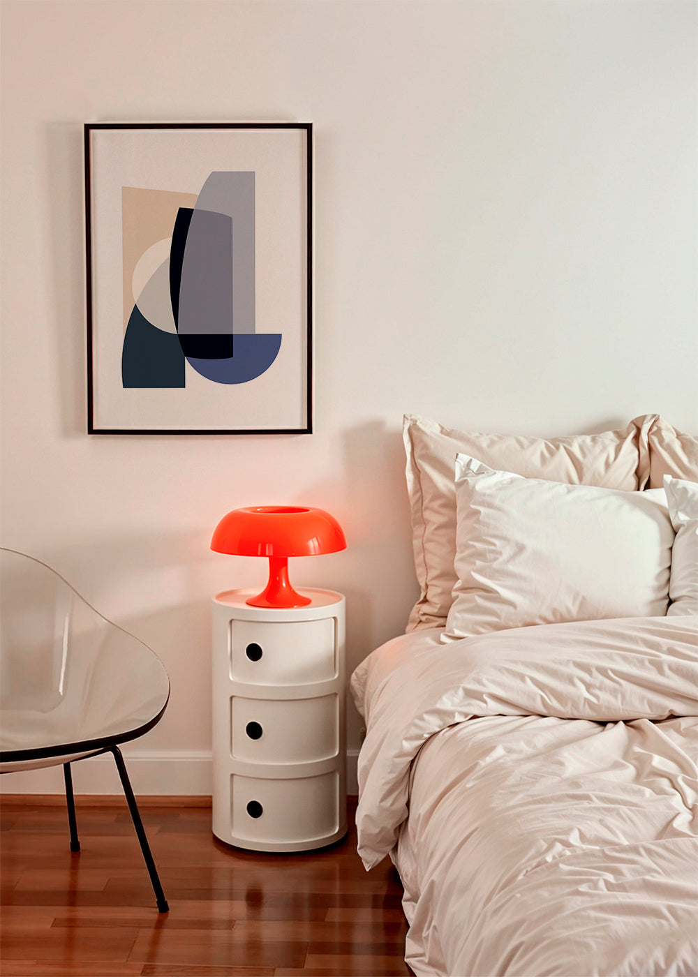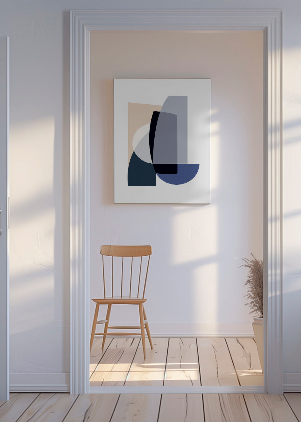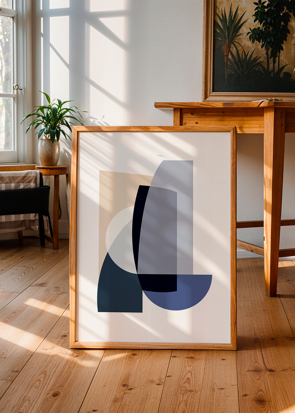 A print from the geometric wall art and prints category, created by Anna Mainz, in tones of blue, and to hang in vertical position. Geometric art is an elegant style to decorate the walls of your home with. Refresh a whole room by just adding a few posters on the walls.