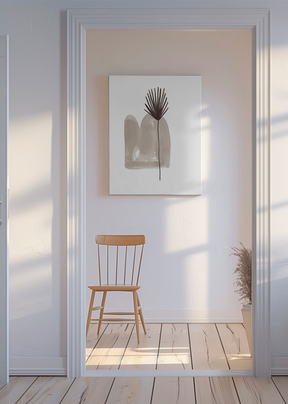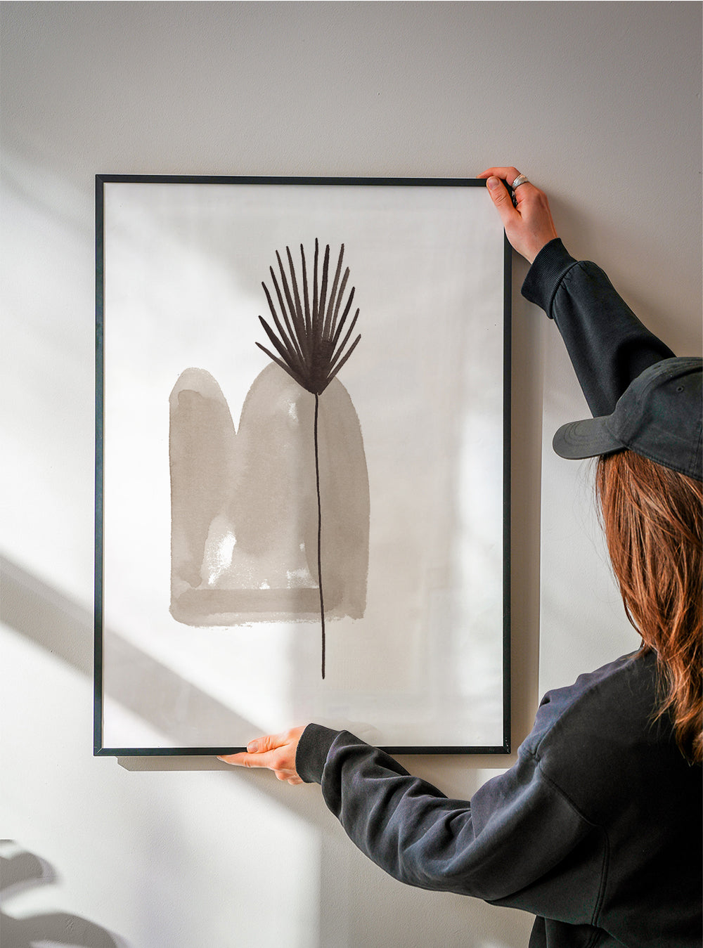 This design inspired by the collection of palm tree prints, by Kruth Design, with touches of brown, and vertical layout. Create a vertical garden by pairing this piece with other prints with flowers and plants. Forget about boring walls.