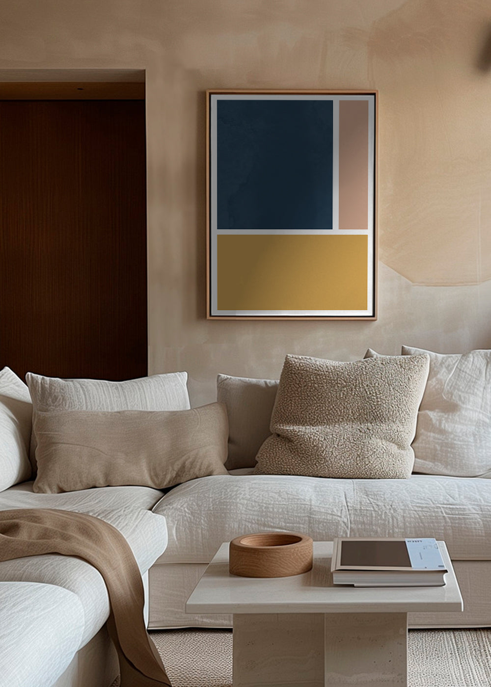 A print from our selection of geometric wall art and prints, by the artist Muthyger, with tones of blue, and with vertical layout. Geometric art is an elegant style to decorate the walls of your home with. Create the perfect environment.