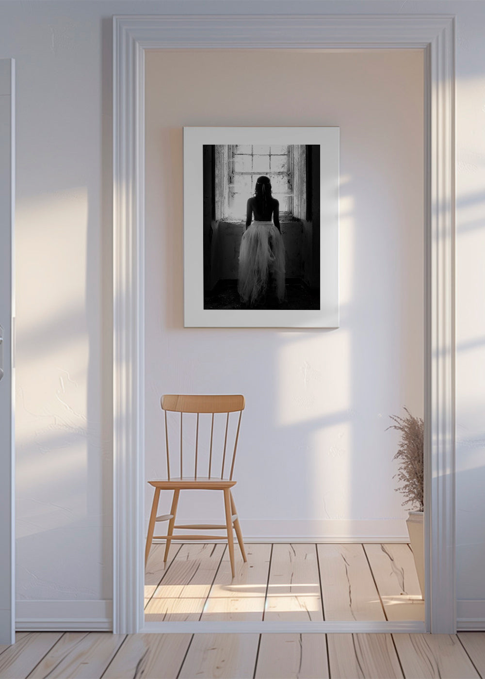 A print from our girls wall art category, with touches of black, and vertical layout. A perfect photo to give your walls an original touch with photos to frame. Get swept away by art. The white strip around the piece enhances its expressiveness.