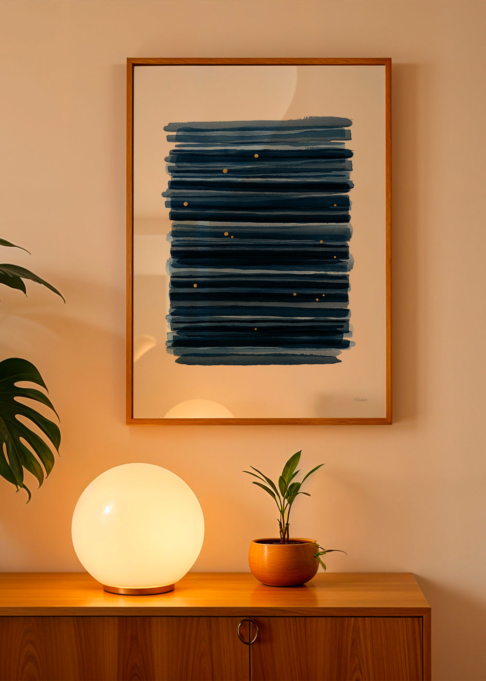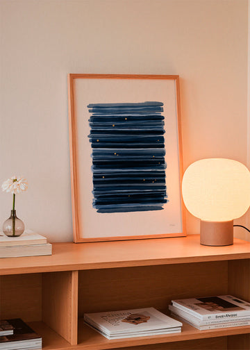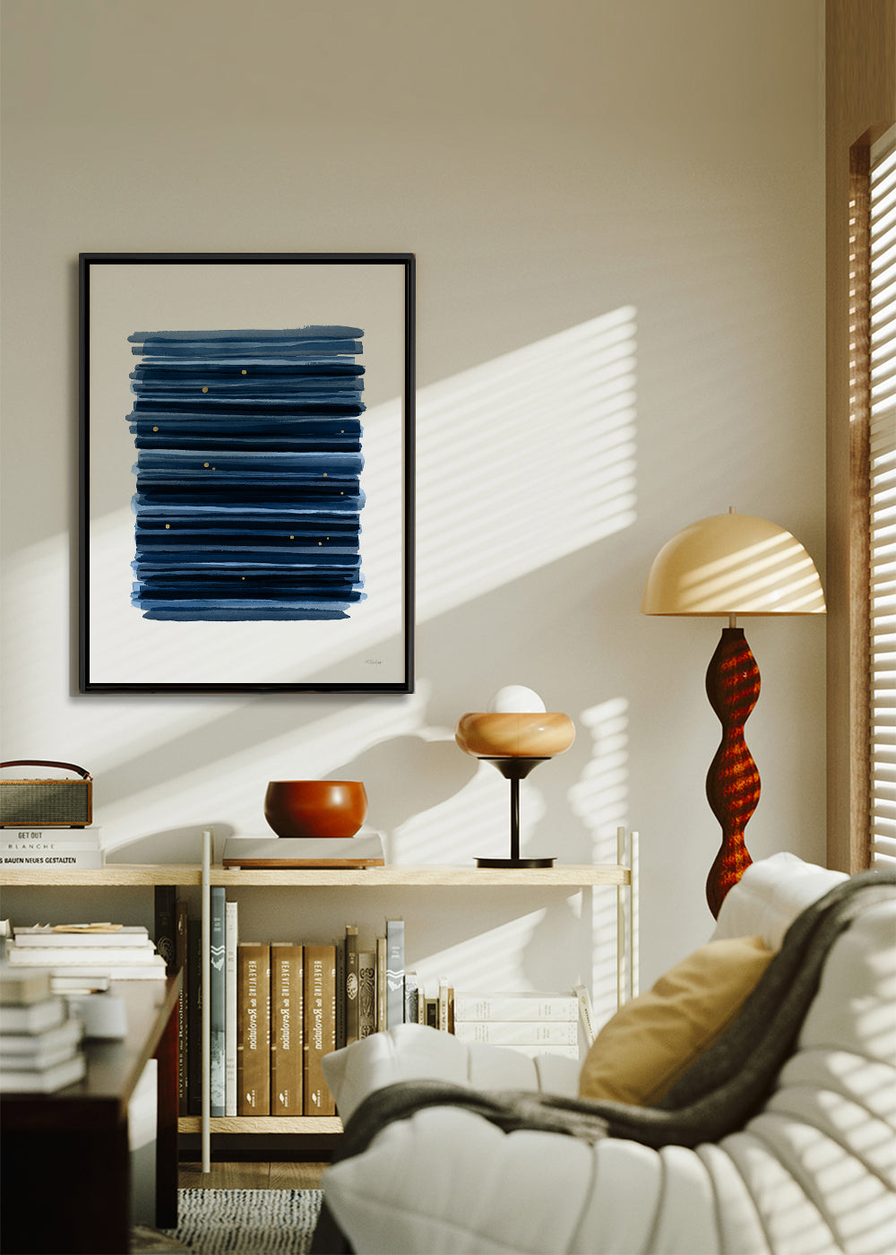 This poster in the style of our geometric wall art and prints, from the collection of the artist Fabiana Silveira, with blue, and facing vertically. This piece with abstract shapes is perfect for pairing with other abstract art and geometric prints. Transform your spaces with art.