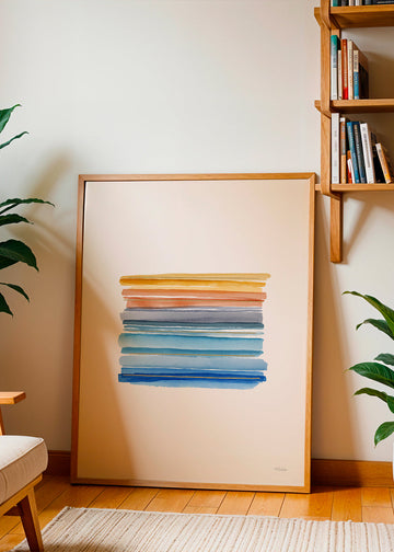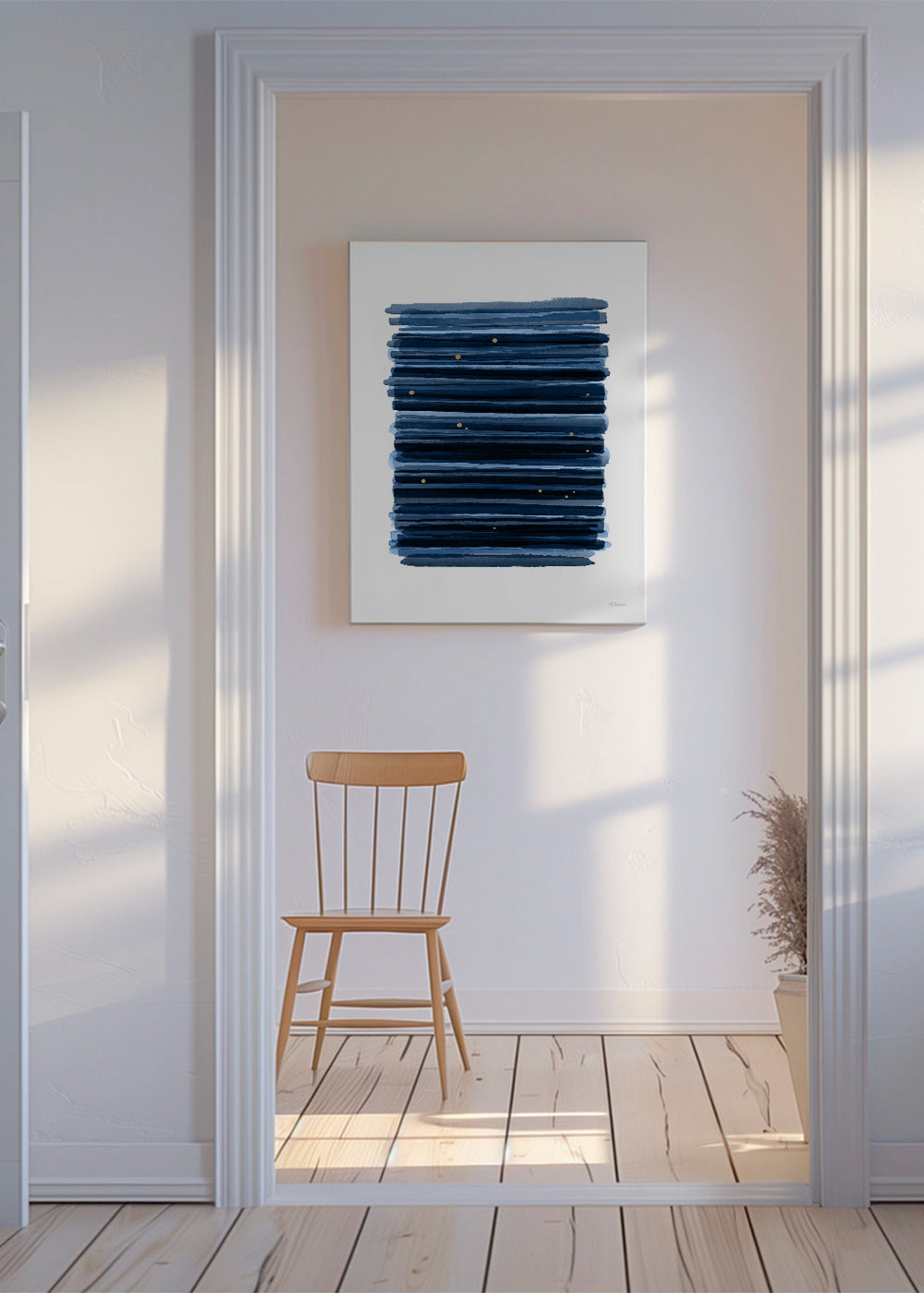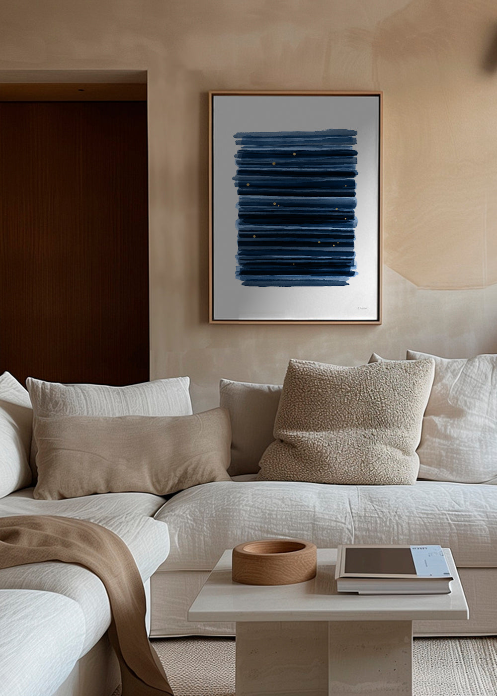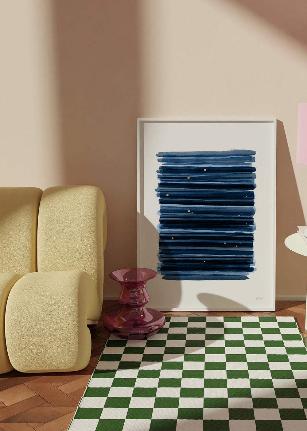 This poster in the style of our geometric wall art and prints, from the collection of the artist Fabiana Silveira, with blue, and facing vertically. This piece with abstract shapes is perfect for pairing with other abstract art and geometric prints. Transform your spaces with art.