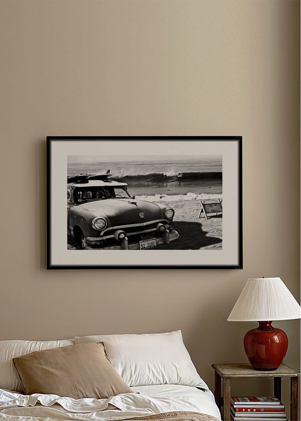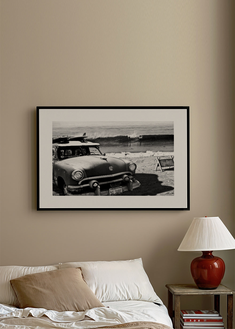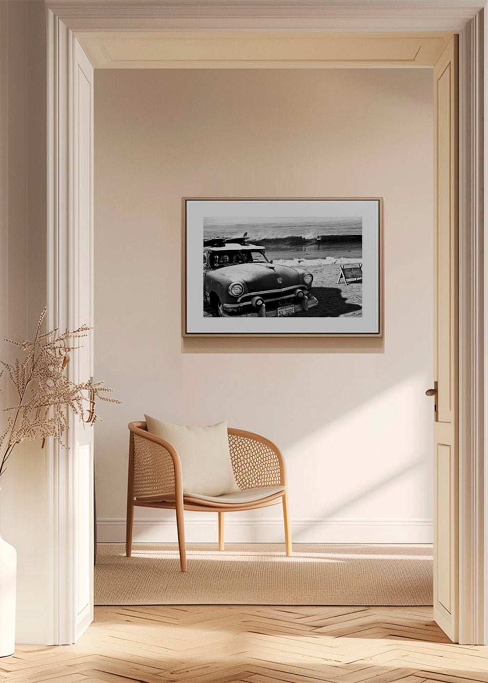 A print from our selection of cars posters and wall art, with black and white tones, and horizontal layout. A retro style that is perfect for a vintage look. Play around with different combinations of our pieces to get the look you want. The white strip around the piece enhances its expressiveness.