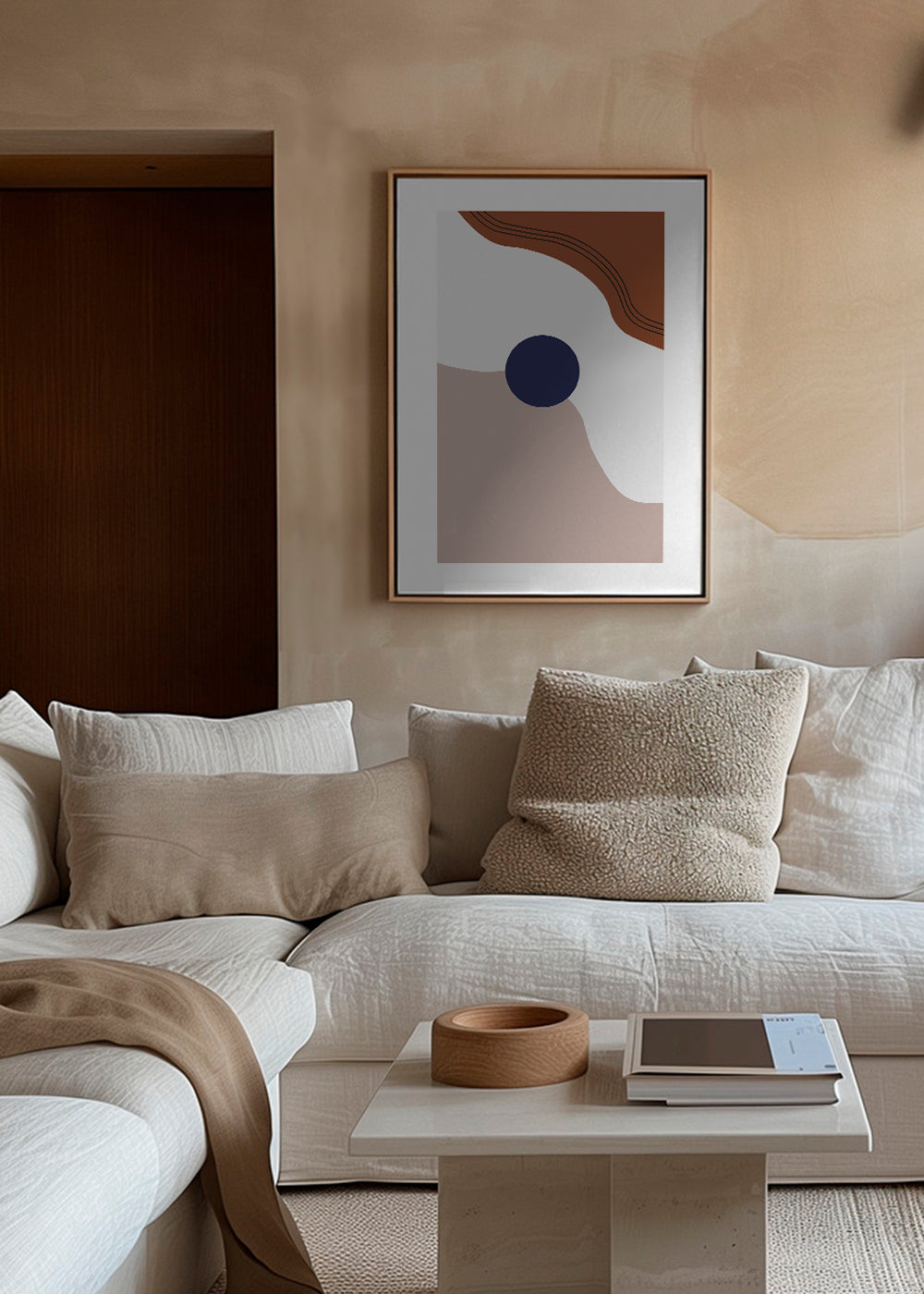 A print from our geometric wall art and prints category, created by Studio Krone Kern, with brown pigments, and to hang in vertical position. The abstract, geometric shapes help create a casual, creative setting. There are no ugly or beautiful walls, just empty or full ones. The white strip around the piece enhances its expressiveness.