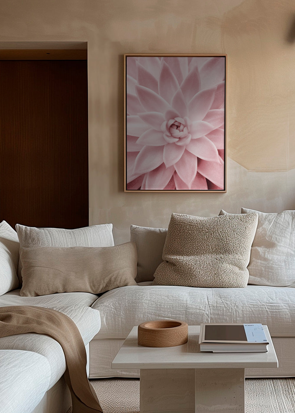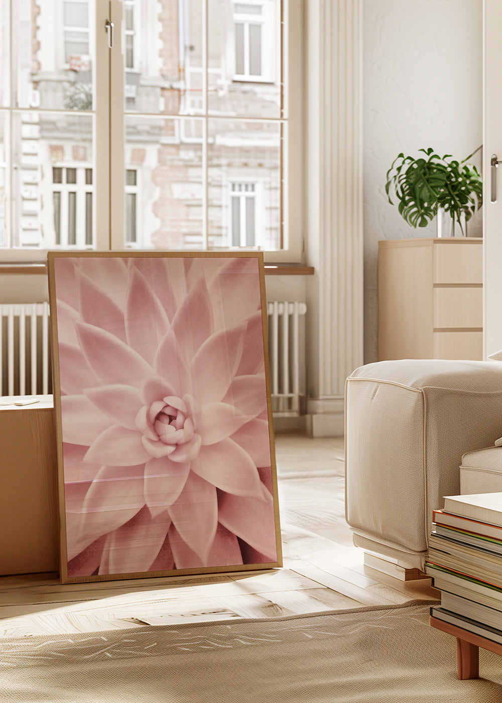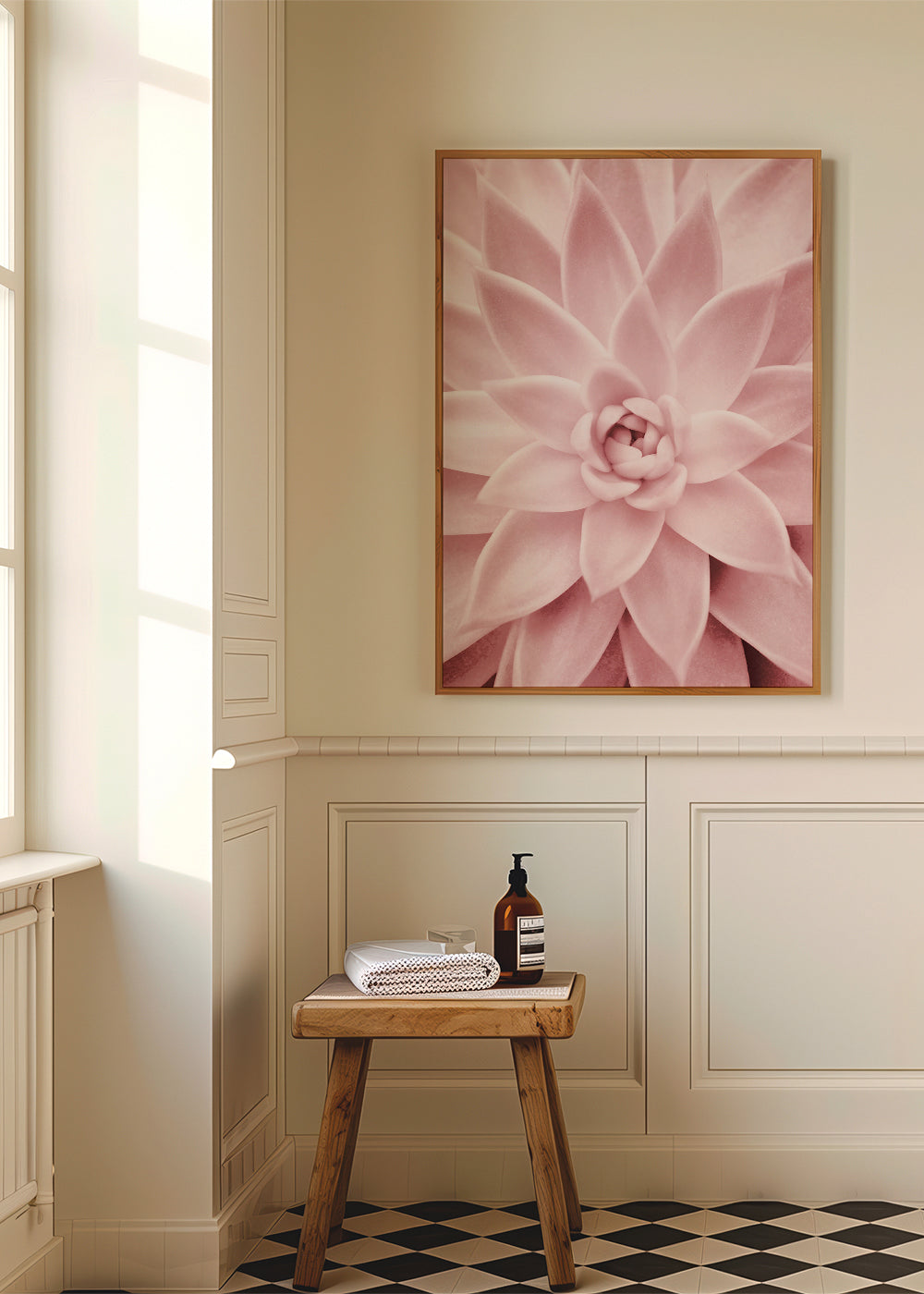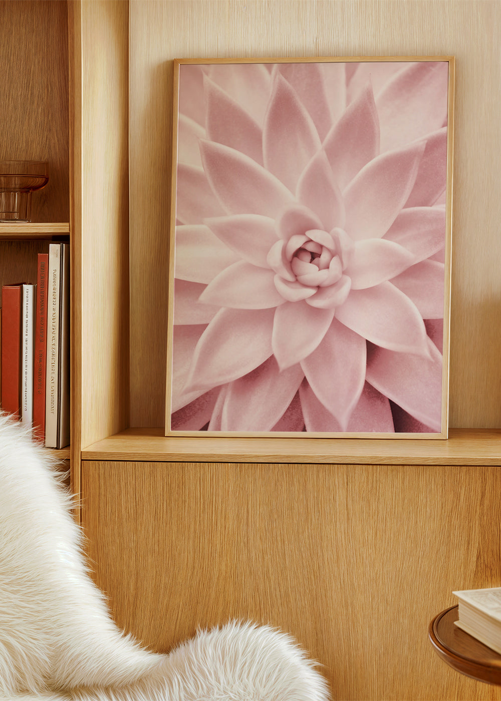 A print in the style of our botanical prints and wall art, an original by Kathrin Pienaar, with pink, and to hang in vertical position. Decoration with botanical prints is perfect for nature-lovers. Create your favourite spot.