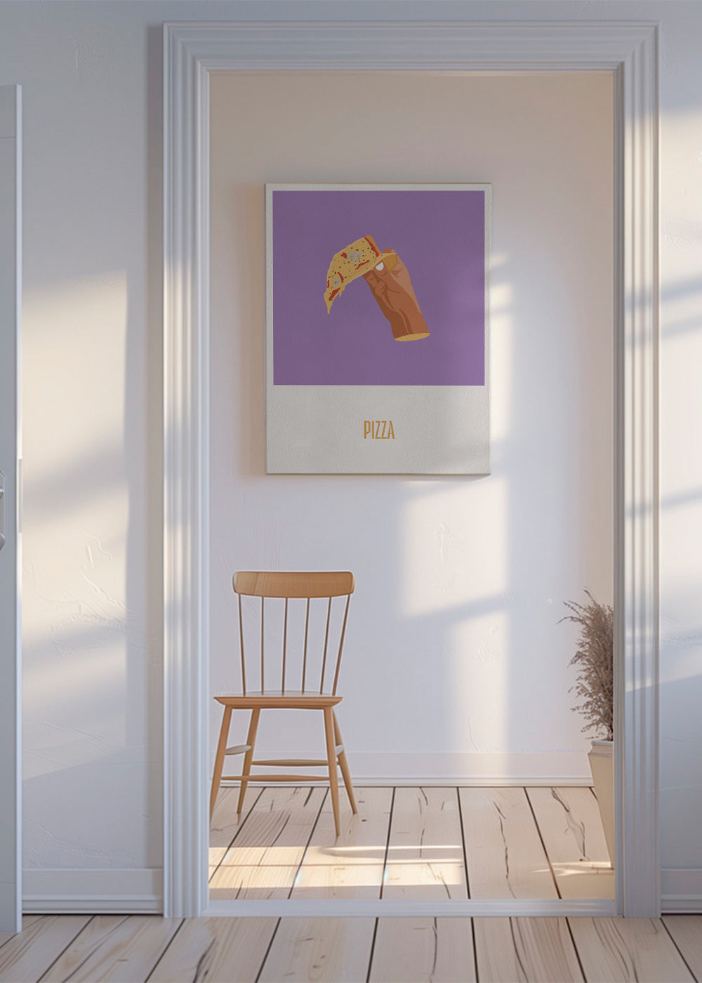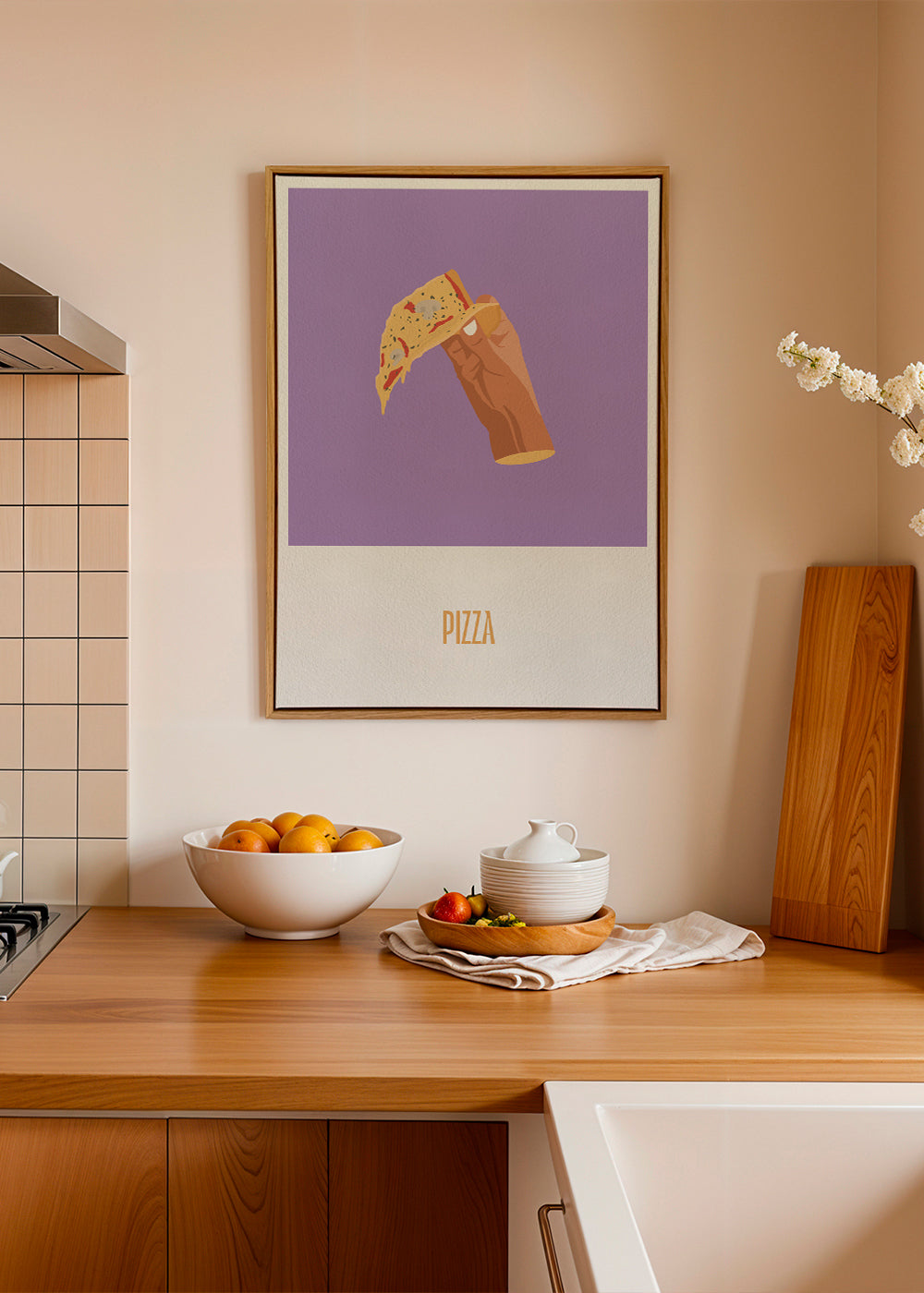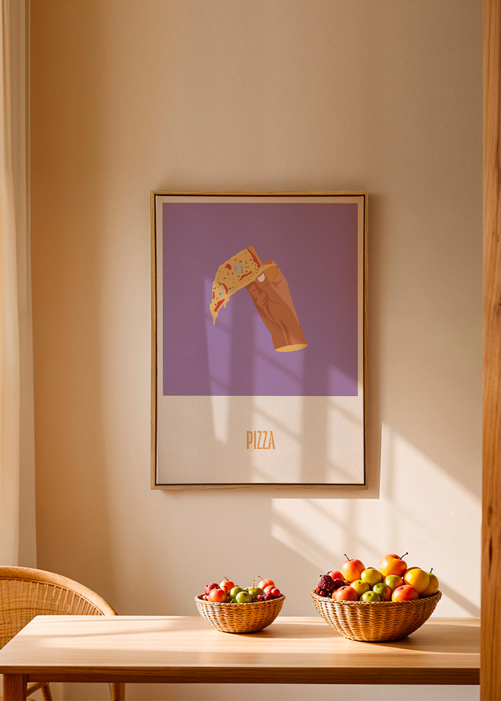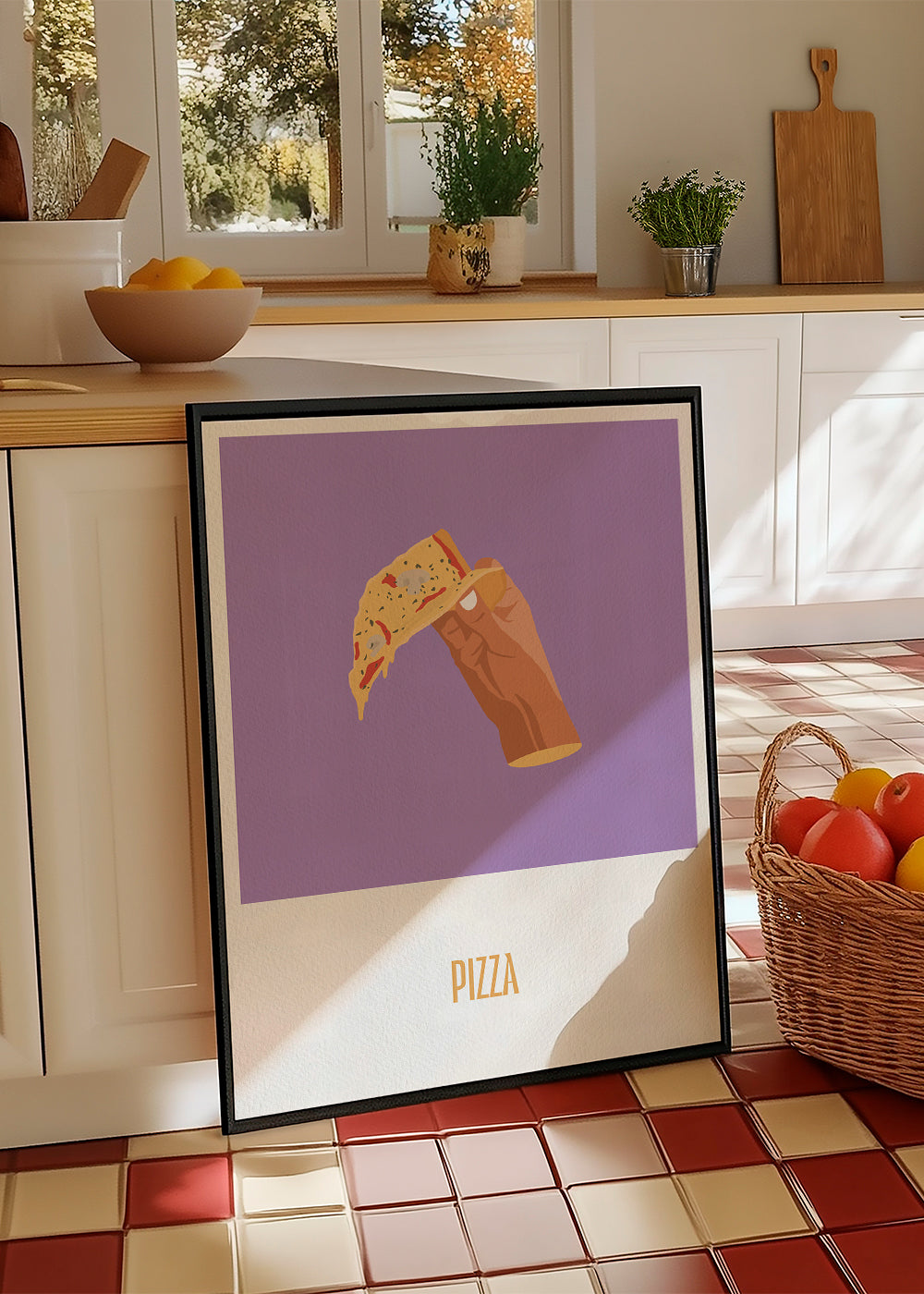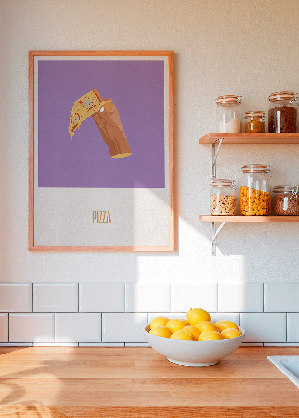 A print from our repertoire of pizza posters, by the artist Nerea Ramírez, in tones of purple, and vertical layout. Make your kitchen a fun space with this and other prints for the kitchen. Add a bit of art to your home decor.