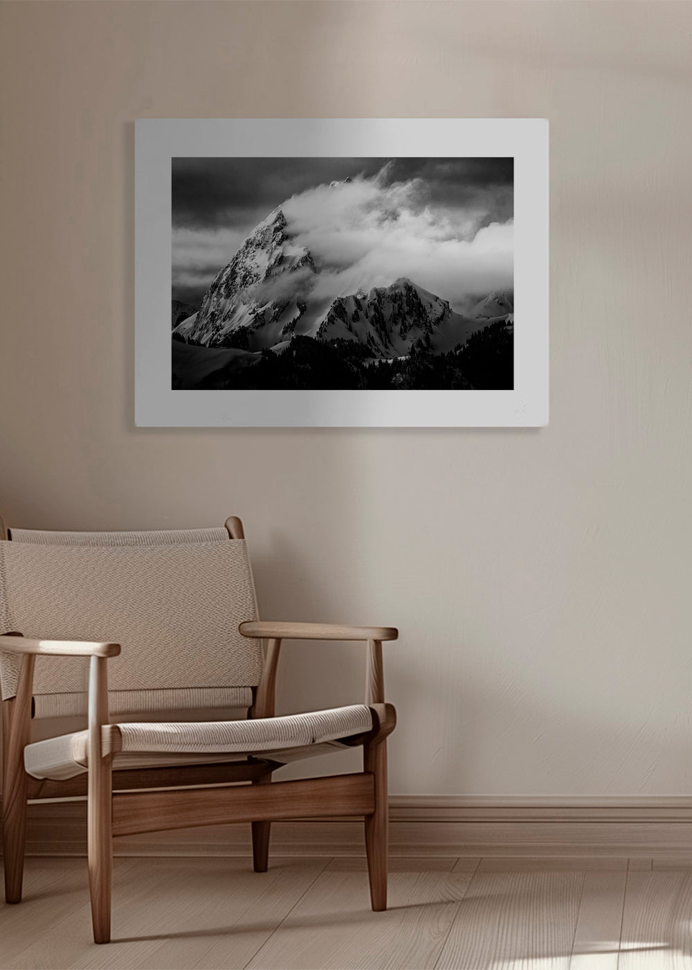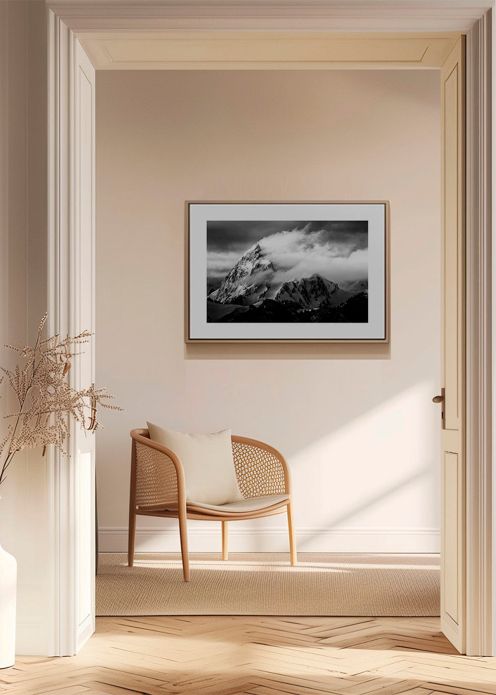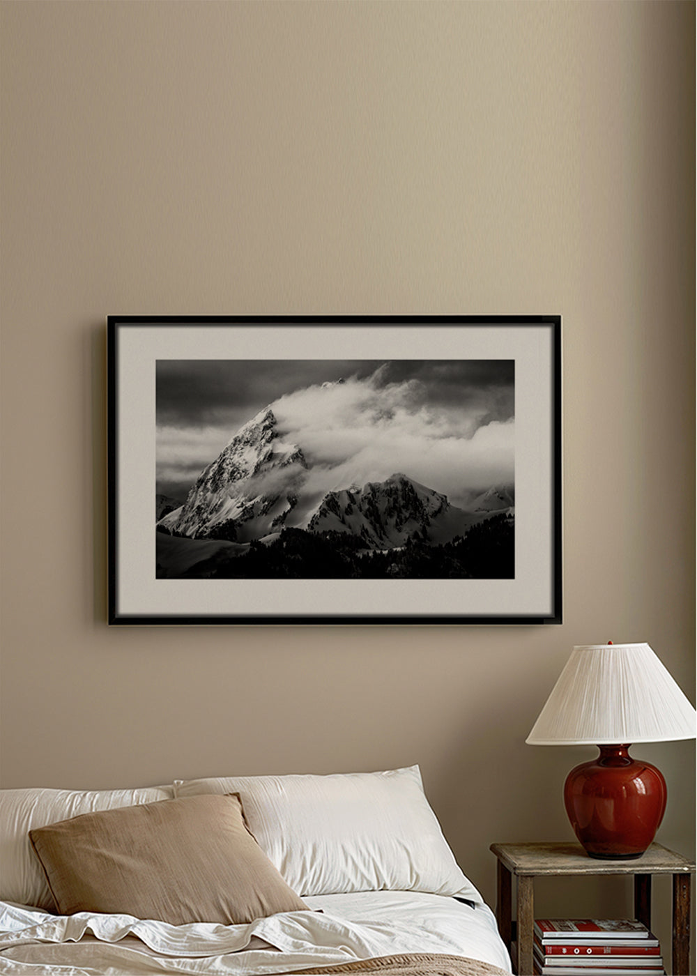 Beautiful design from our mountains wall art category, with black tones, and in horizontal position. A beautiful landscape perfect for pairing with other nature prints. Walls full of creativity. The white strip around the piece enhances its expressiveness.