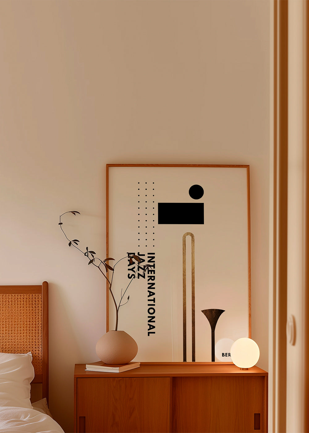 A poster from our repertoire of jazz music posters, by Kubistika, in tones of gold, and to hang in vertical position. The abstract, geometric shapes help create a casual, creative setting. Create special spaces.