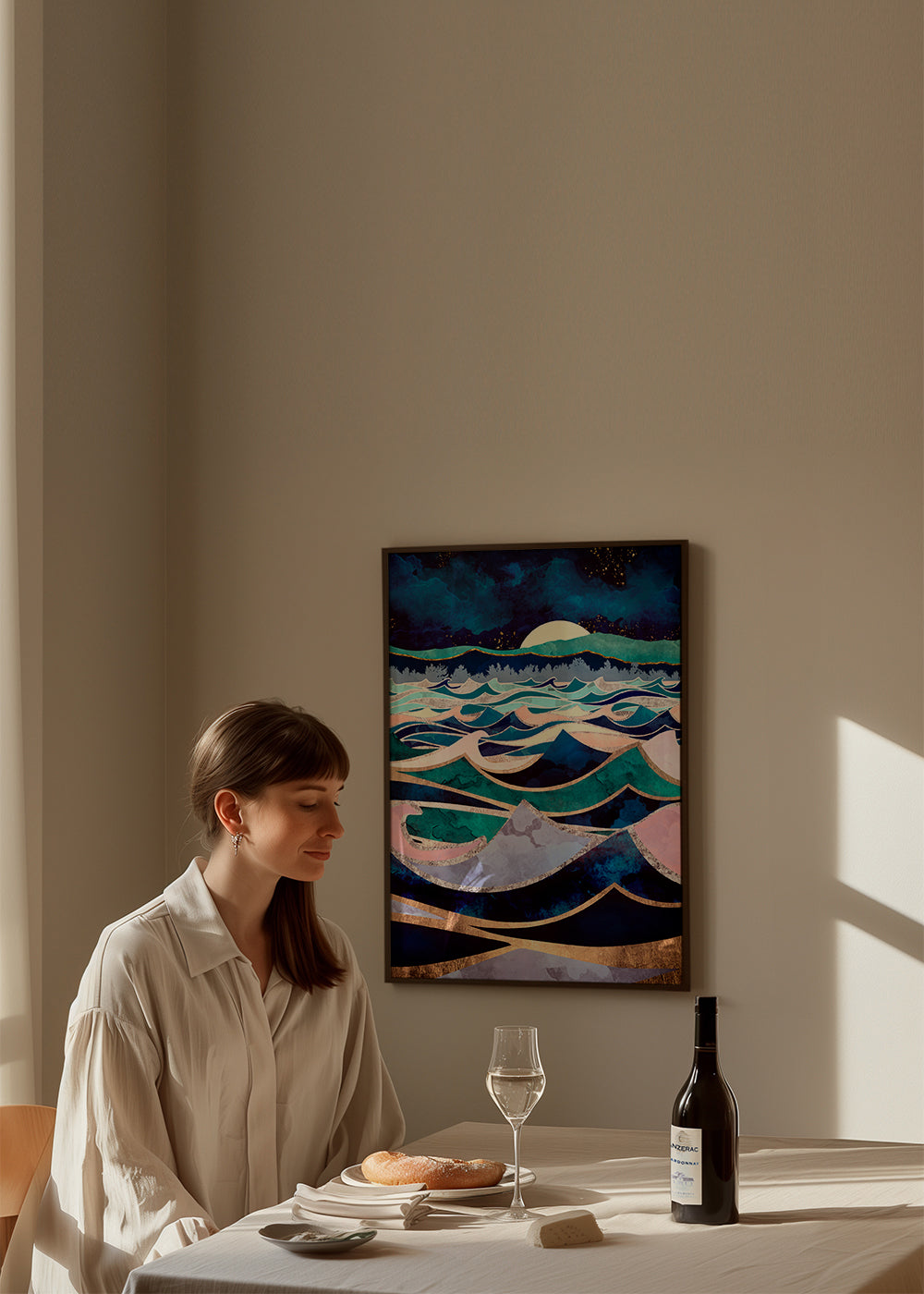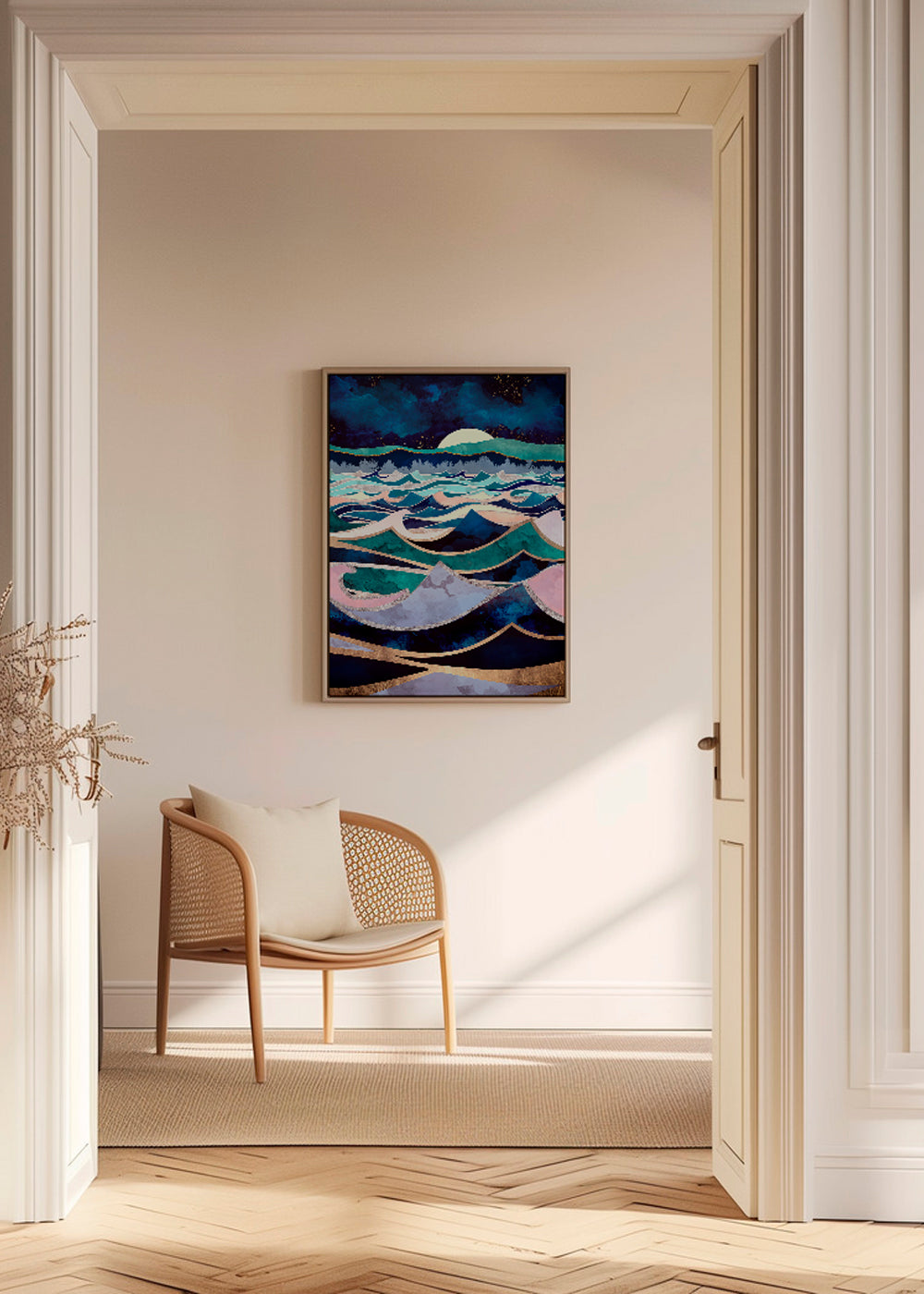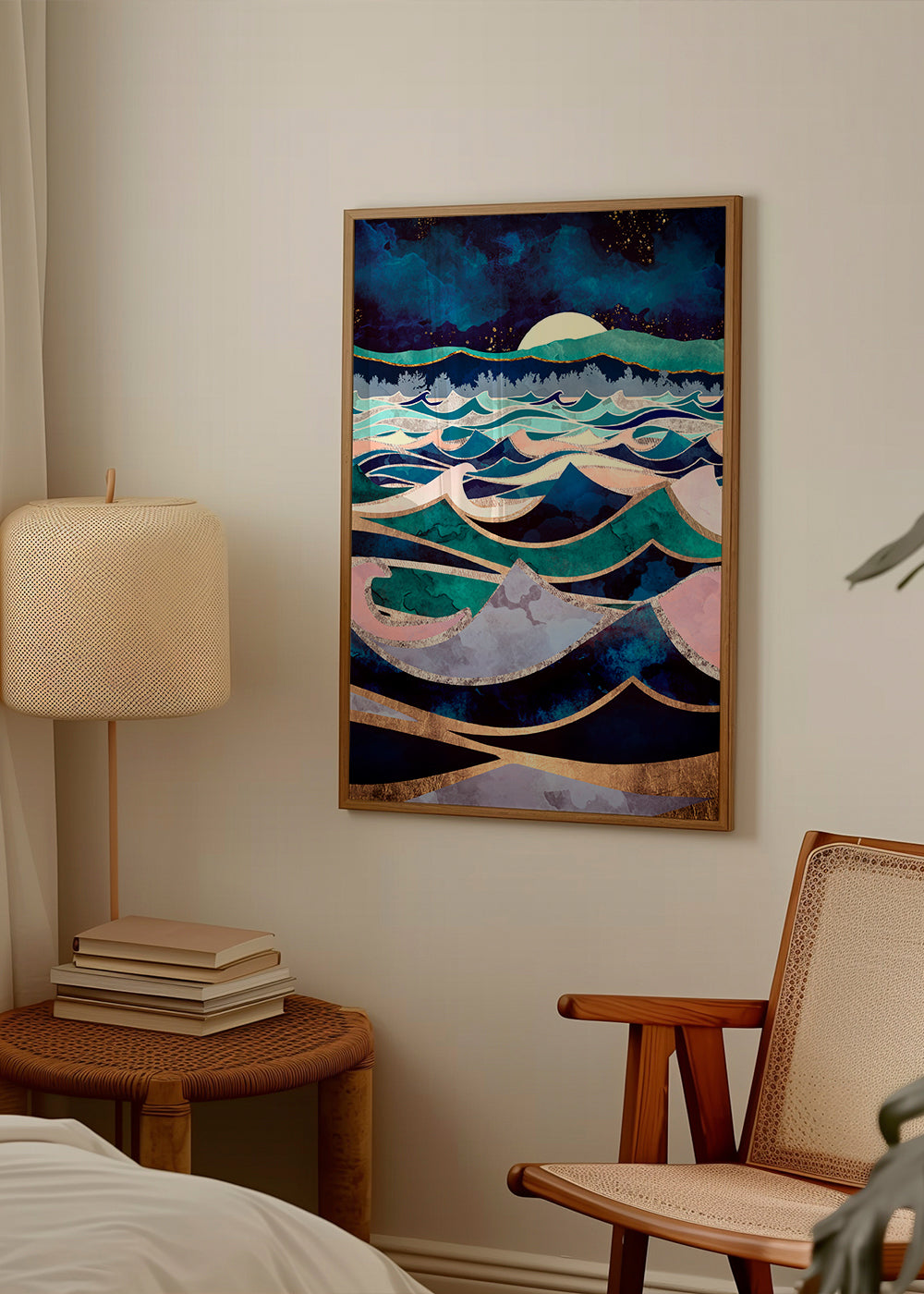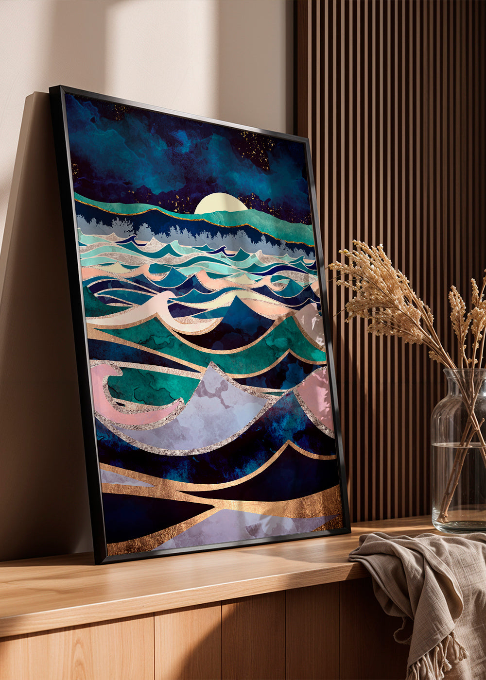 Beautiful poster in the style of our ocean wall art and prints, created by SpaceFrog Designs, in tones of blue, and vertical layout. Nature in all its splendour, landscape prints convey a sense of calm. Choose the size that best fits your decor.