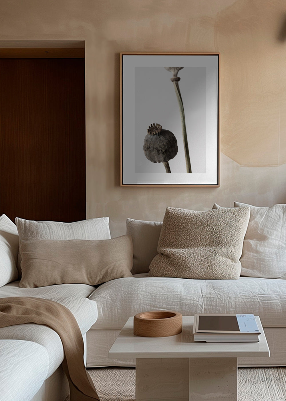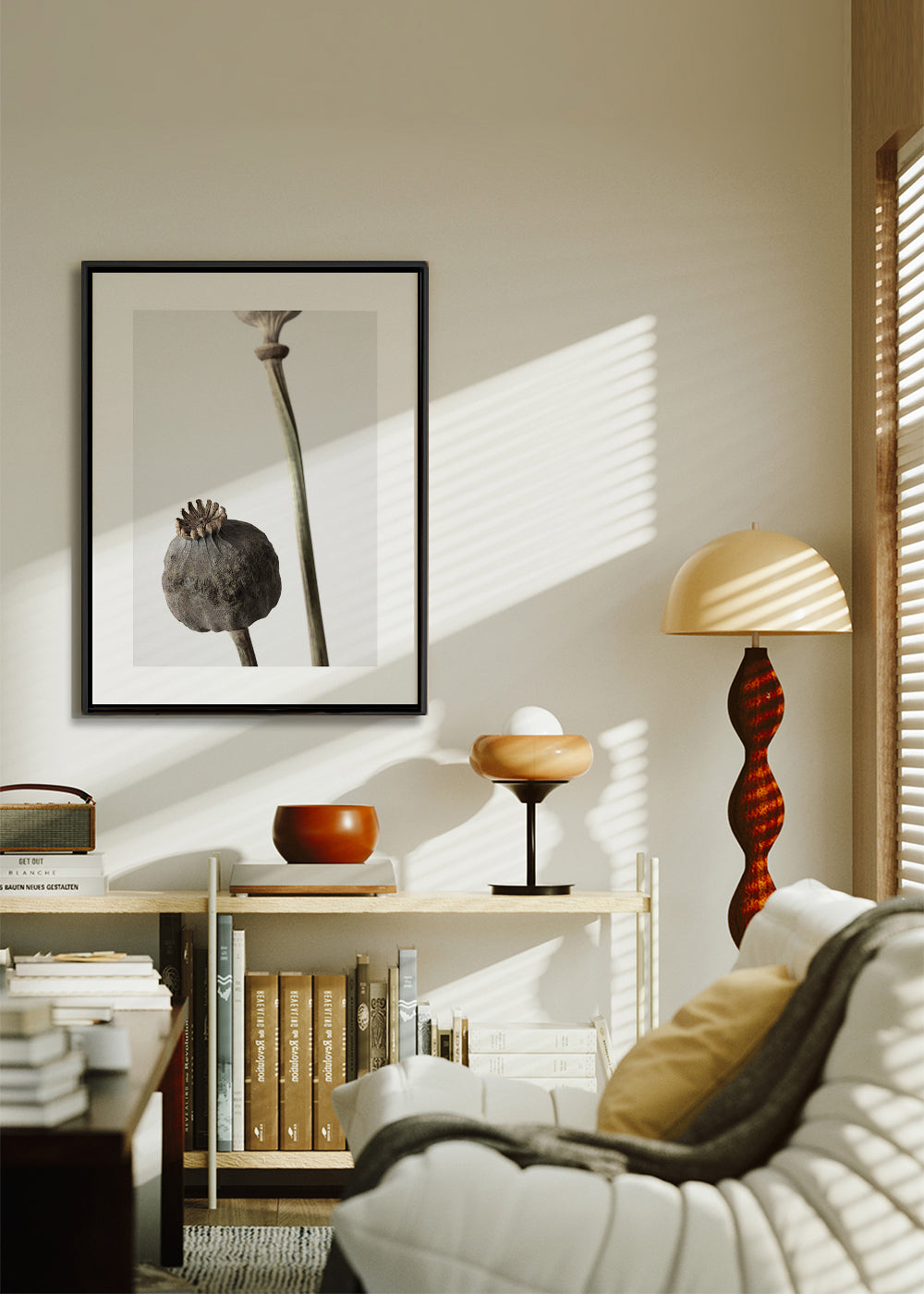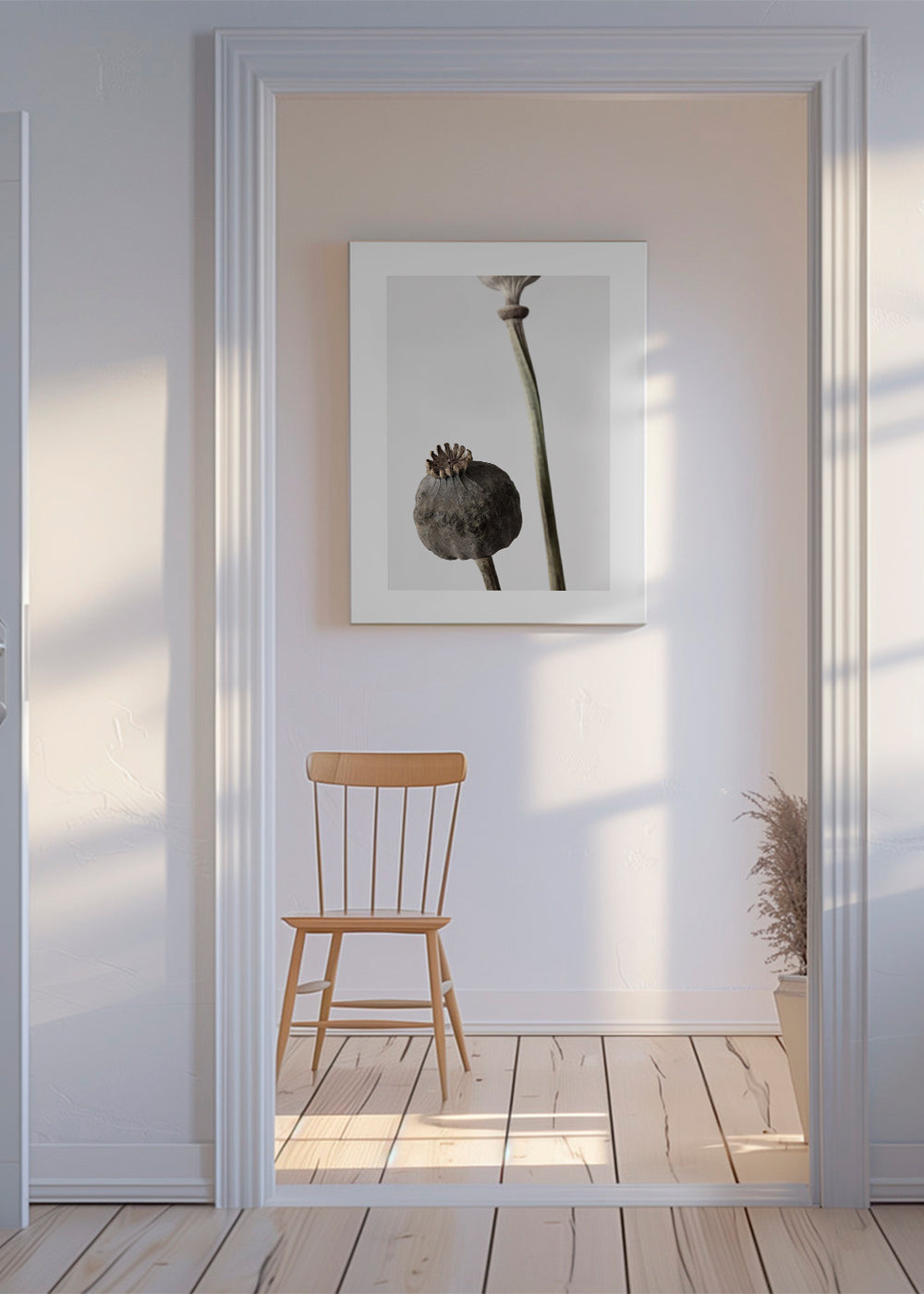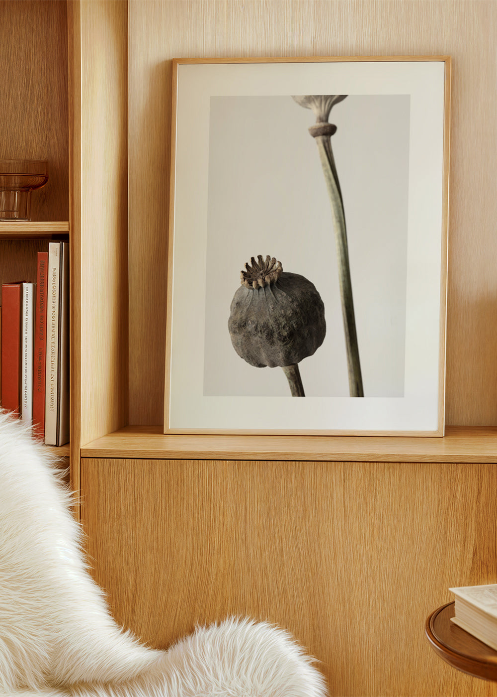 A poster from our botanical prints and wall art collection, with touches of grey, and with vertical layout. Perfect for all sorts of nature-lovers. Prints with flowers and plants bring freshness and life to your walls. An empty wall is a sad wall; but with a few prints, we'll make it smile. This design includes a white strip around it to add contrast to the piece.