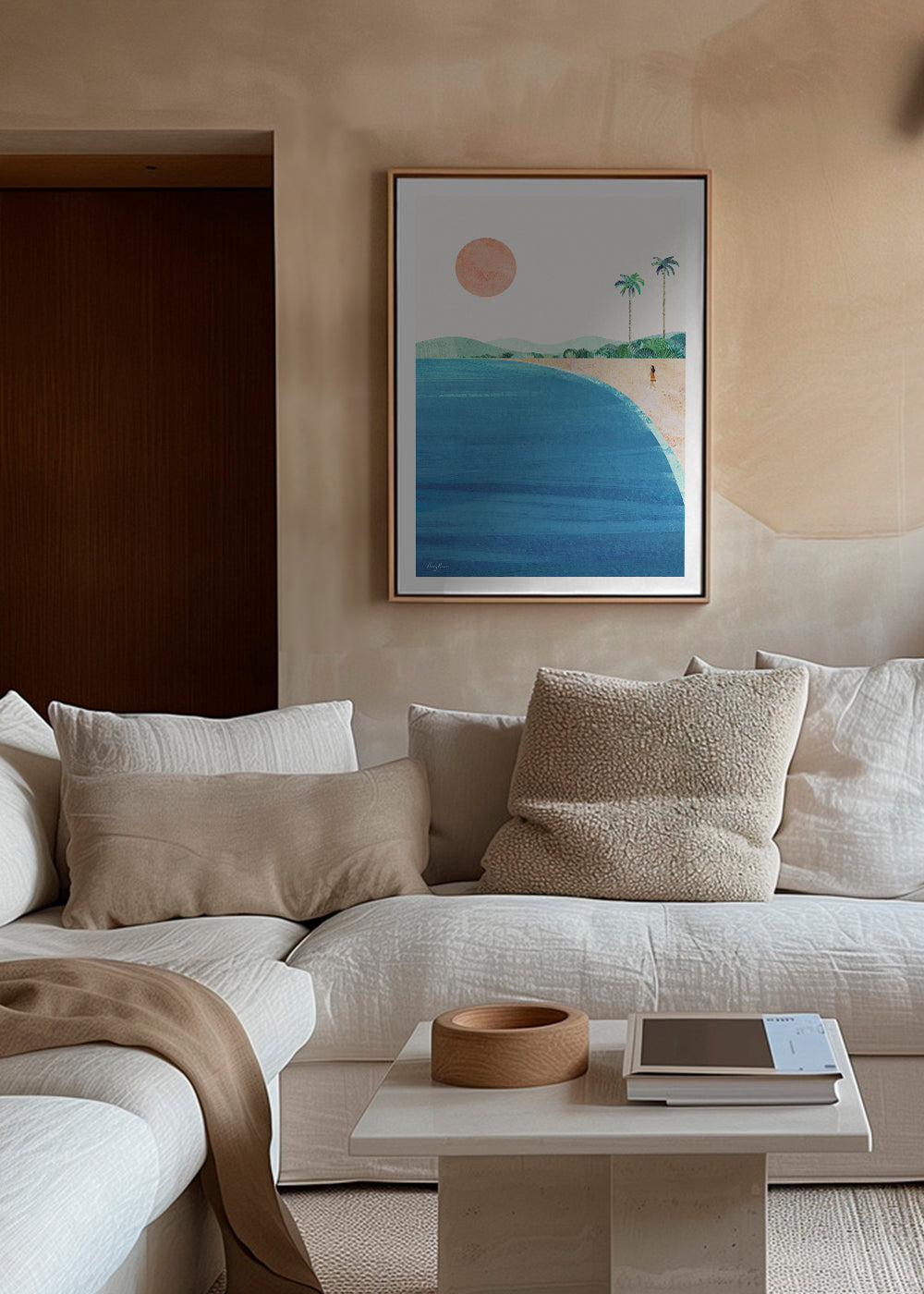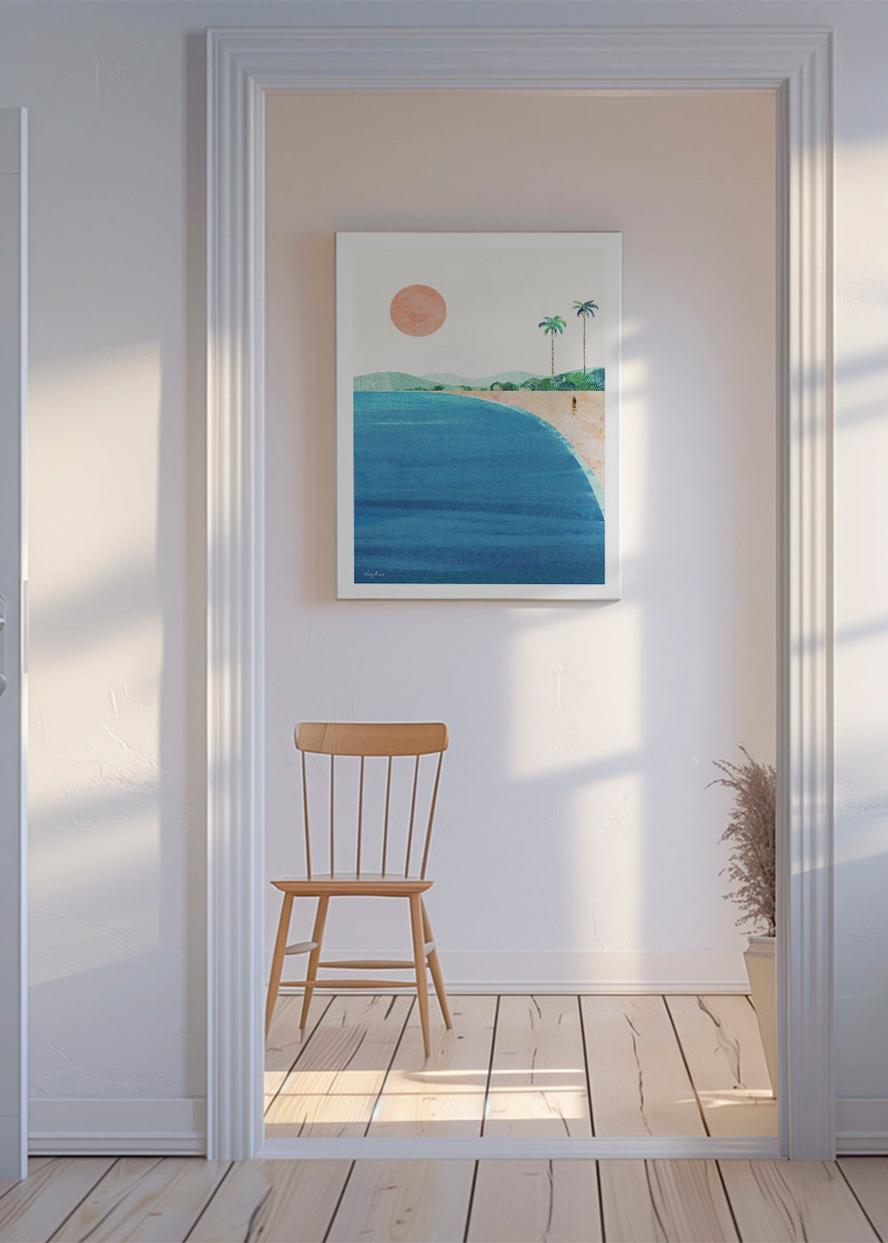 A poster from the ocean wall art and prints series, by Henry Rivers, with blue pigments, and vertical layout. Landscape prints are spectacular; pair them with texts and phrases to create cool wall compositions. Your home decor is in your hands.