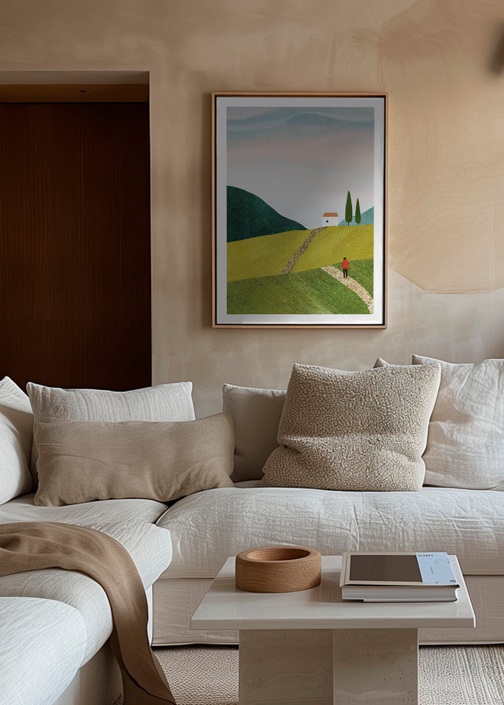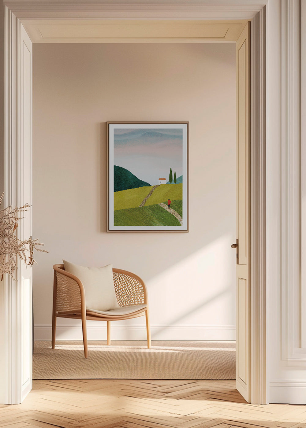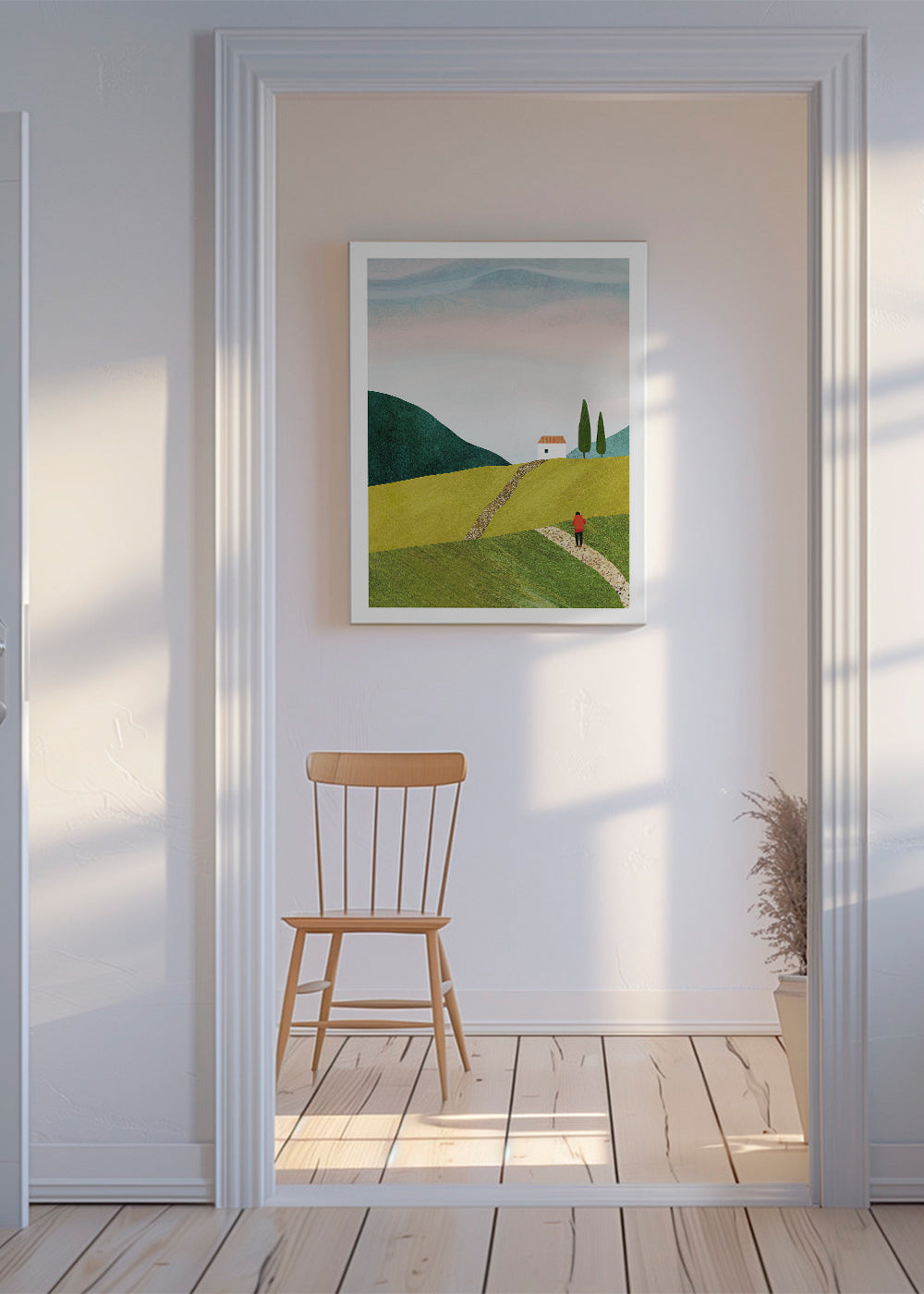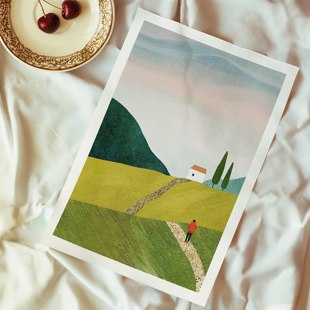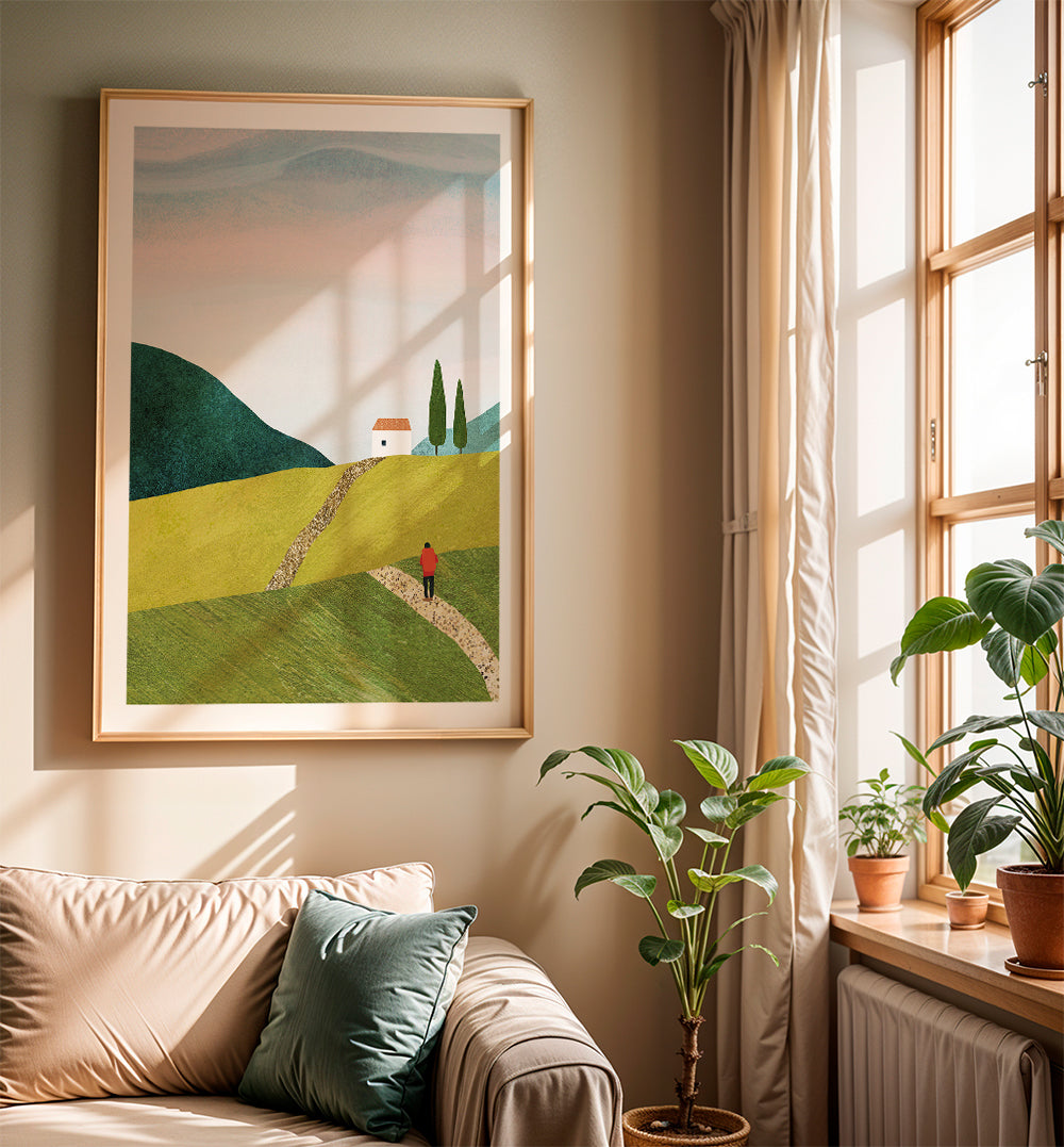 A print from the landscape wall art series, from the mind of Henry Rivers, with touches of red, and vertical layout. A beautiful landscape perfect for pairing with other nature prints. Walls full of creativity.
