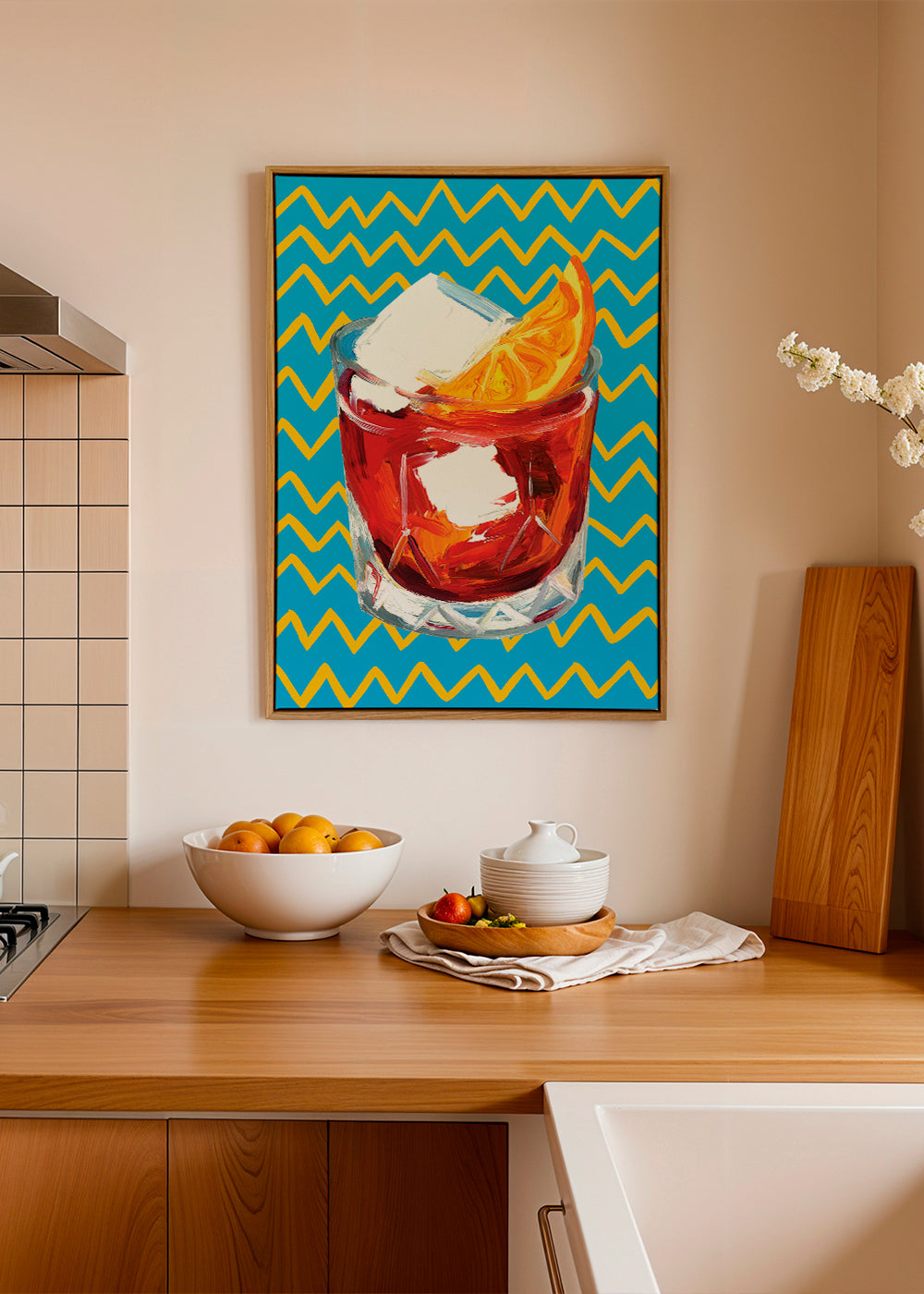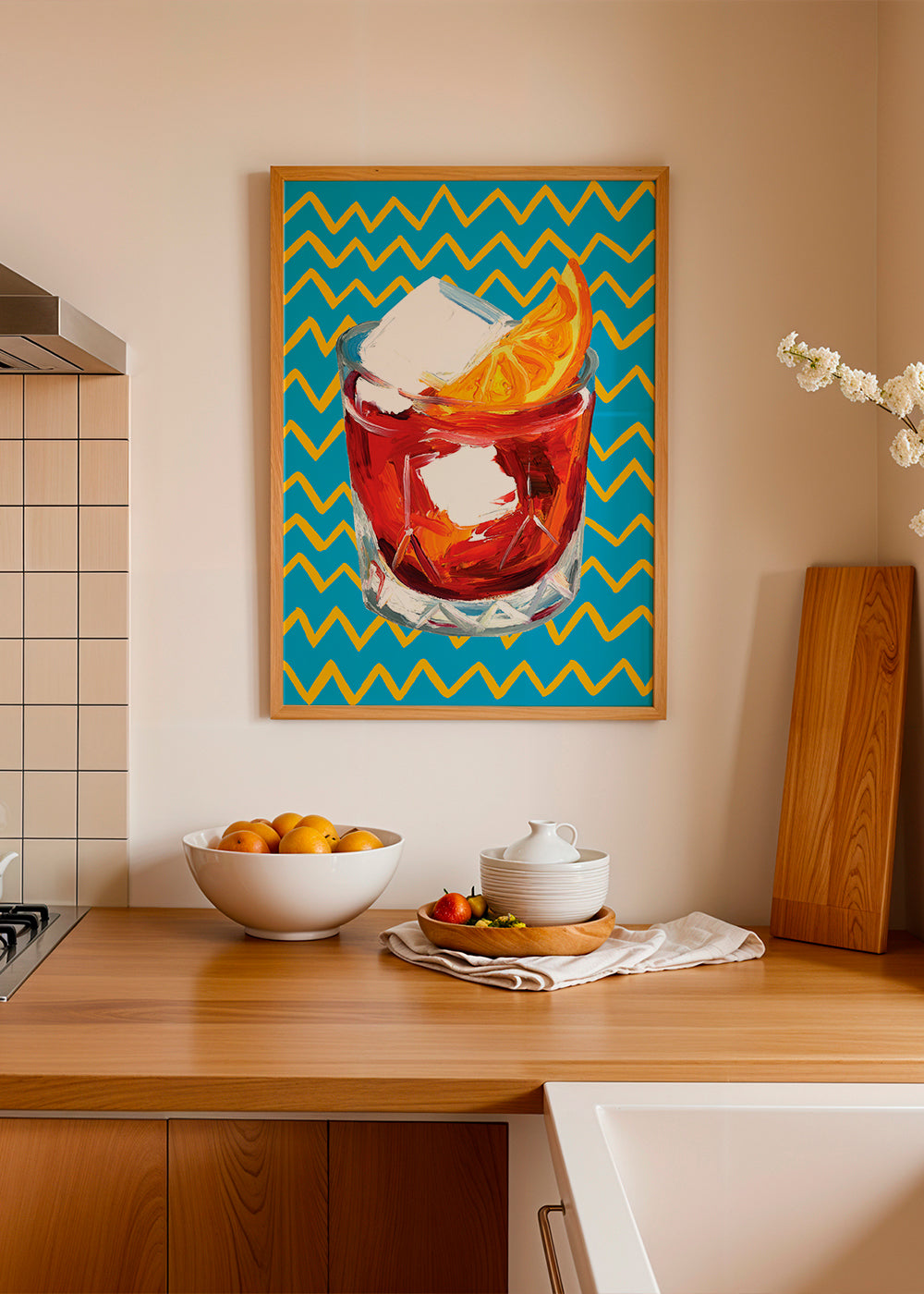 Beautiful print in the style of our cocktail posters, by 1x, with shades of blue, and to hang in vertical position. Illustrated posters are perfect for pairing with minimalist and abstract art. The final touch for your home decor.