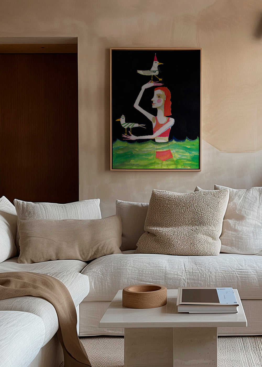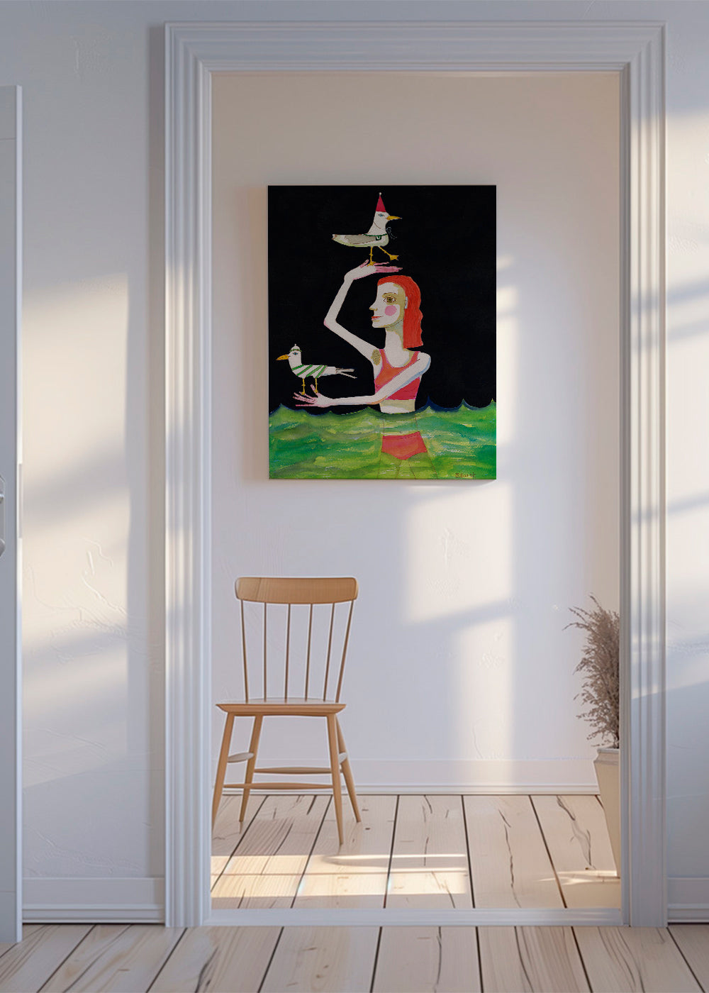 Scandinavian wall art Swimming Lady with birds - Sharyn Bursic