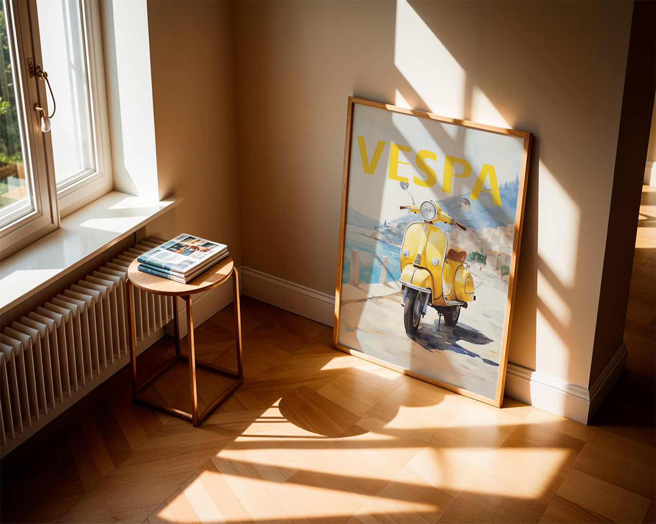 A poster from our selection of motorcycles posters, made by Seven Wall Art, with yellow pigments, and to hang in vertical position. A Nordic-style design for those who want simple, minimalist decoration for their walls. Your home decor is in your hands.