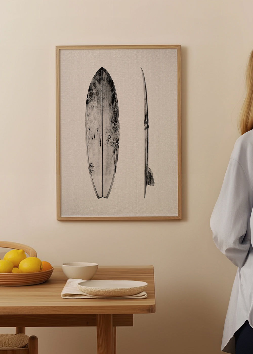 Beautiful poster from our repertoire of surf posters and wall art, from the Gal Design collection, with black and white pigments, and in vertical position. Photography is an art form that can change any decoration. Adding photo prints to your interior design modernises any room. Build a home full of design and creativity.