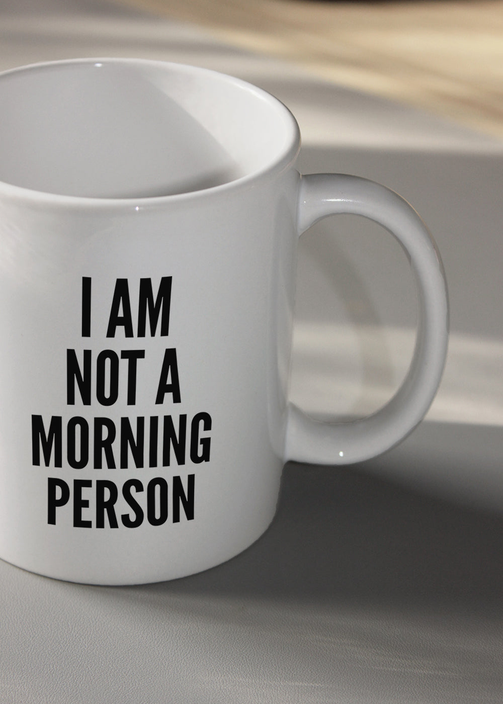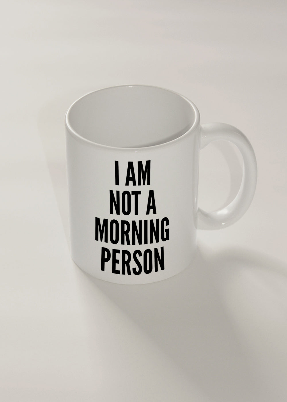 Taza blanca de cerámica de 325 ml con un diseño del artista Studio Mottos. Nunca tomarte el café a primera hora de la mañana, sentó tan bien.